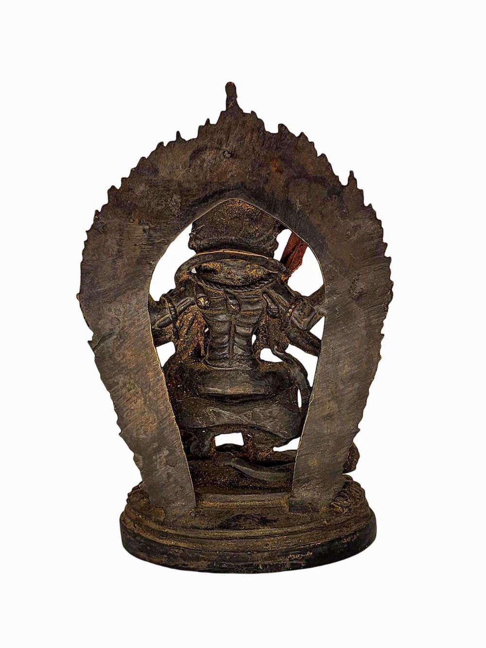 This Bhadrakali statue features a chocolate antique patina, developed through a controlled artificial oxidation process. The patina is designed to replicate the natural aging of copper over many decades, producing a warm, rich tone with subtle variations that mimic authentic antique surfaces.
