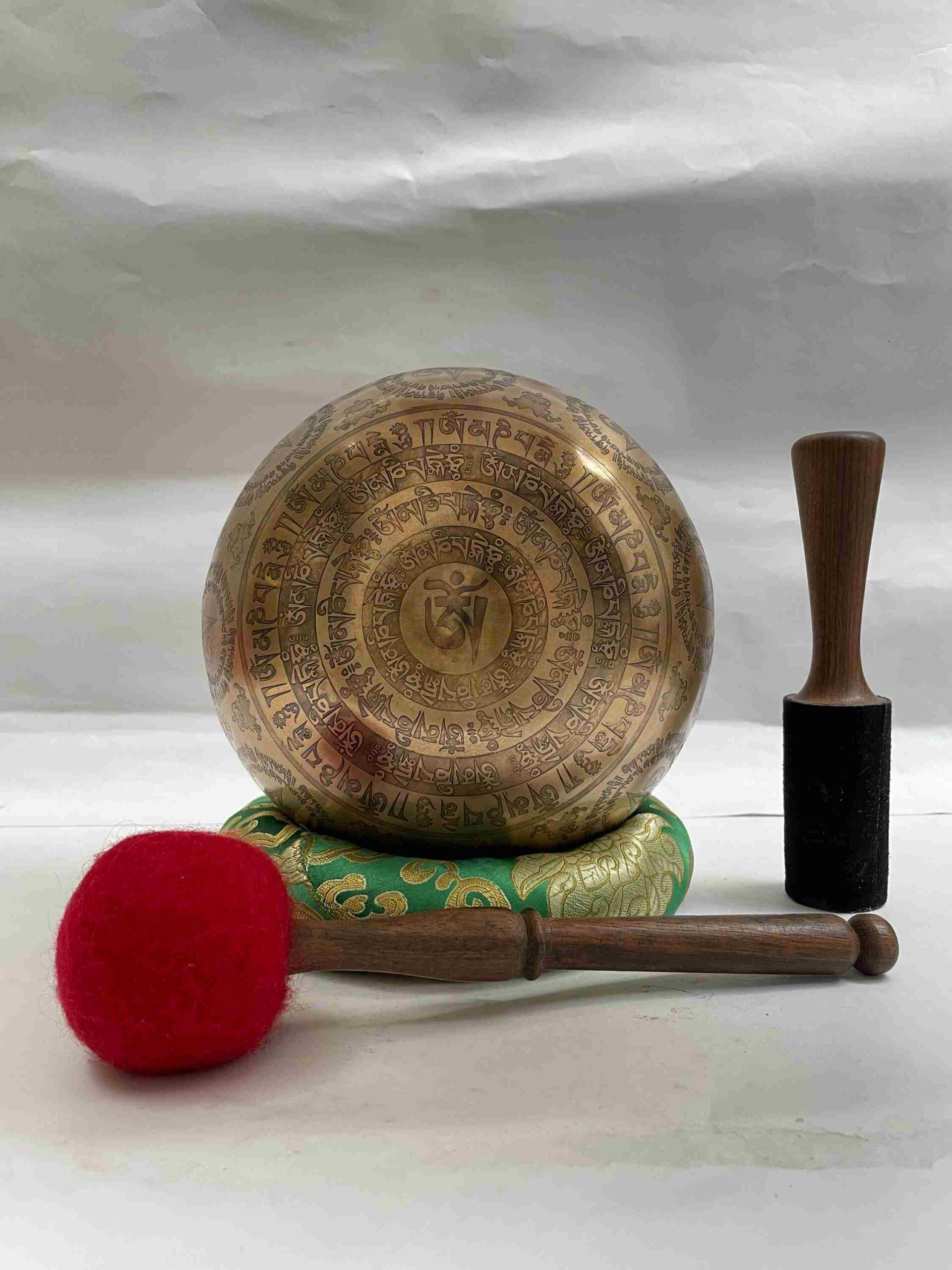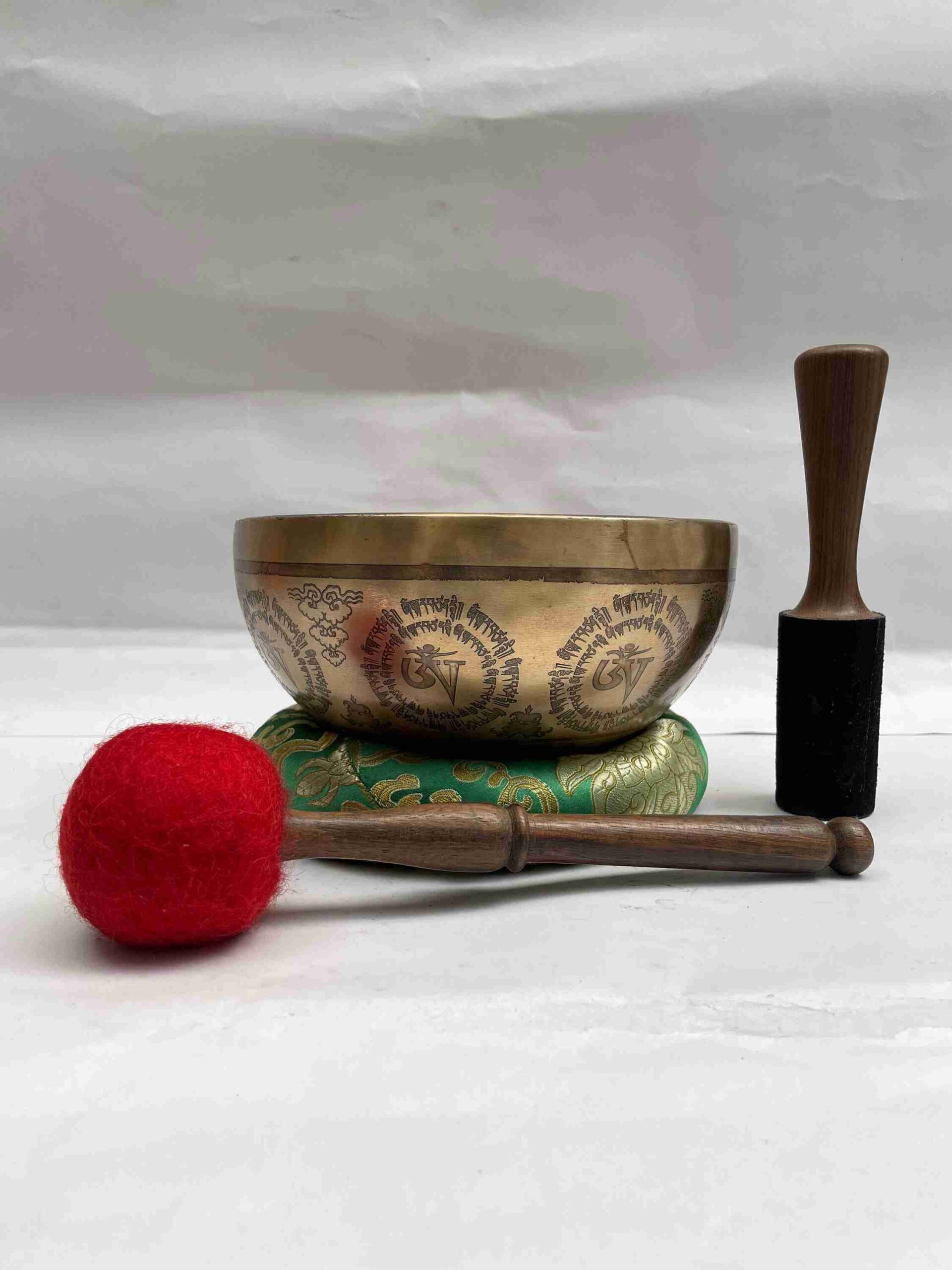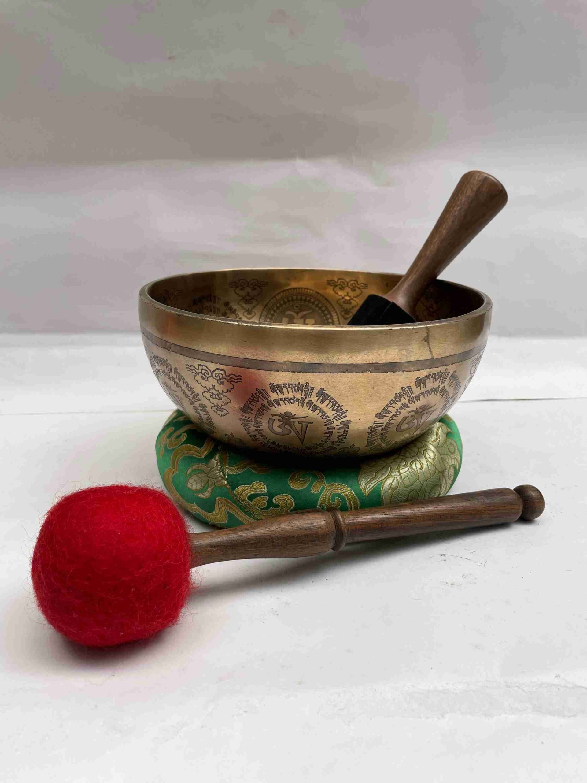 This handcrafted singing bowl features a high-quality, fine-line etching technique. Unlike standard etched designs, which often have thicker, less detailed lines, our bowls are adorned by a skilled Thangka artist, ensuring precision and intricacy. Each symbol and motif is carefully drawn, making this bowl a true work of spiritual art.