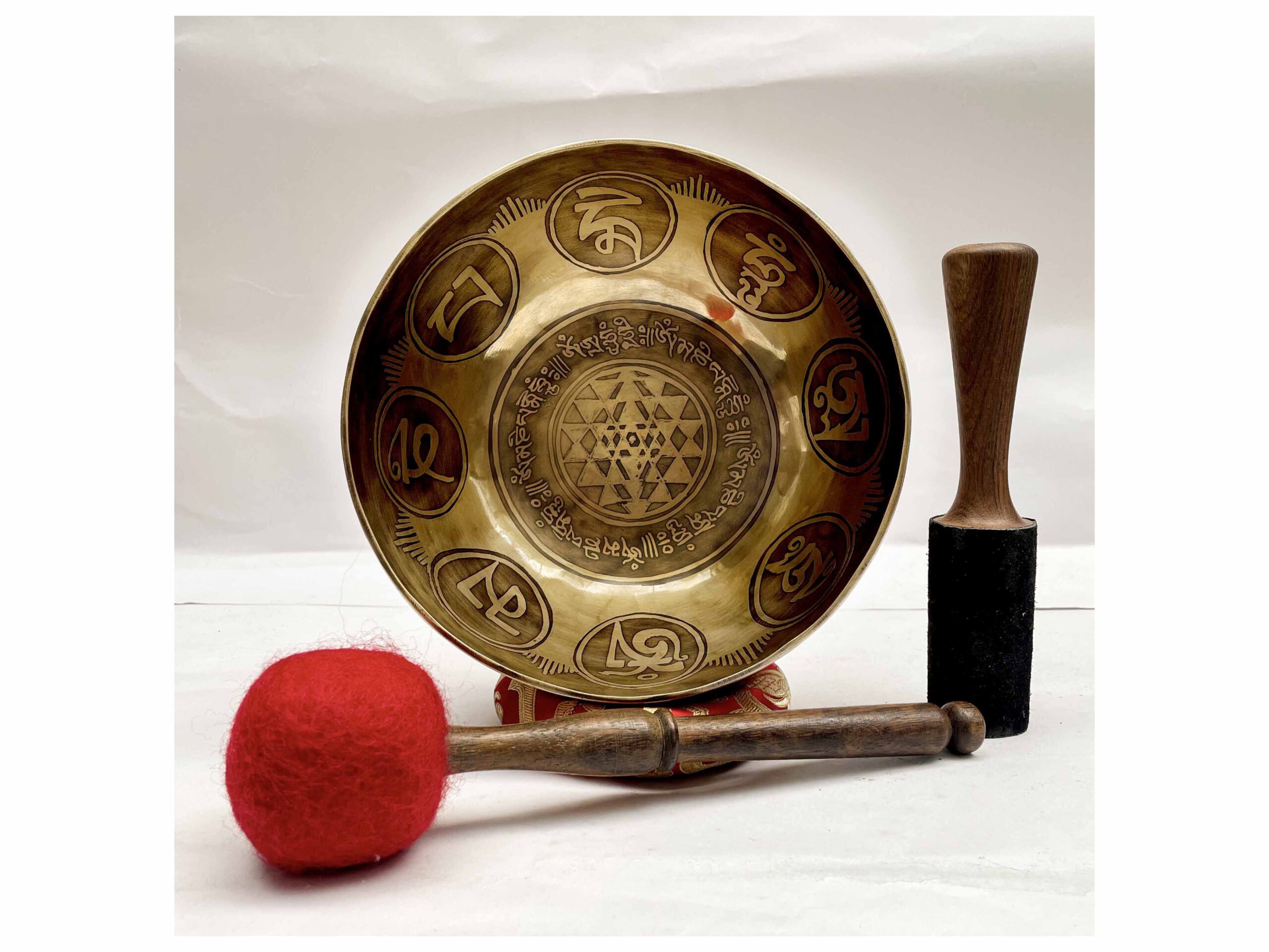 Buddhist Hand-Beaten Jambati Singing Bowl – Yantra Design with Carving