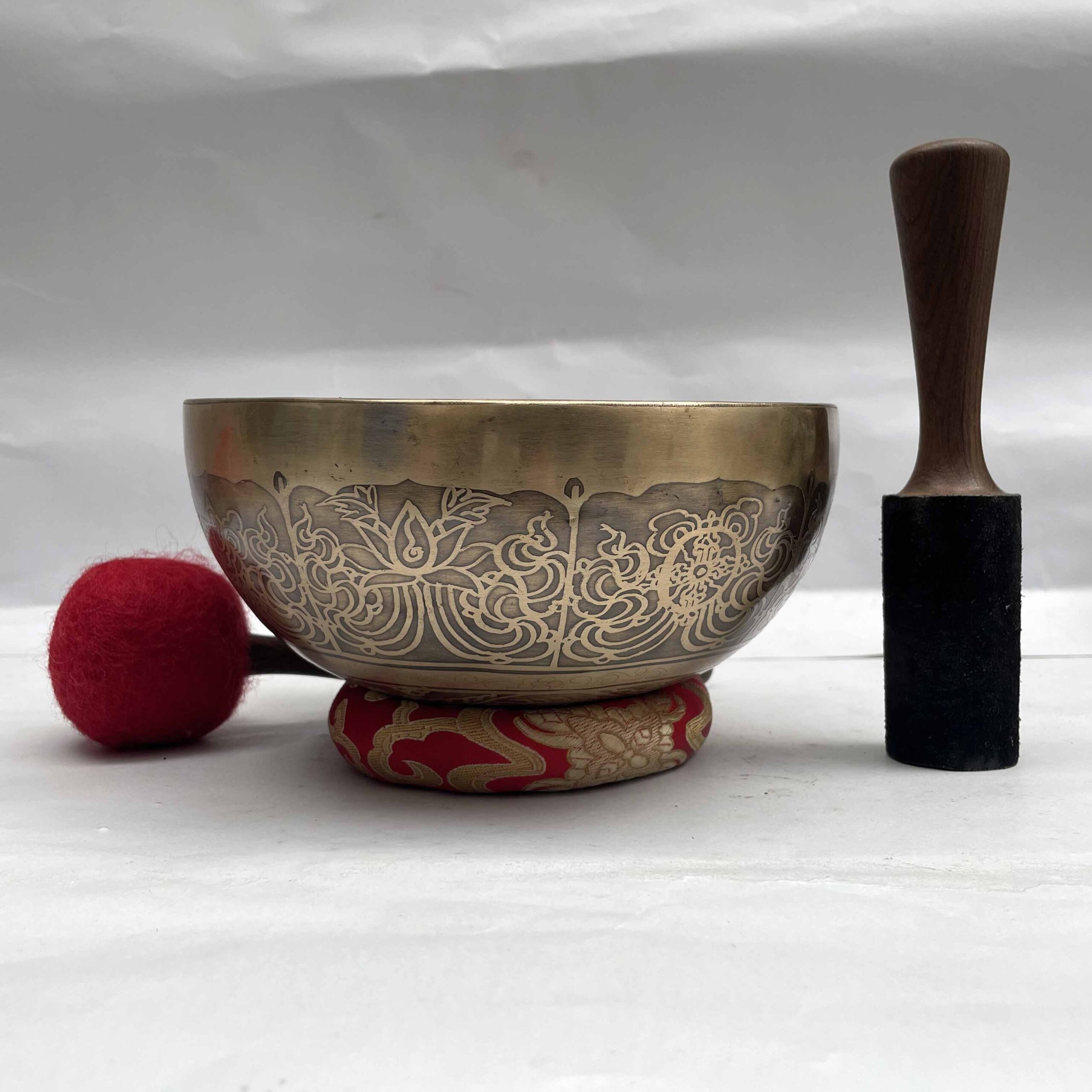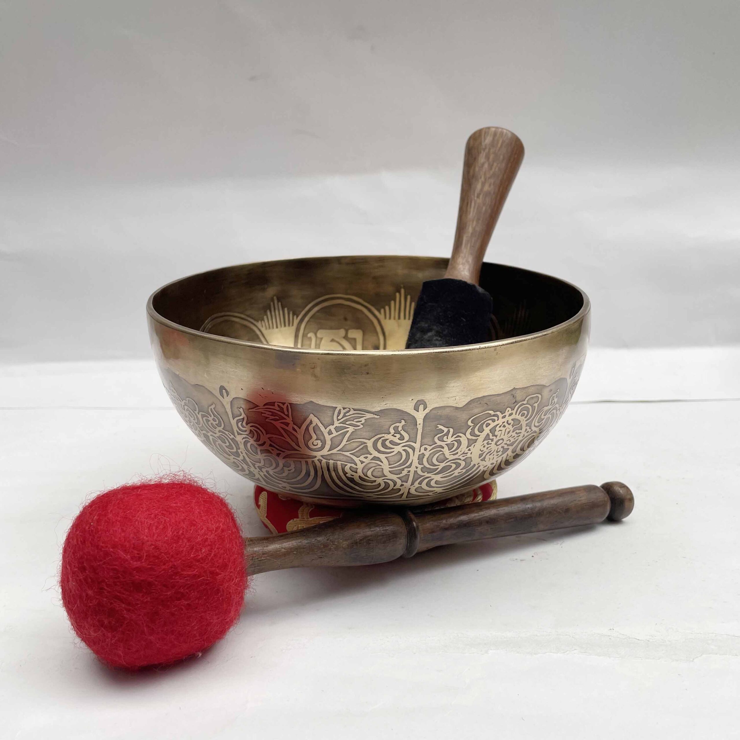 This handmade singing bowl features high-quality etching and carving. Unlike standard carvings with broader strokes, we have commissioned a fine artist trained in Thangka painting to create detailed, intricate lines.