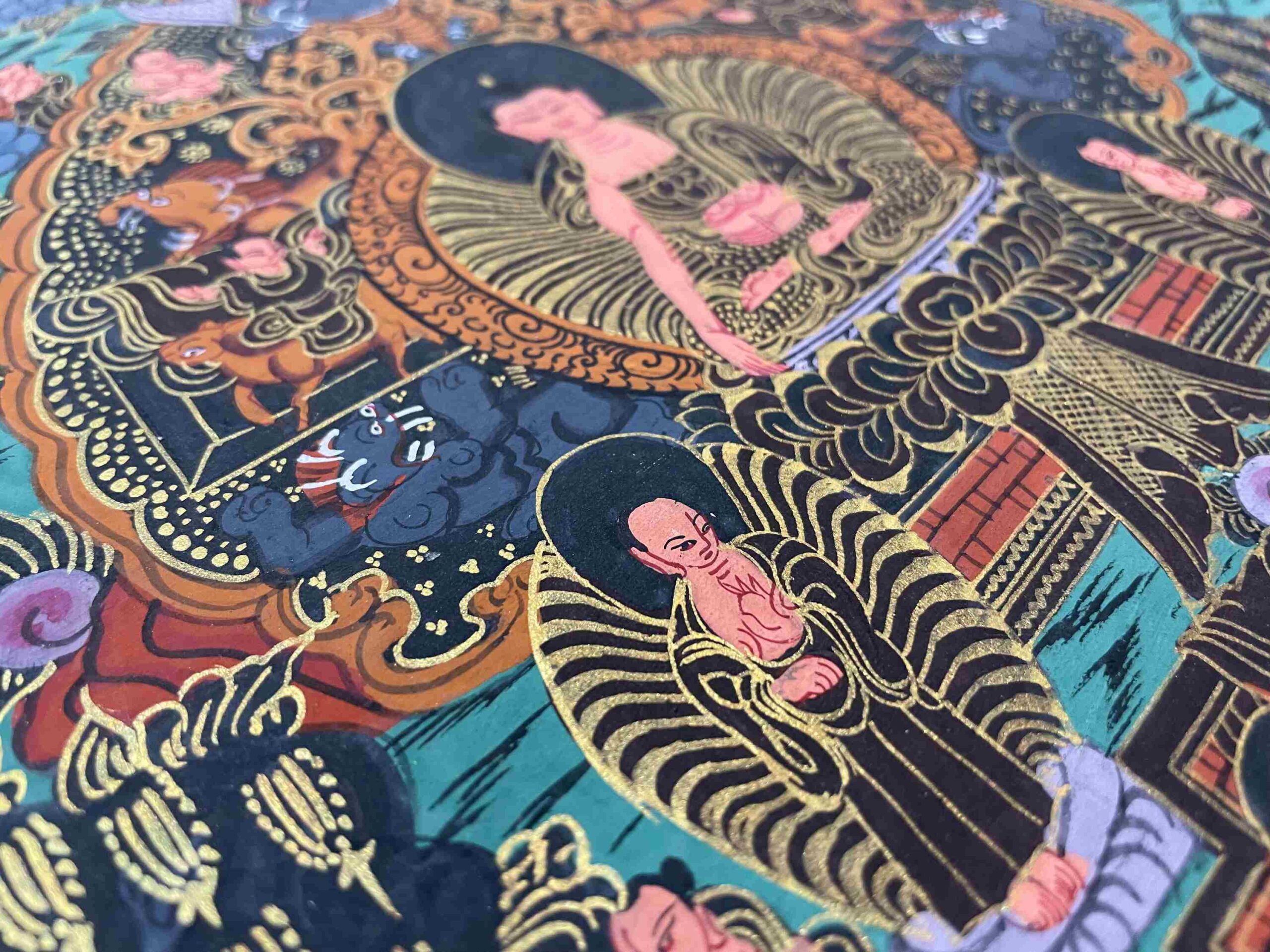 This exquisitely hand-painted Buddha Life Story Thangka narrates the sacred journey of Gautama Buddha, from his miraculous birth in Lumbini to his path of enlightenment and ultimate teaching of Dharma. Each visual element in the thangka illustrates pivotal moments in his spiritual evolution—from prince to “Sakyamuni”, the awakened sage of the Sakyas. These depictions not only offer aesthetic beauty but also serve as profound teachings of compassion, mindfulness, and liberation.