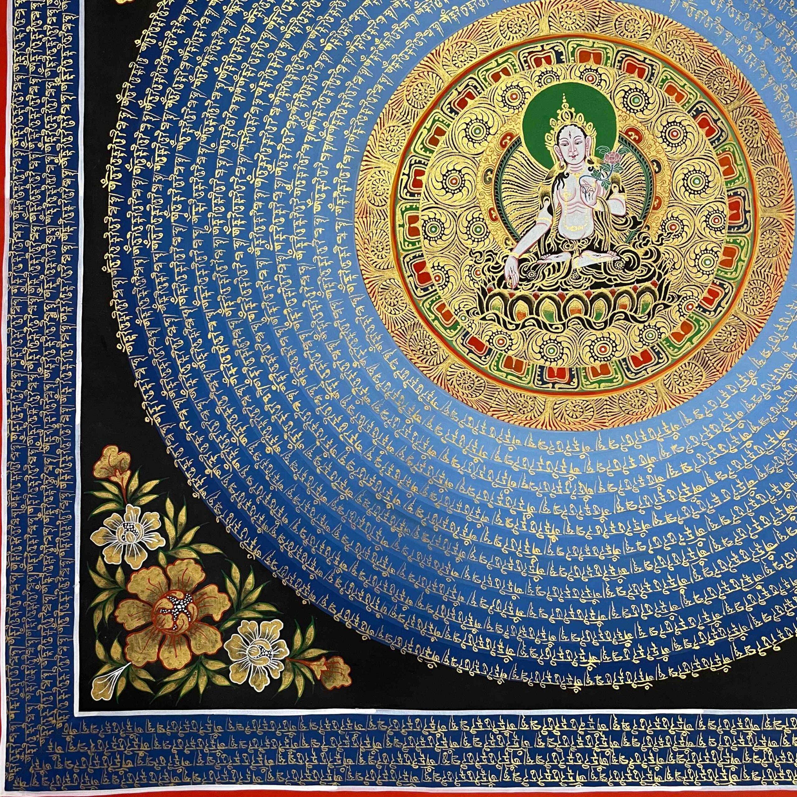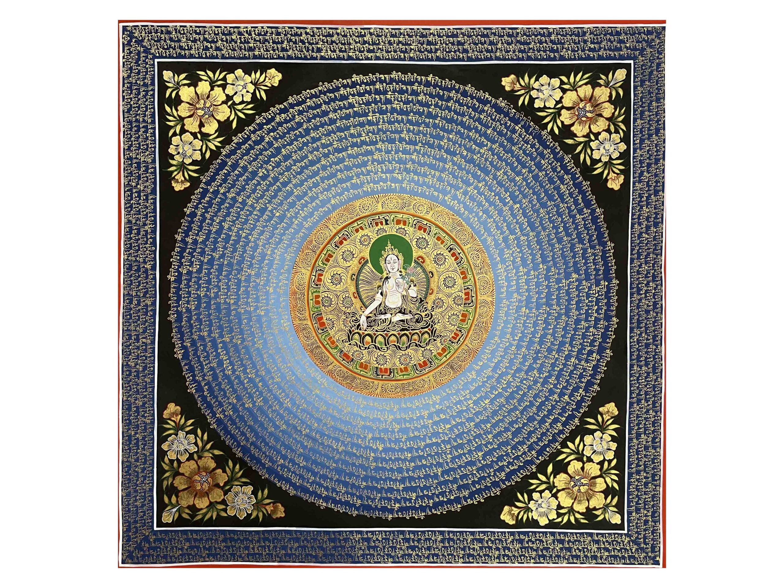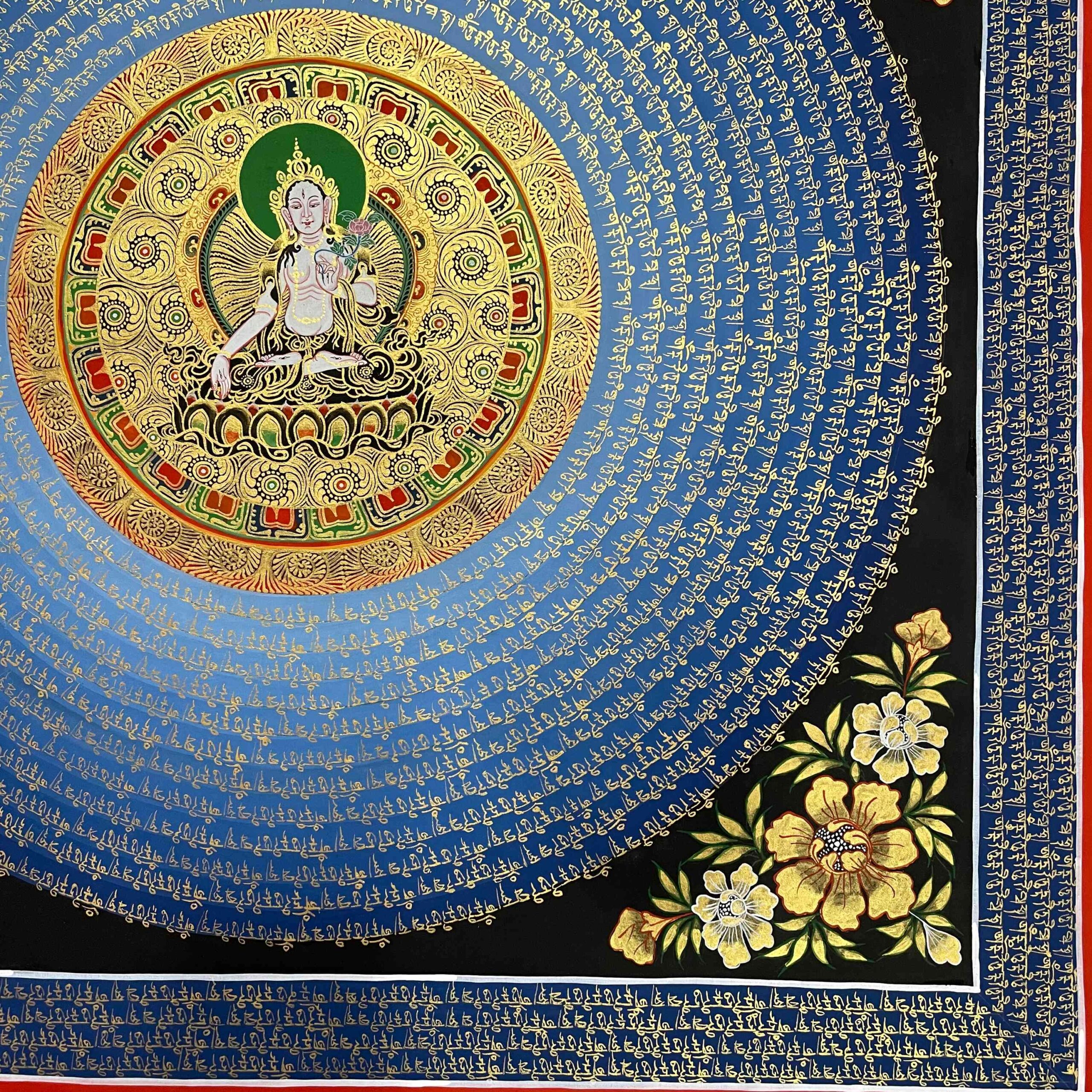 Buddhist Hand-Painted Mantra Mandala Thangka with White Tara at the Center