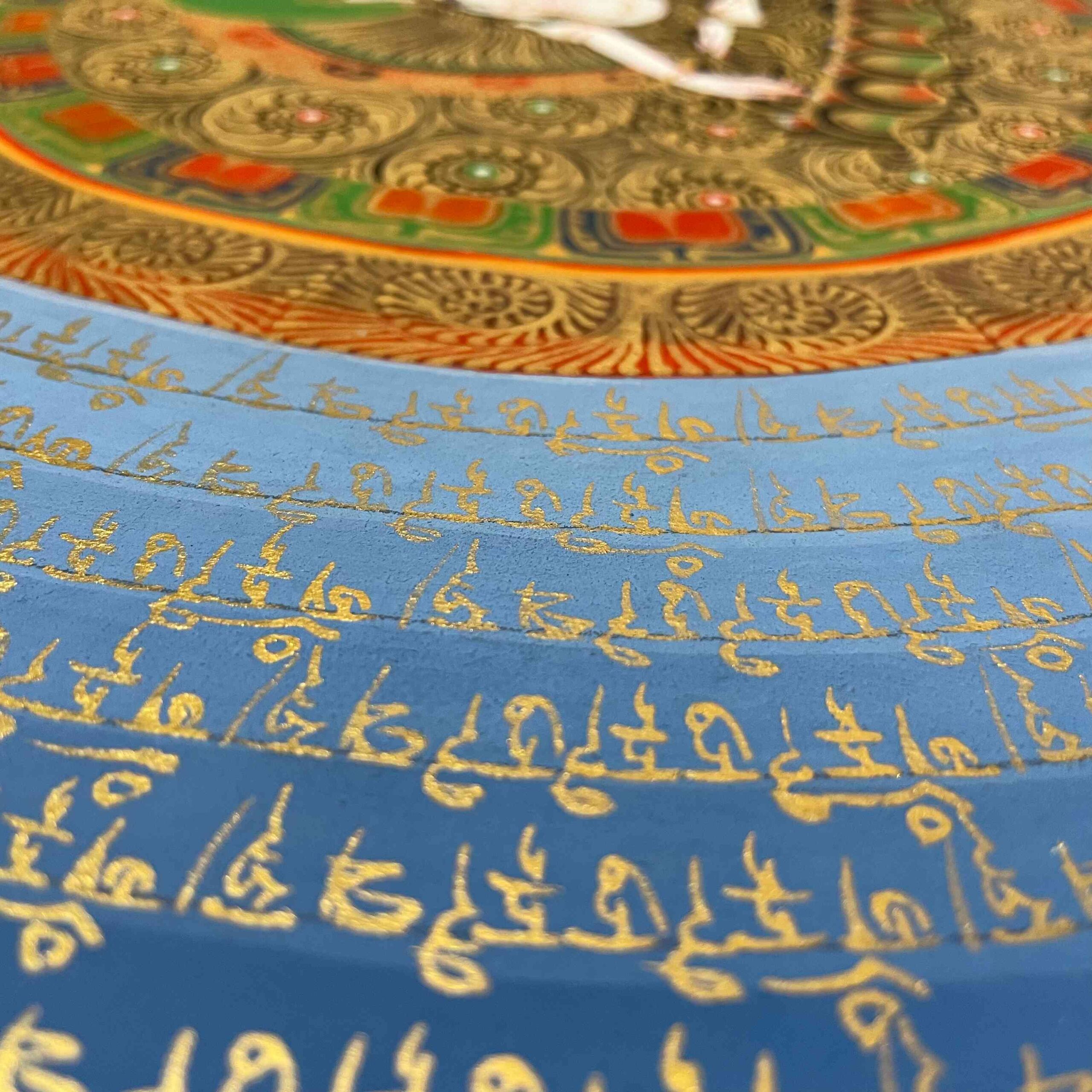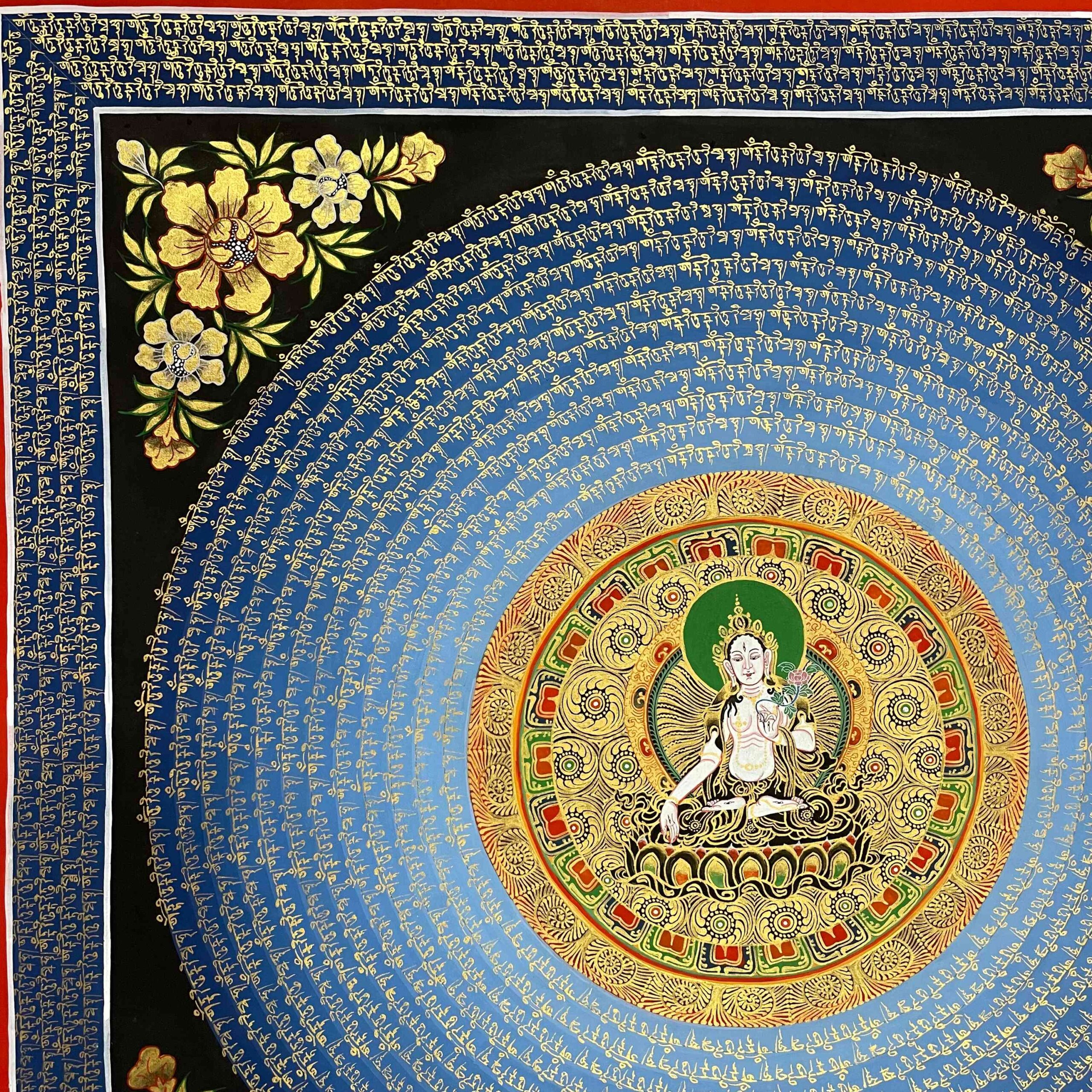 This intricate Mantra Mandala Thangka showcases the sacred Buddhist mantra OM MANI PADME HUM, associated with Avalokitesvara (Chenrezig). The mantra is believed to protect from suffering, purify negative karma, and promote compassion. It is widely found in the Himalayas, carved into stones and prayer wheels, and integrated into Buddhist rituals and visual arts. This six-syllable mantra represents the path to enlightenment and is central to Mahayana Buddhist practice.