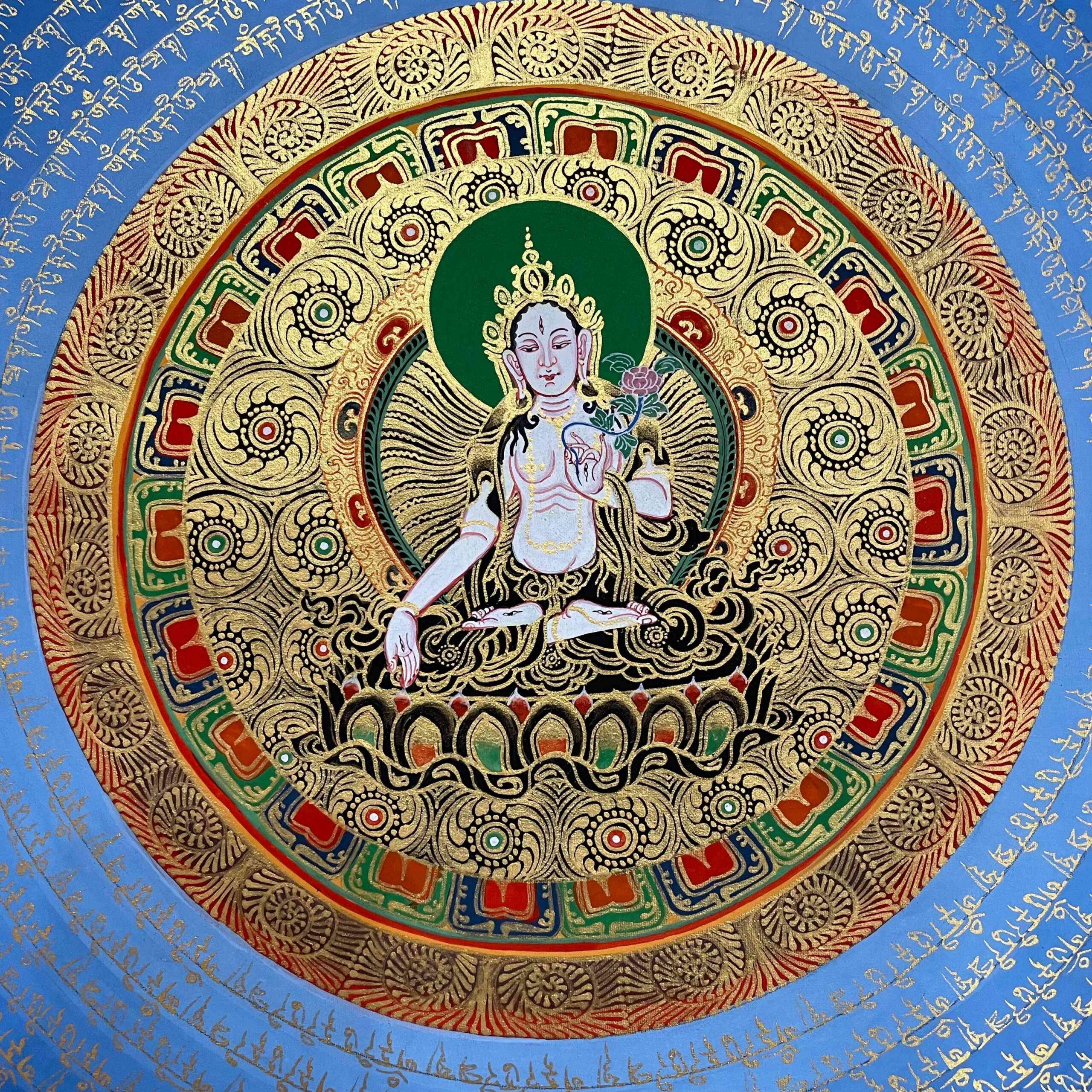 At the center of this sacred mandala sits White Tara, the embodiment of divine compassion, serenity, and long life. A beloved deity in Vajrayana Buddhism, White Tara is revered for her healing energy, wisdom, and nurturing qualities. She symbolizes the Four Measureless States: loving-kindness, compassion, empathetic joy, and equanimity.