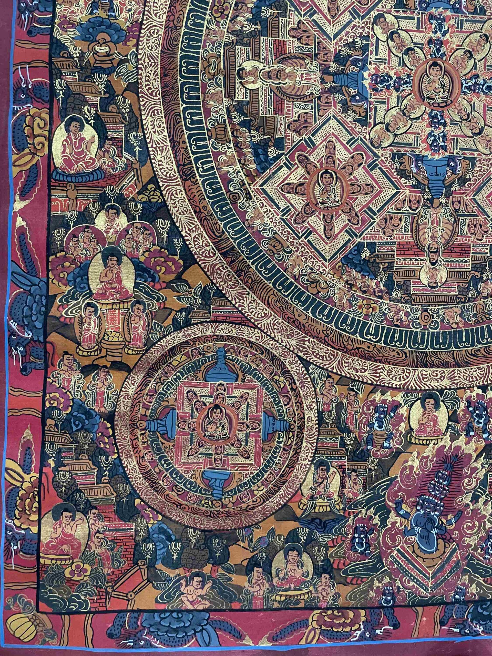 A mandala is a symmetrical, geometric design used in Buddhist practice as a sacred space for meditation and reflection. In this thangka, the Pancha Buddhas are positioned with precision, each surrounded by intricate patterns and spiritual motifs that reflect the cosmic structure of enlightenment. Through detailed brushwork and profound symbolism, mandala thangkas guide viewers inward on a path toward inner peace, focus, and self-realization.