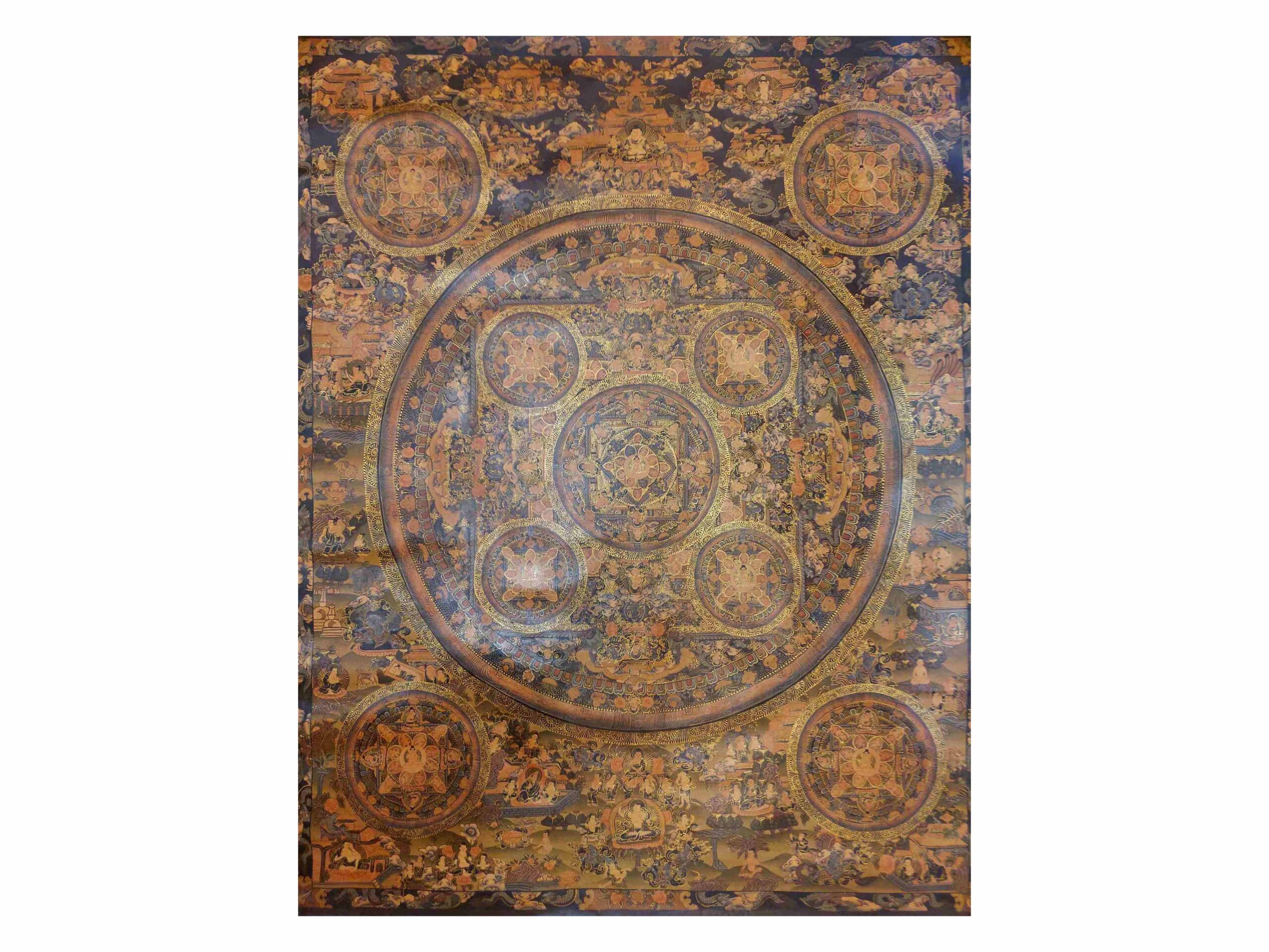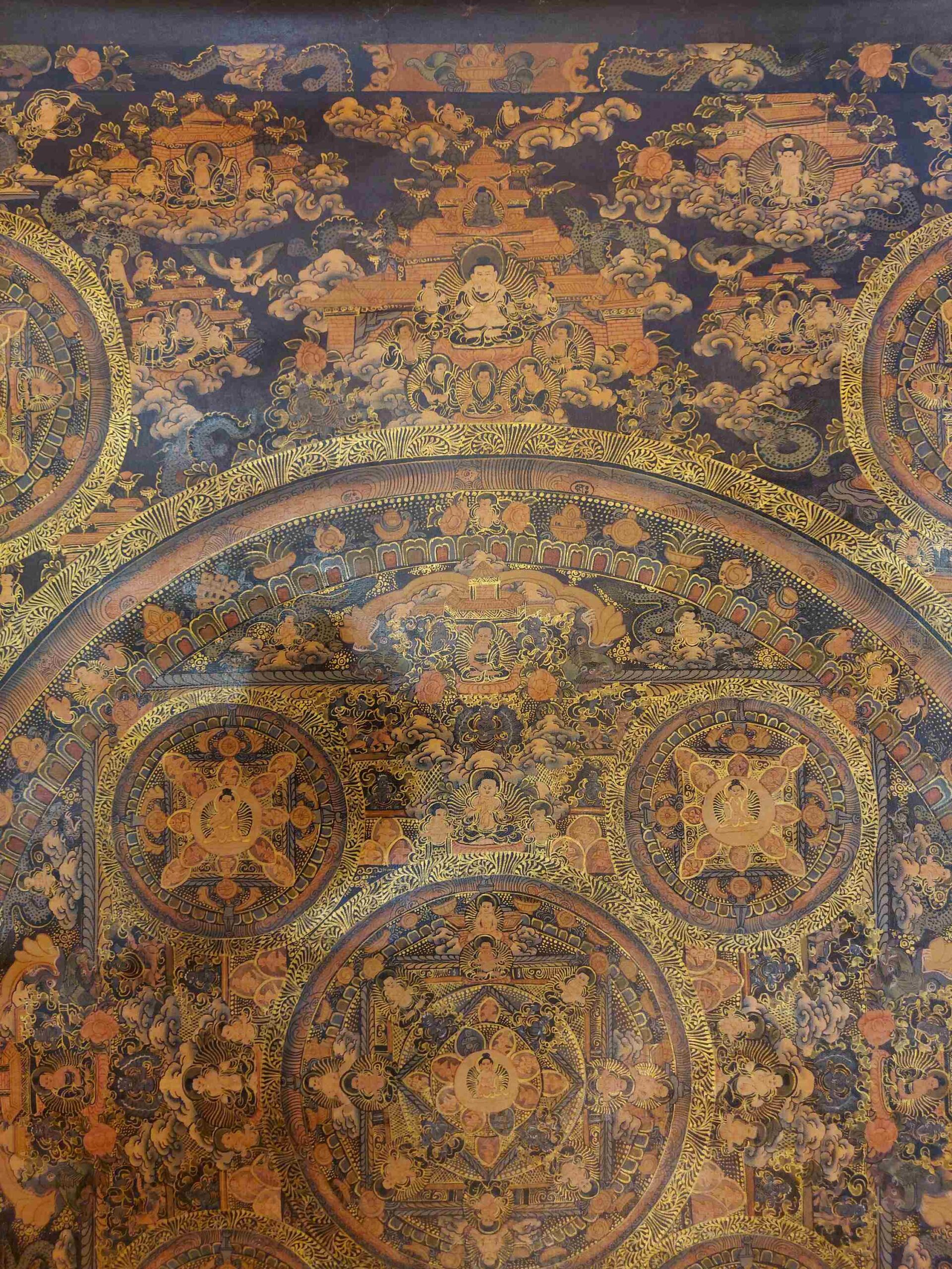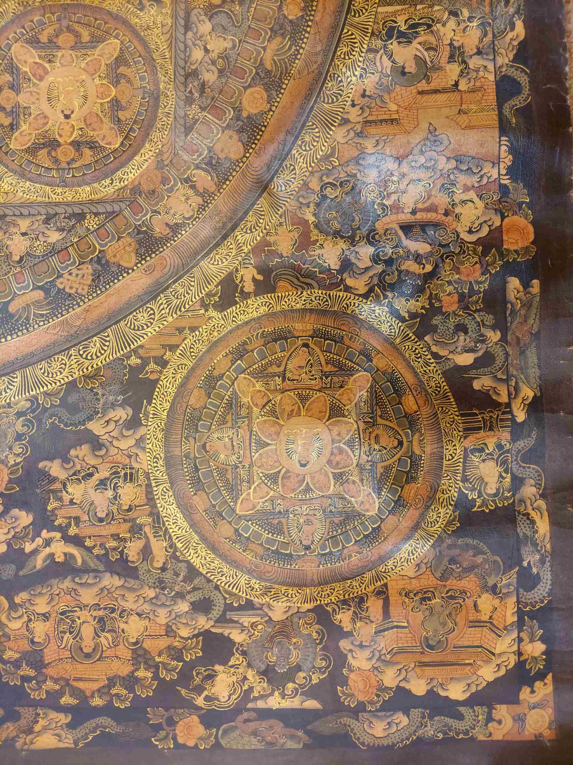 At the heart of the painting lies a central deity or Buddha, surrounded by concentric patterns and geometric structures. Each element is meticulously placed to reflect the cosmic order, spiritual harmony, and the journey inward toward self-realization. Traditionally used as an aid for meditation and ritual, the mandala supports practitioners in cultivating focus, inner peace, and higher awareness.