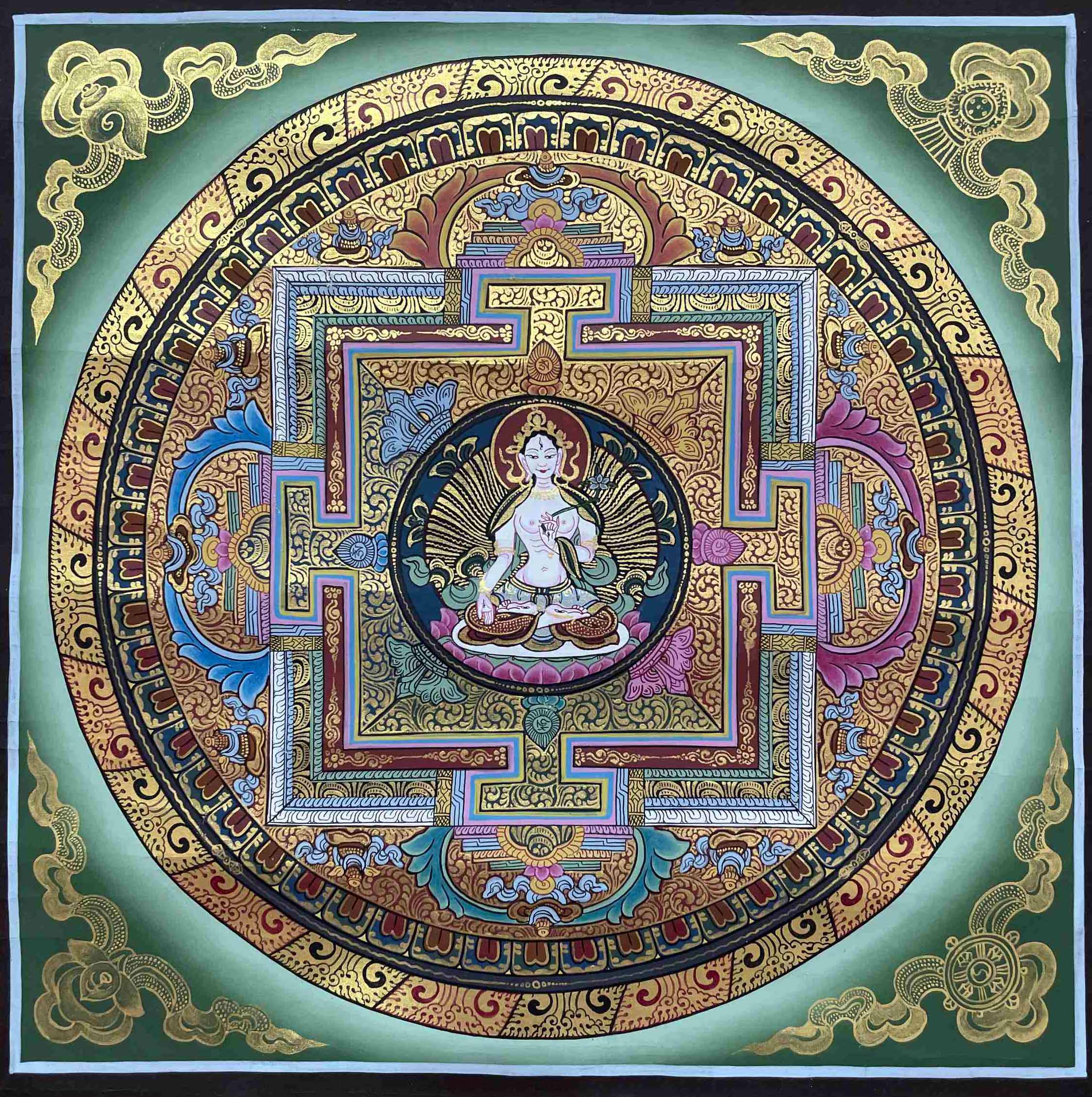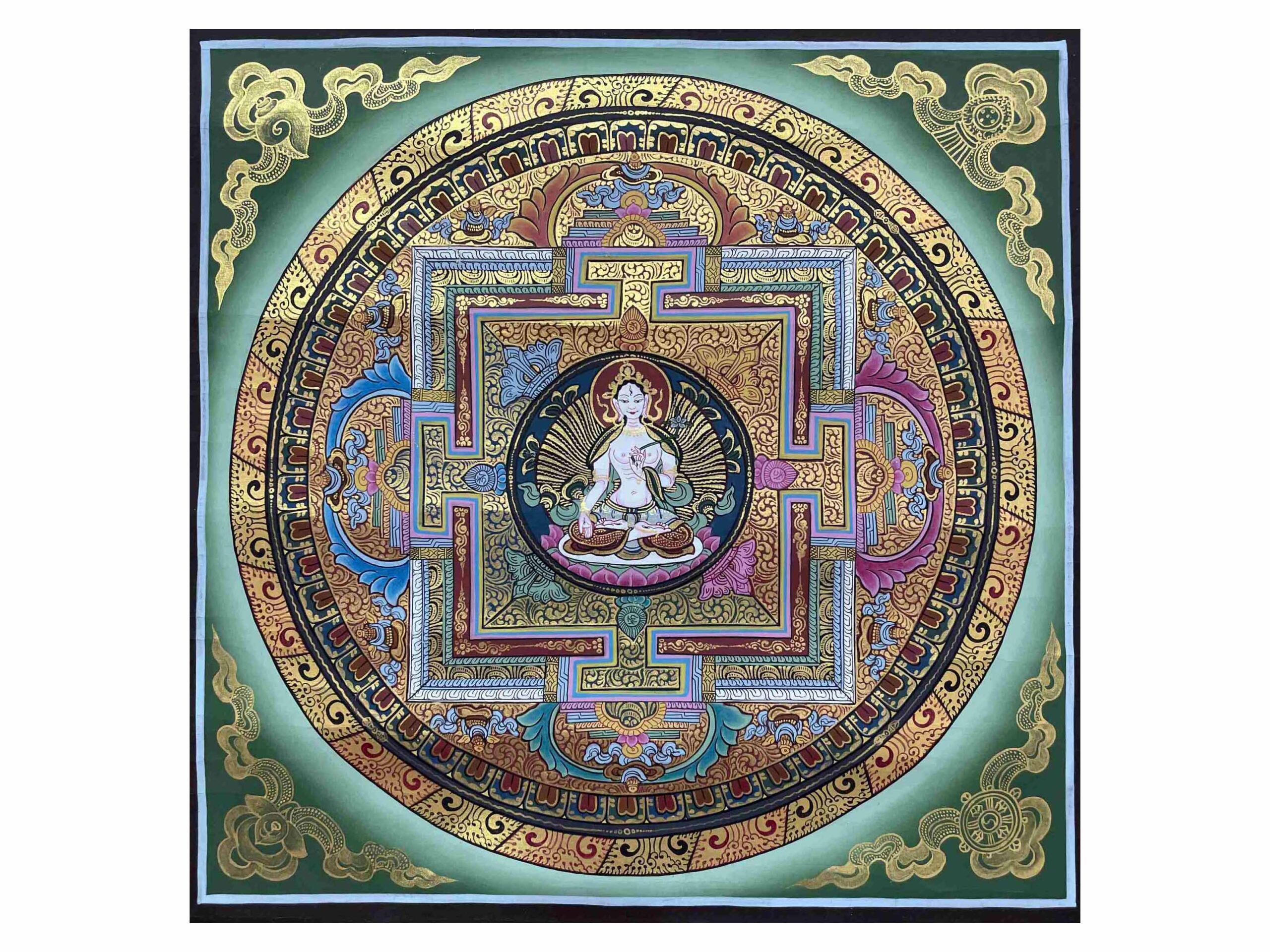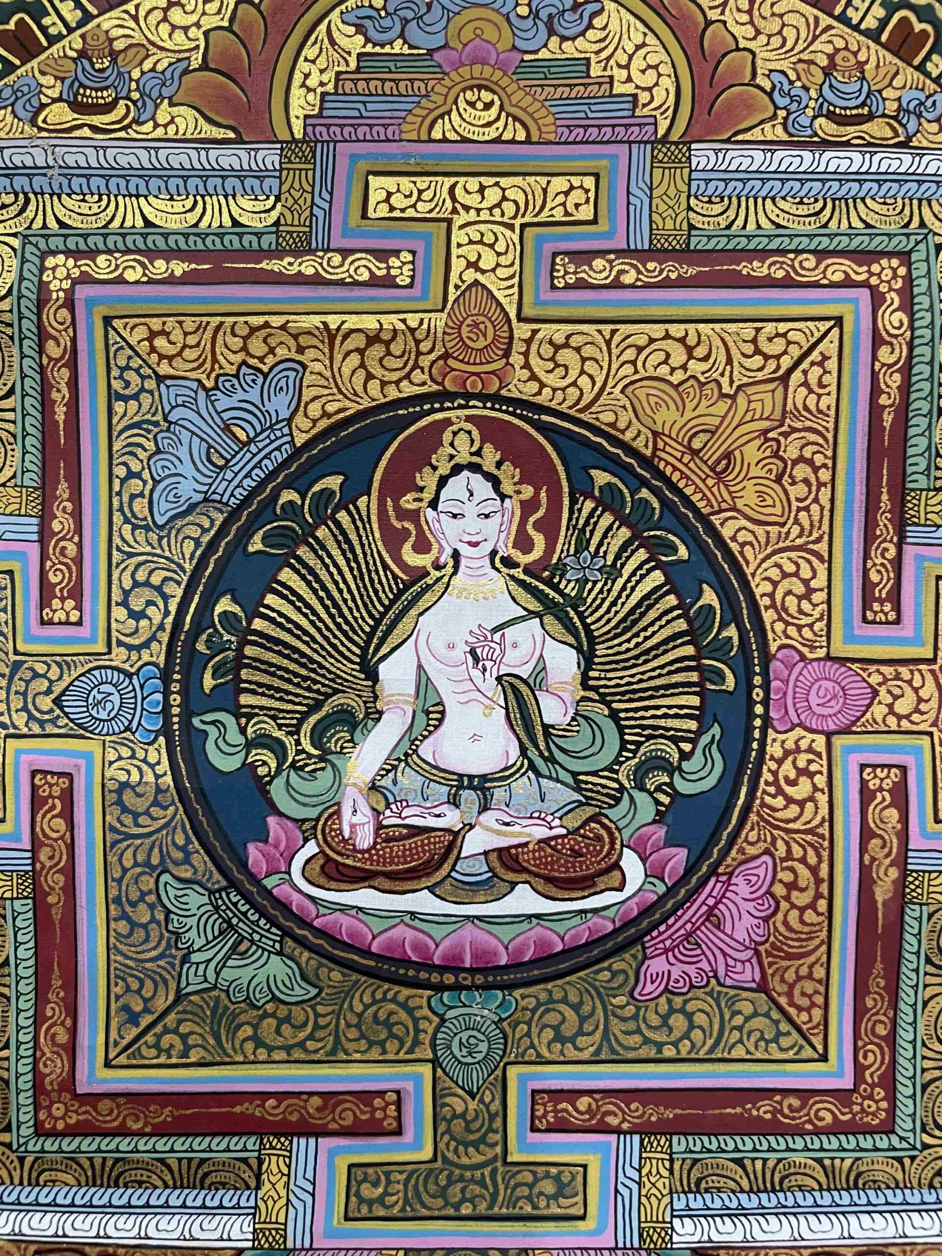 Buddhist Hand Painting of Mandala with White Tara at Center