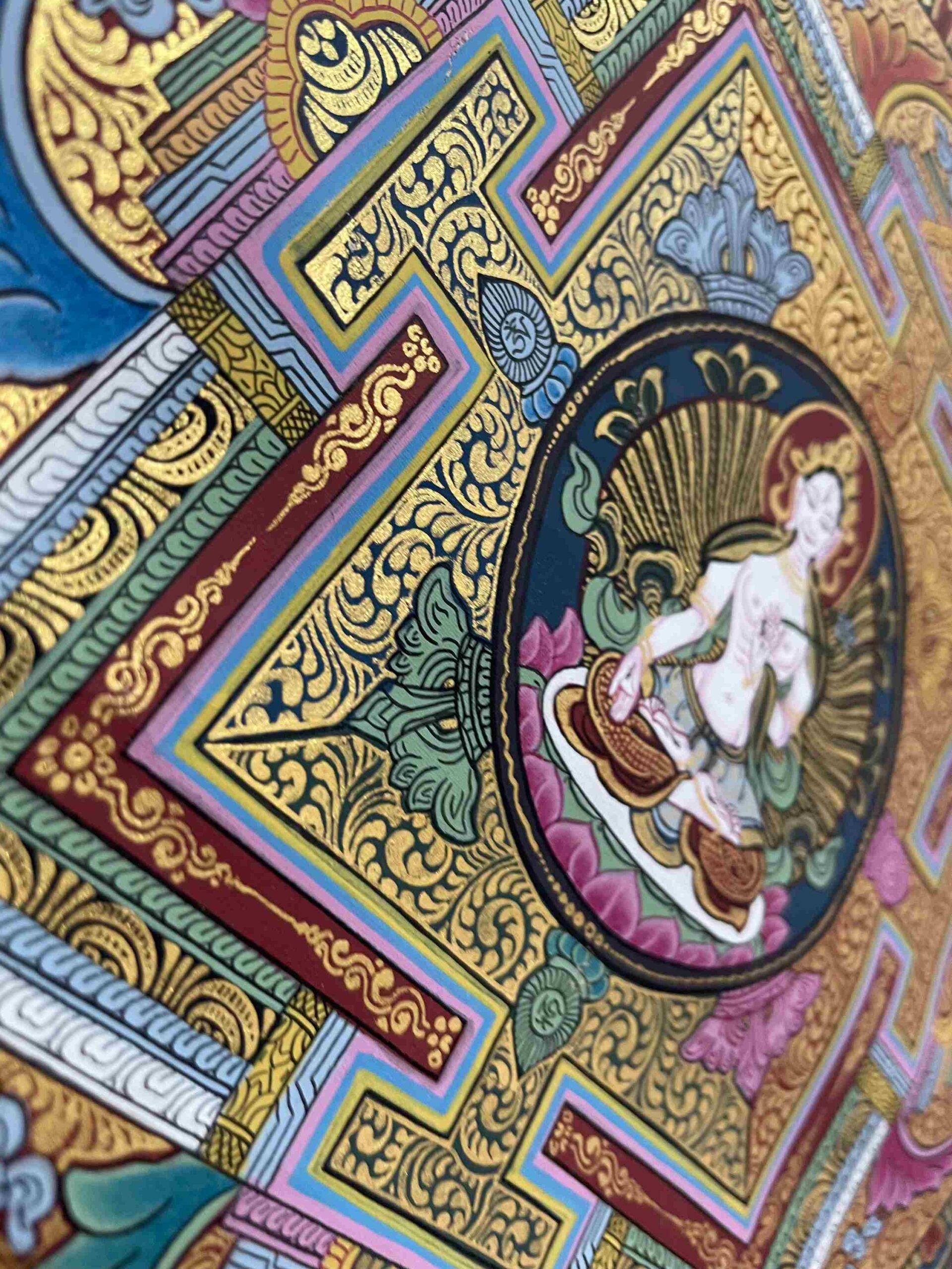 This exquisite hand-painted Mandala Thangka centers on White Tara, set within a symmetrical design of sacred geometry and symbolic motifs. Mandalas are meditative diagrams used in Buddhist practice to represent the universe and guide spiritual development. Each detail in the mandala’s precise design serves to quiet the mind and facilitate deeper inner awareness.