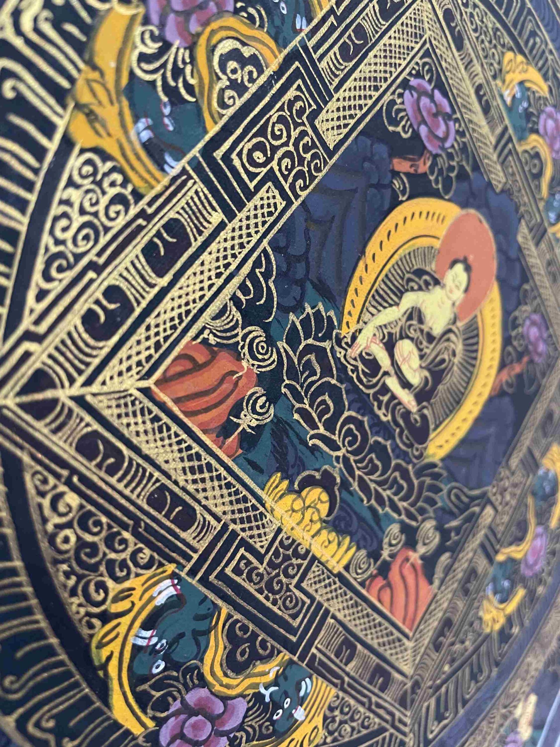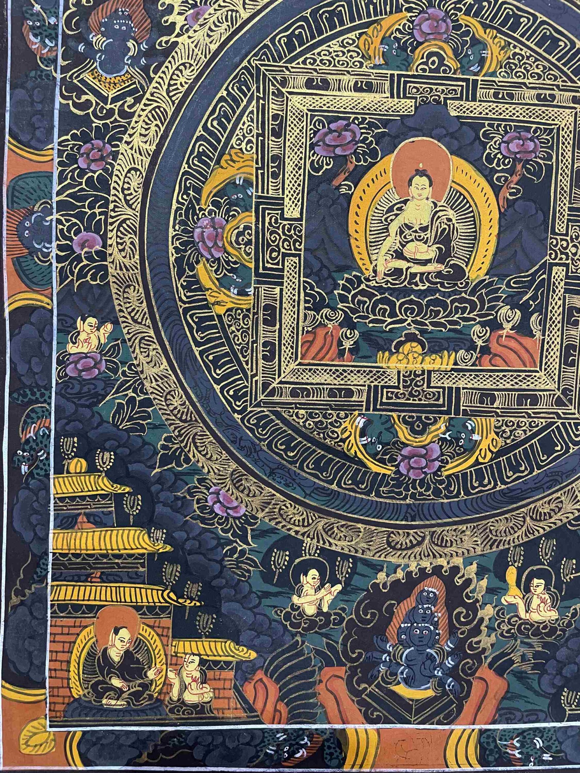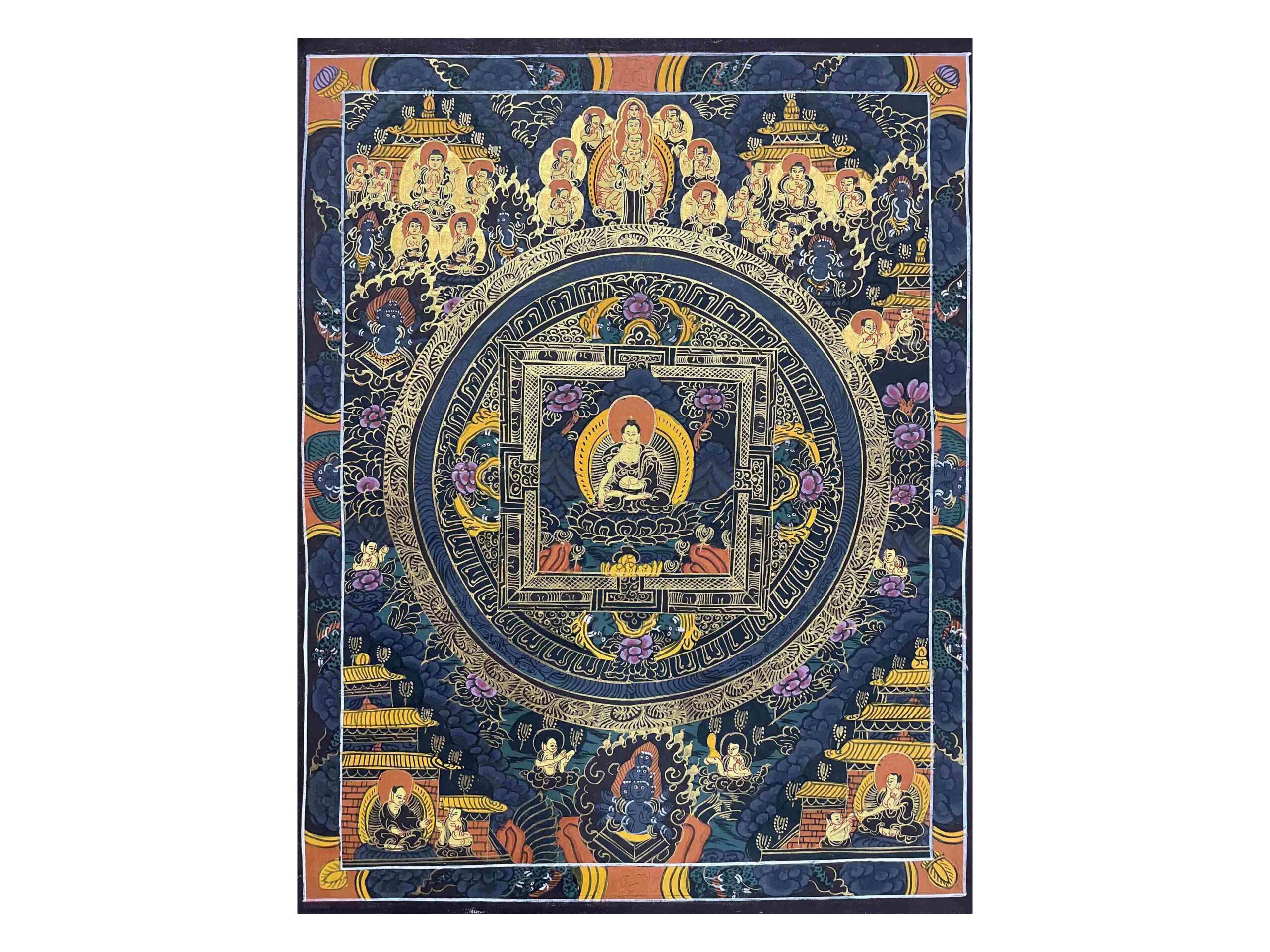 This exquisite hand-painted Mandala Thangka centers around Shakyamuni Buddha, the historical Buddha and spiritual guide of our age. Mandalas in Buddhist tradition are sacred geometric compositions representing the universe. With its symmetrical design and profound symbolism, this mandala serves as a visual aid for meditation, guiding practitioners towards mindfulness, balance, and enlightenment. The central figure of Shakyamuni radiates calm wisdom, anchoring the viewer in spiritual presence.
