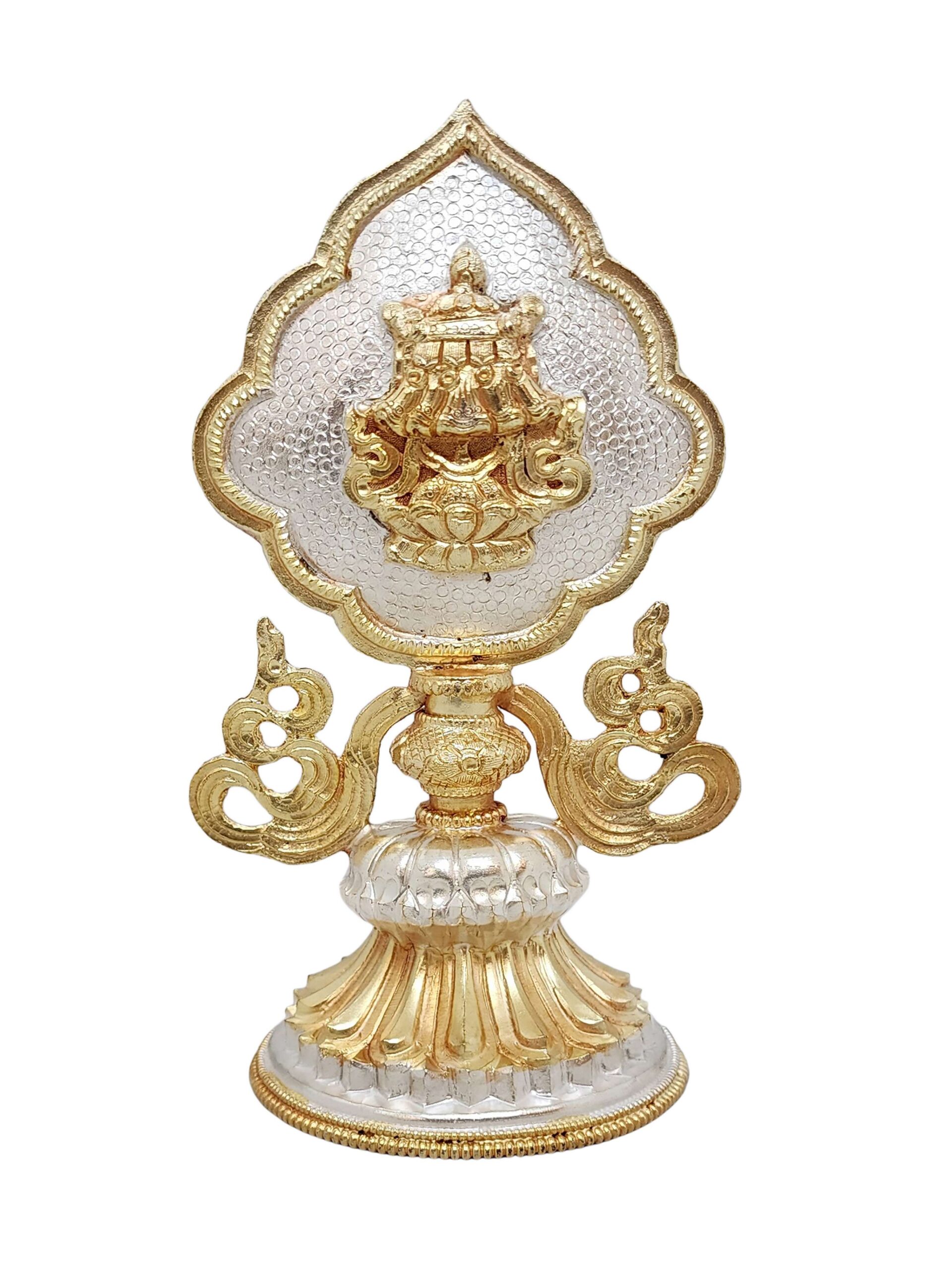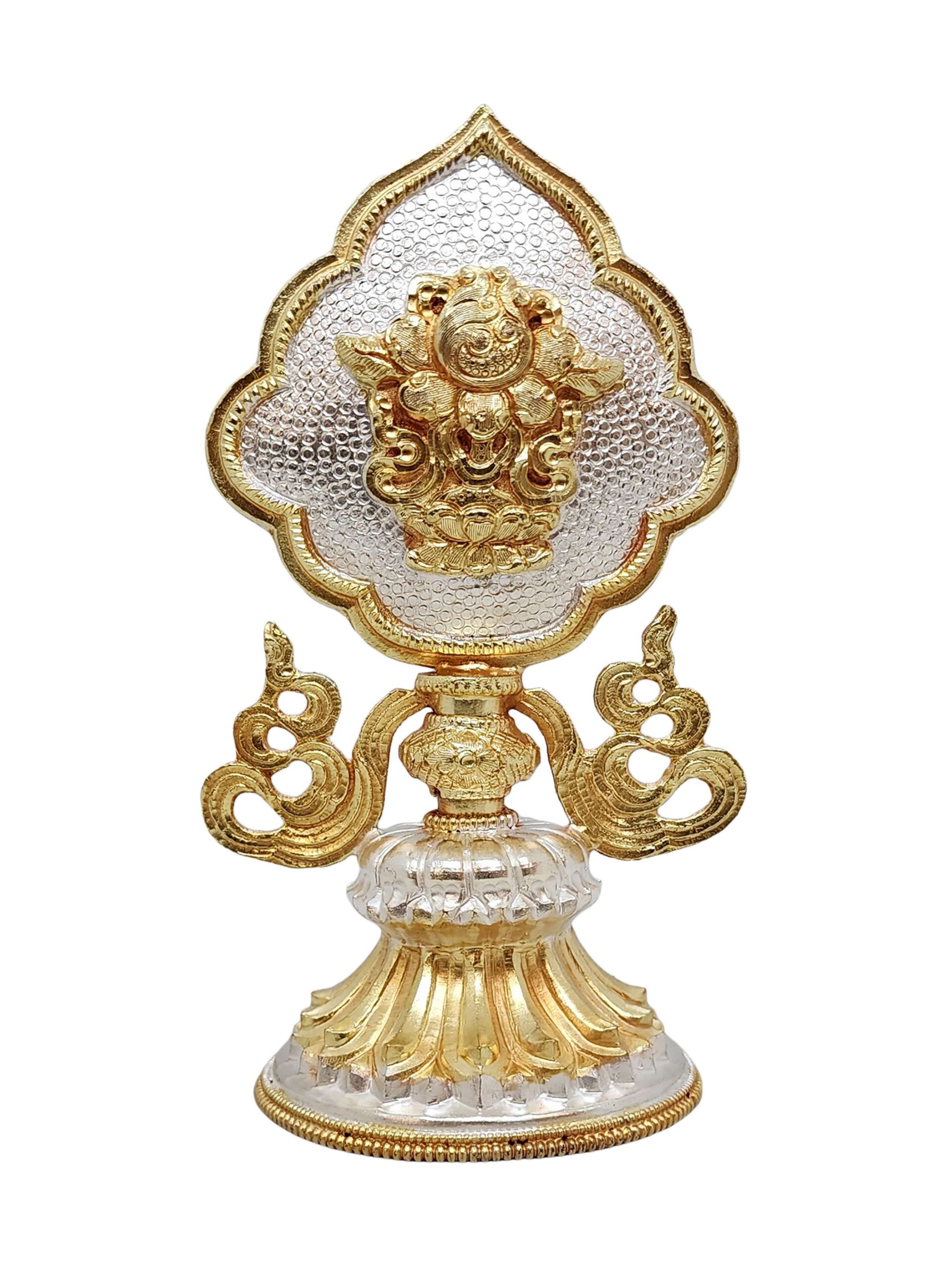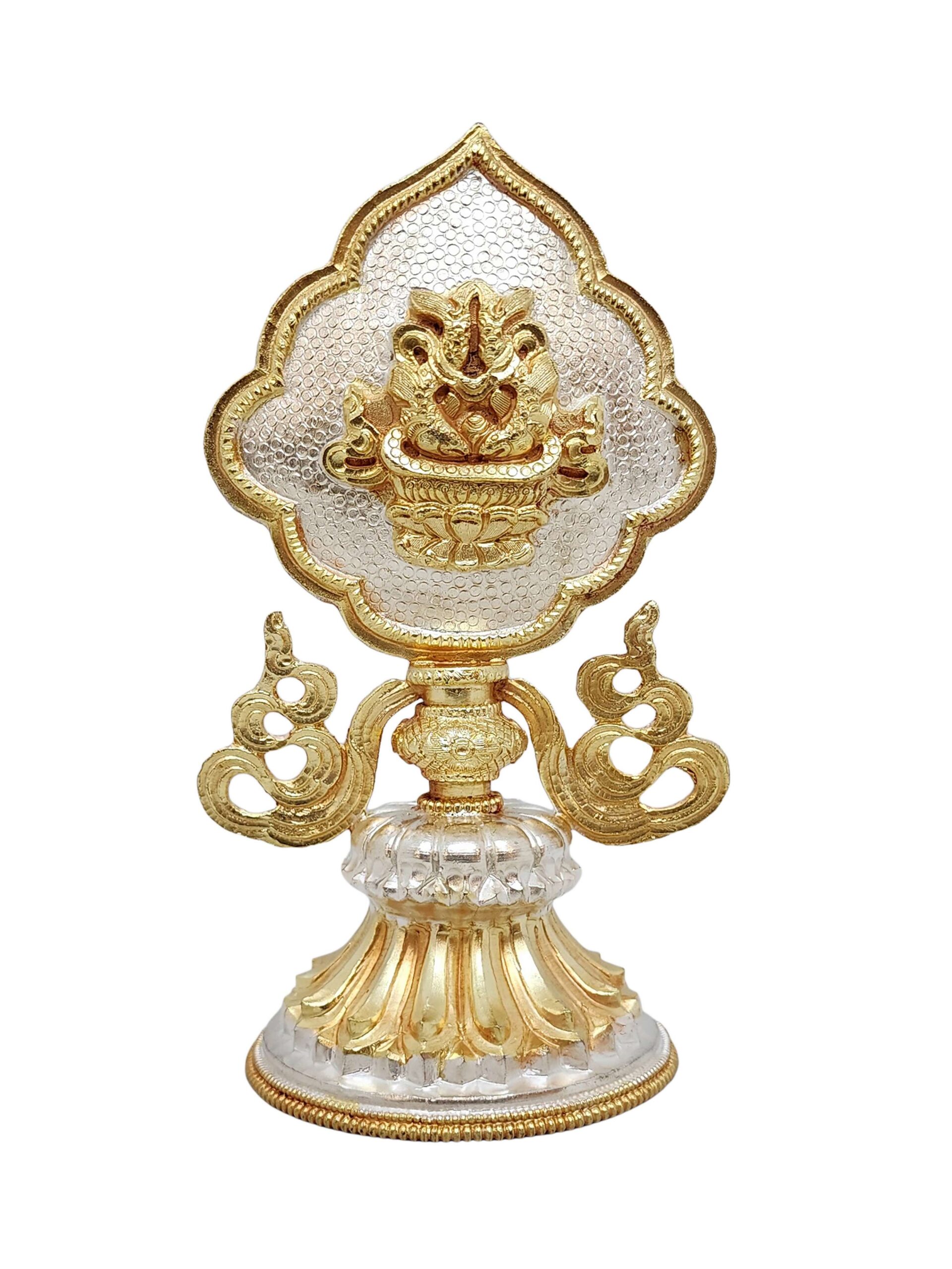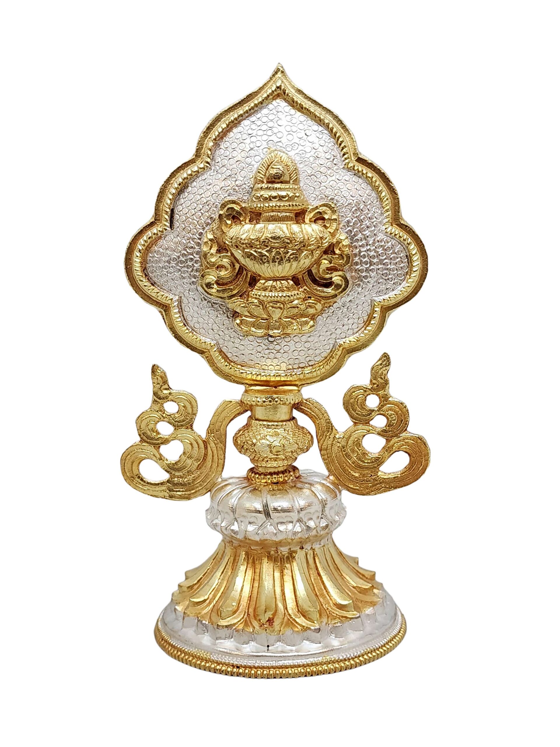 This Ashtamangala set features a partly gold-plated finish, a signature technique in Nepali handicrafts. Skilled artisans apply fire gold gilding, a process where a protective mask is used to shield specific areas, ensuring that only the intended parts of the set are covered in gold. The object is then subjected to high temperatures, allowing the gold to adhere beautifully to the exposed surfaces.
