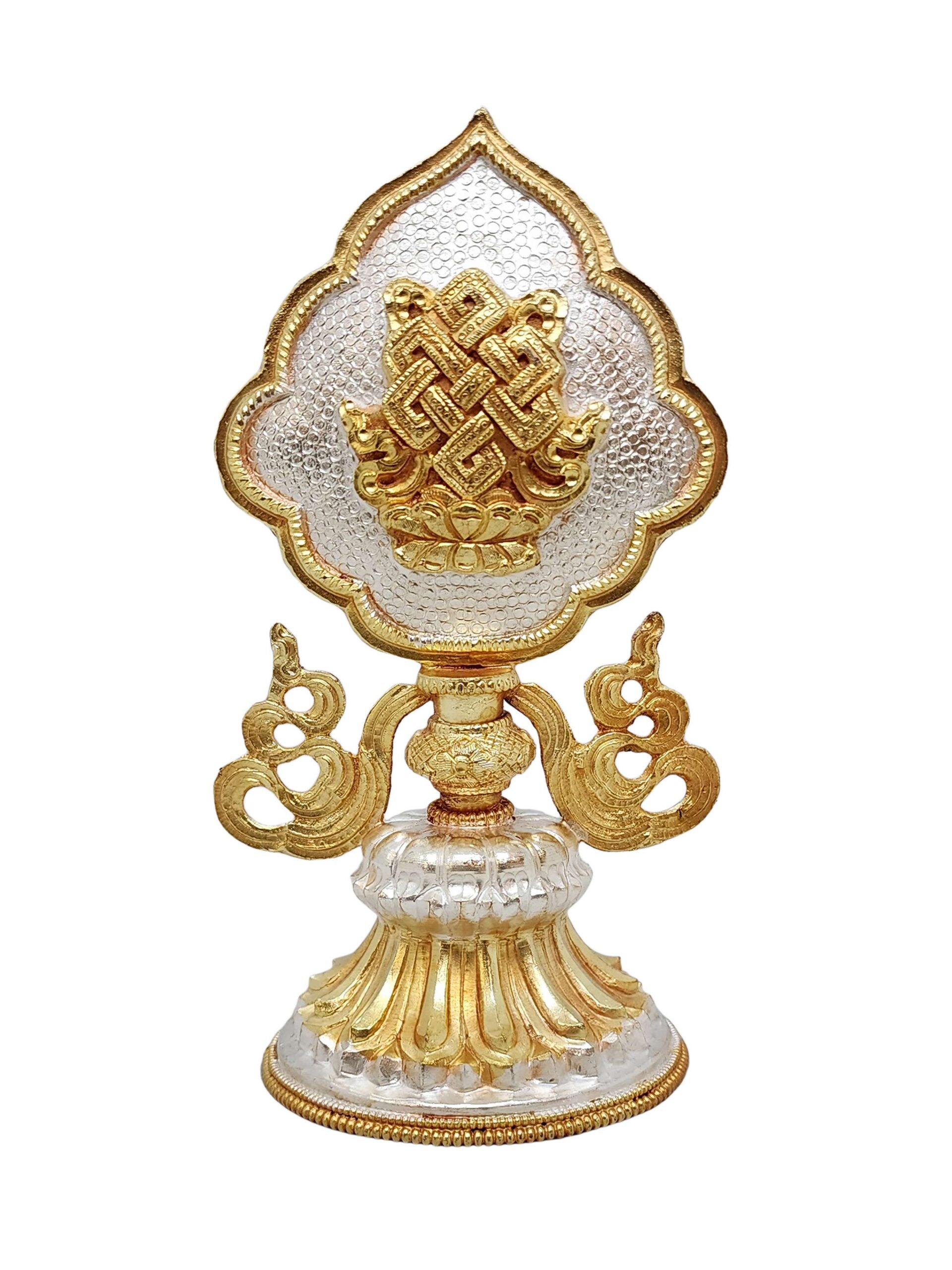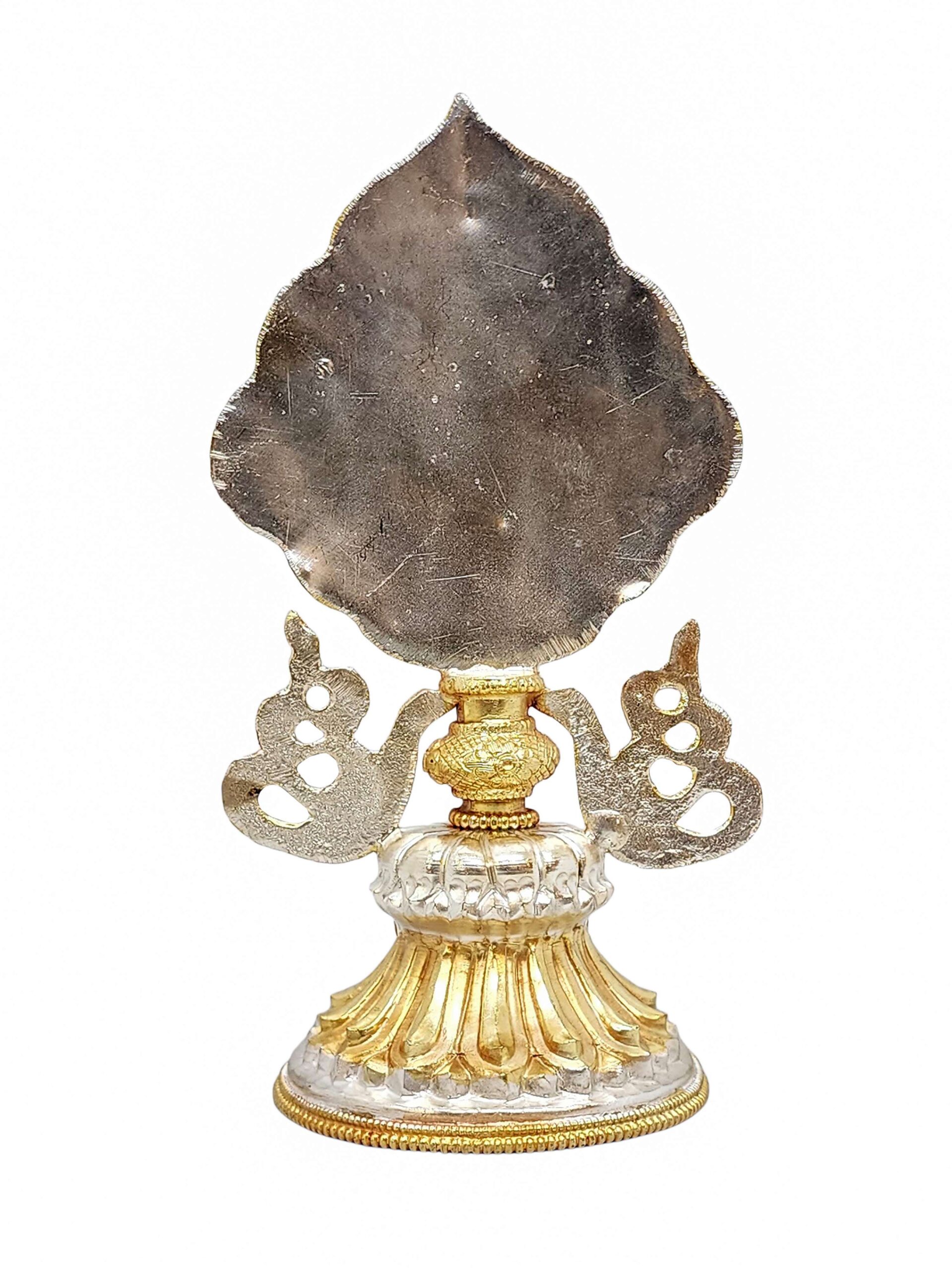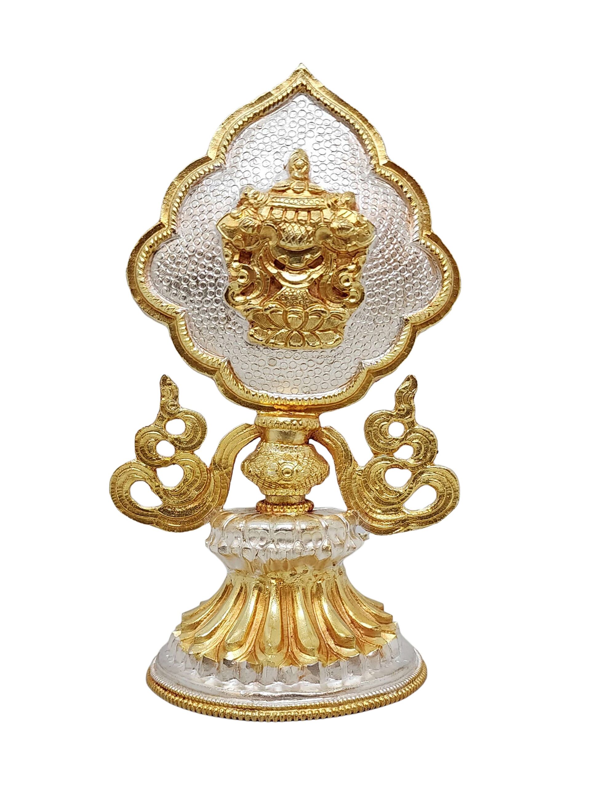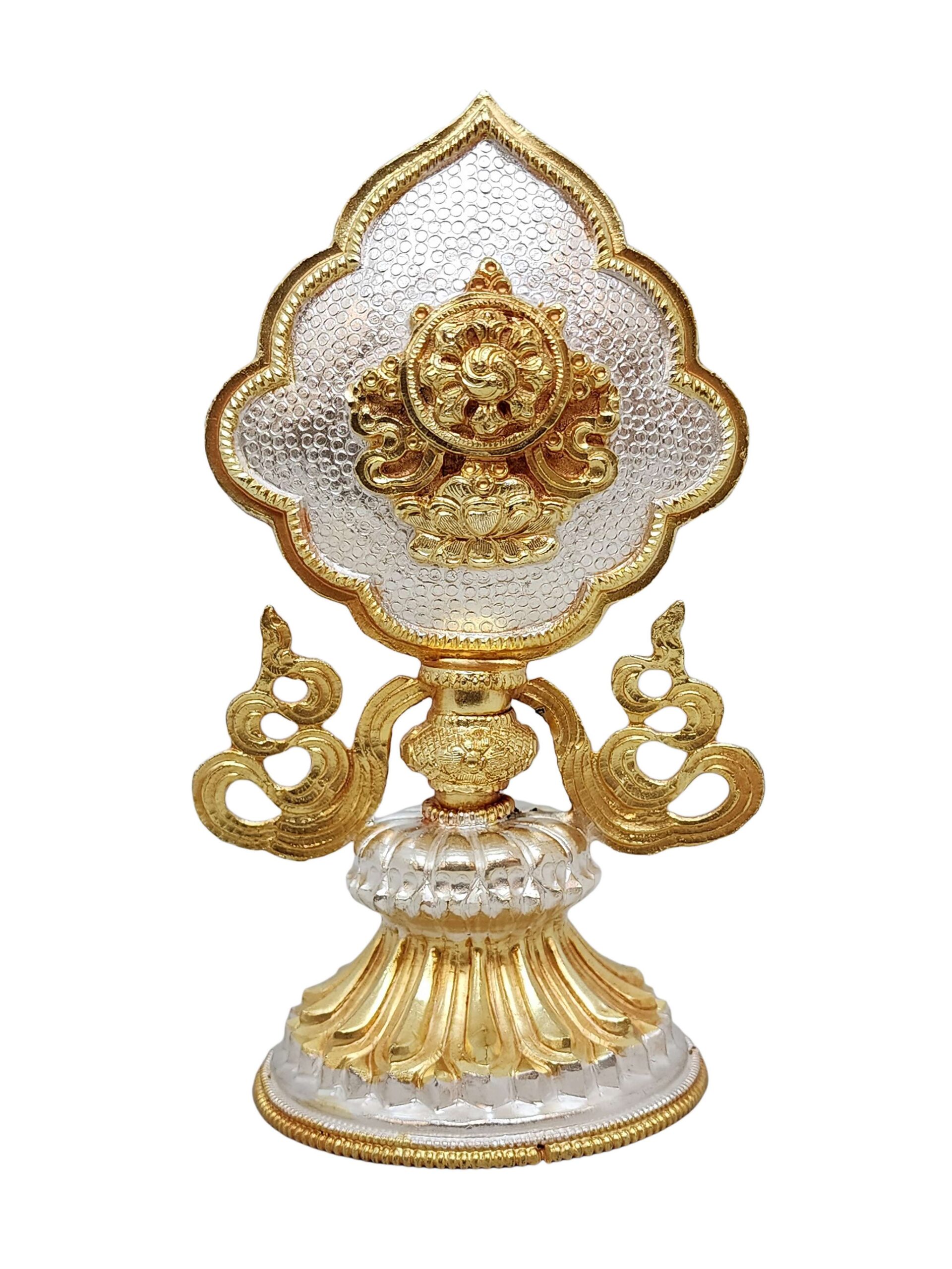 This Ashtamangala set features a partly gold-plated finish, a signature technique in Nepali handicrafts. Skilled artisans apply fire gold gilding, a process where a protective mask is used to shield specific areas, ensuring that only the intended parts of the set are covered in gold. The object is then subjected to high temperatures, allowing the gold to adhere beautifully to the exposed surfaces.