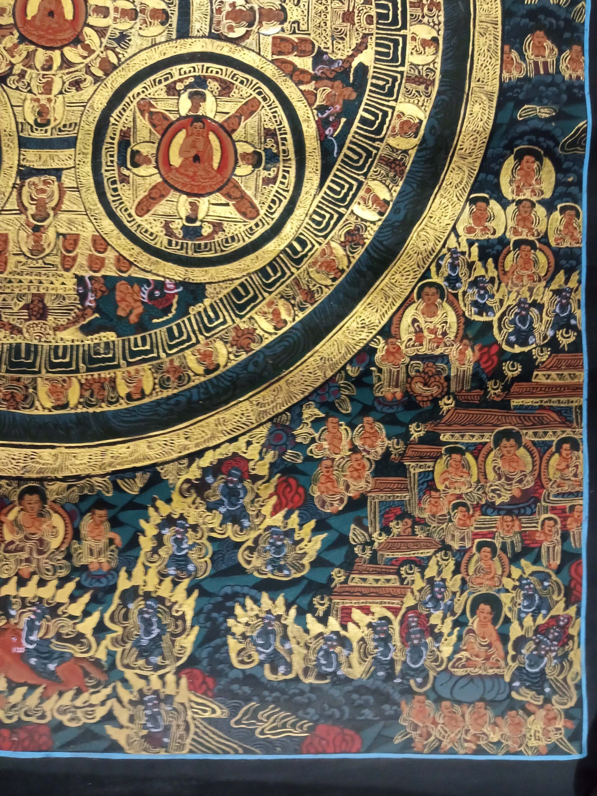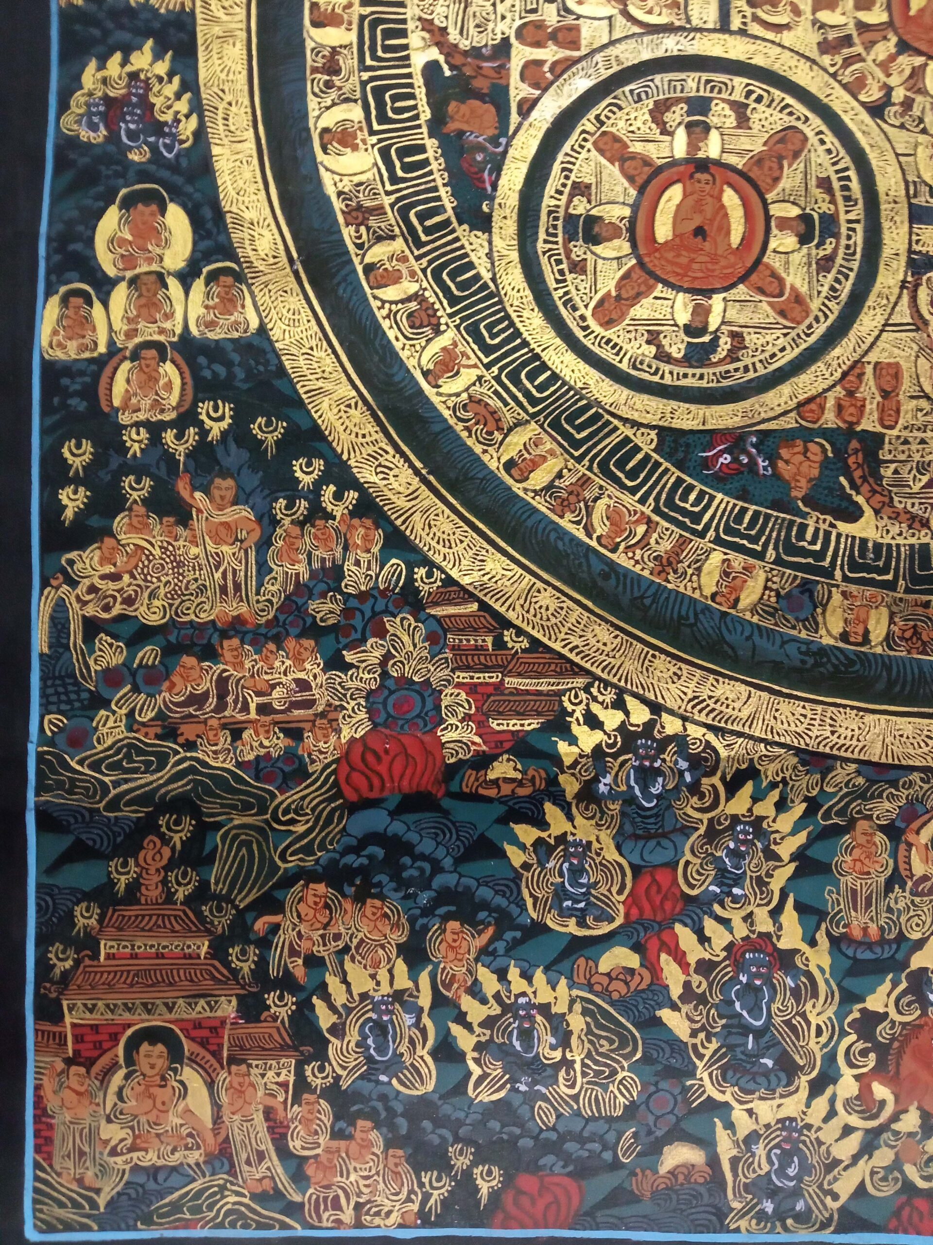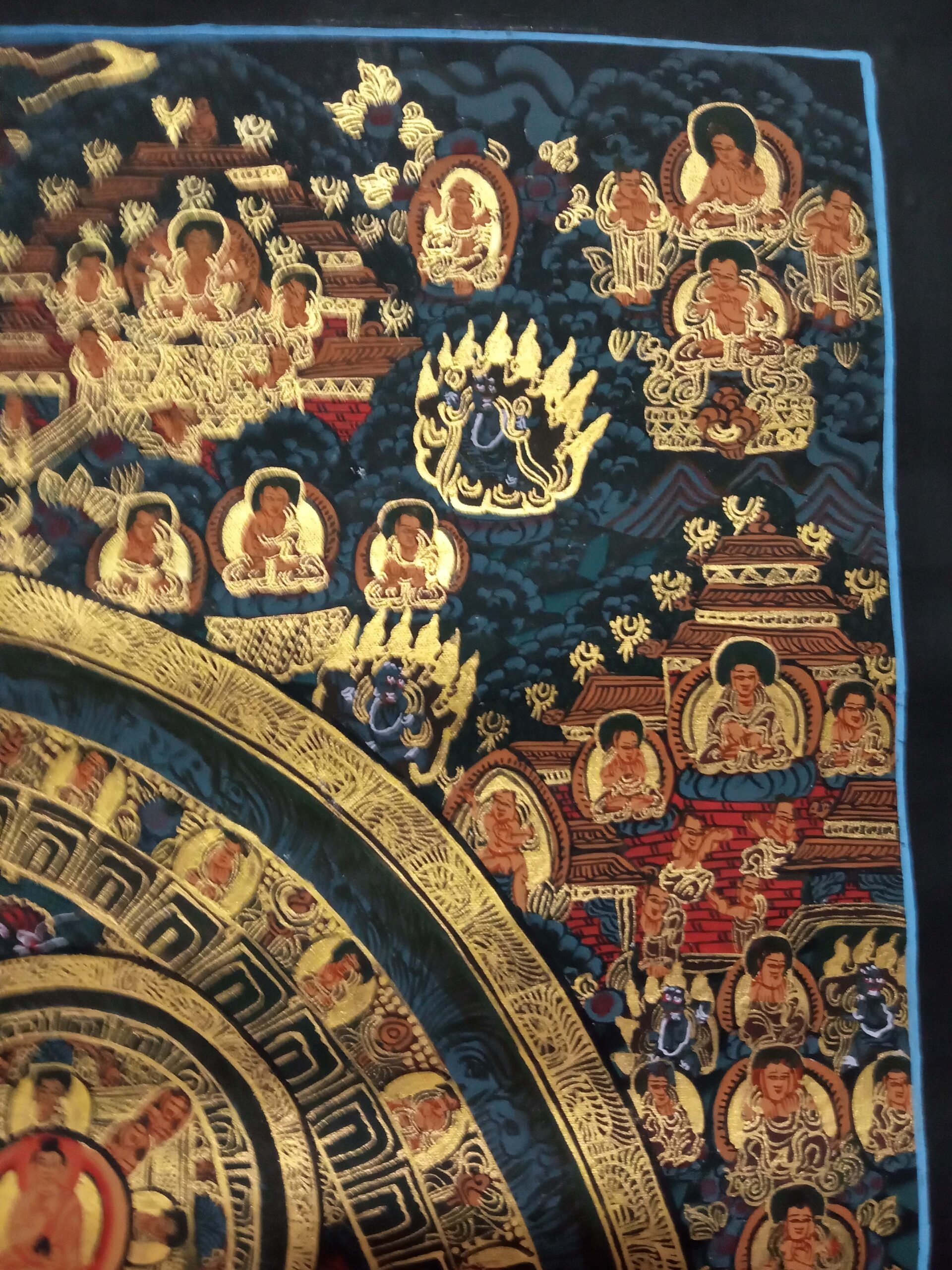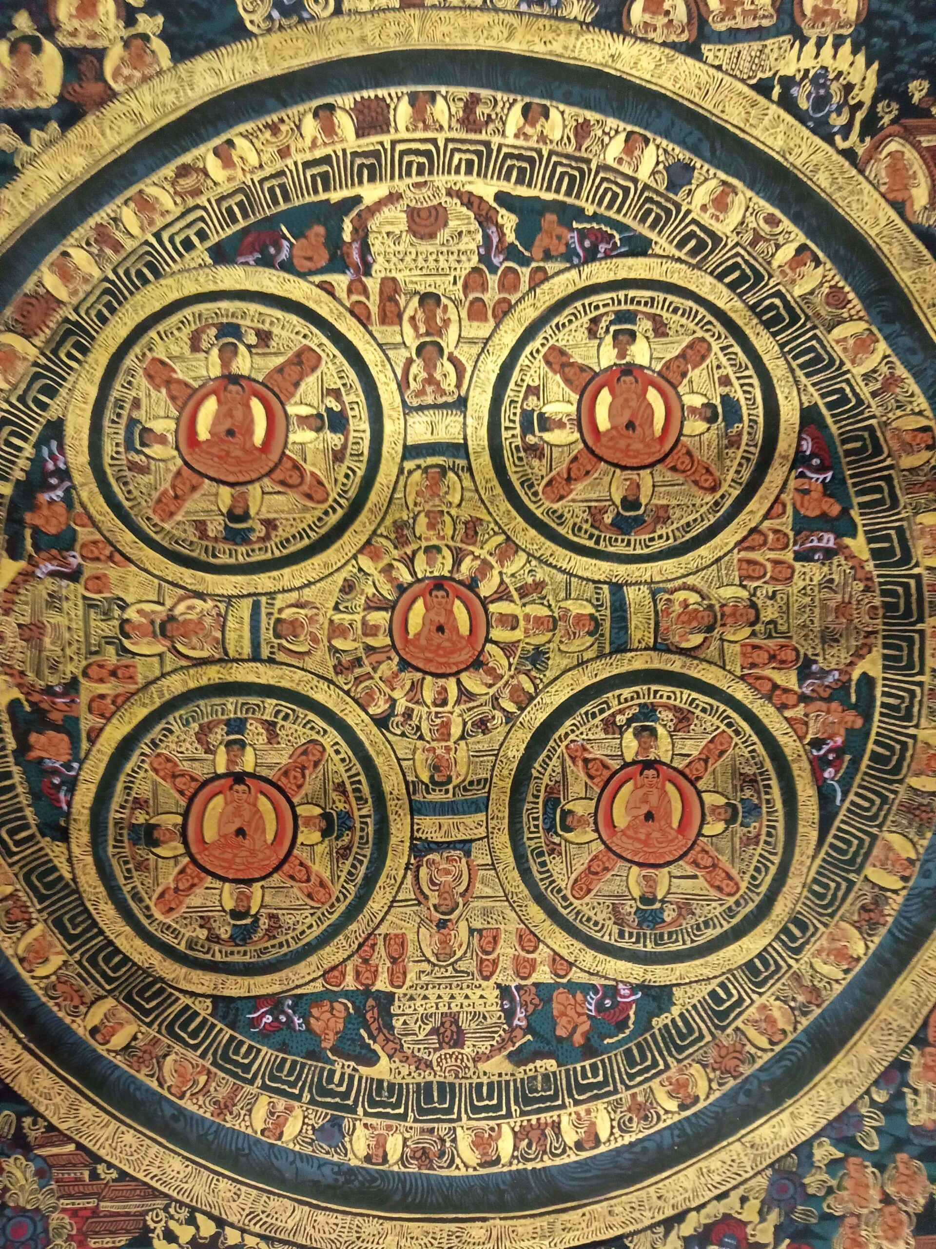 The Pancha Mandala Thangka represents the five cosmic elements—earth, water, fire, air, and space—through intricate mandala designs. Each mandala embodies a unique spiritual essence, guiding practitioners toward inner peace, balance, and enlightenment. Traditionally used in meditation and rituals, this Thangka fosters deep concentration, self-awareness, and a harmonious connection with the universe.
