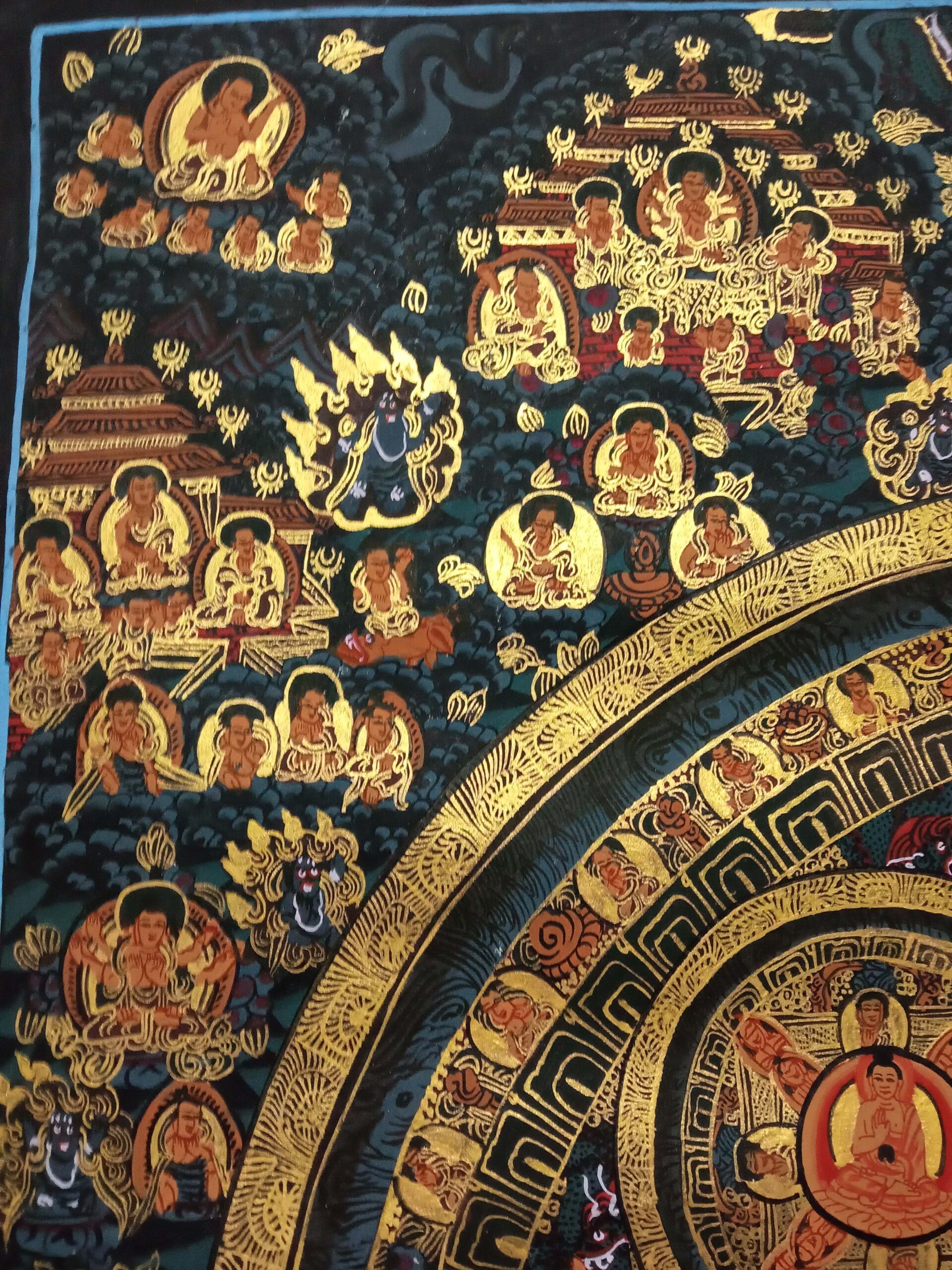 A Thangka (also spelled tangka, thanka, or tanka) is a sacred Tibetan Buddhist painting on cotton or silk, depicting deities, mandalas, and spiritual narratives. These artworks are carefully crafted with detailed brushwork and natural pigments, serving as essential tools in Buddhist practice. Unlike framed paintings, Thangkas are rolled for storage and mounted with silk brocade for preservation. To ensure their longevity, they should be kept in a dry environment, protected from moisture and direct sunlight.