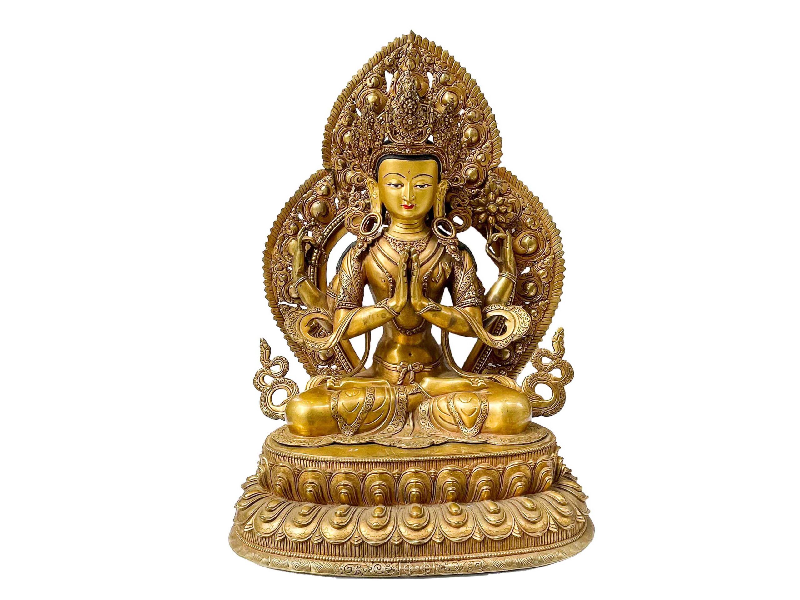 Buddhist Handmade Statue of Chenrezig (Avalokiteshvara) – Full Gold Plated with Hand-Painted Face