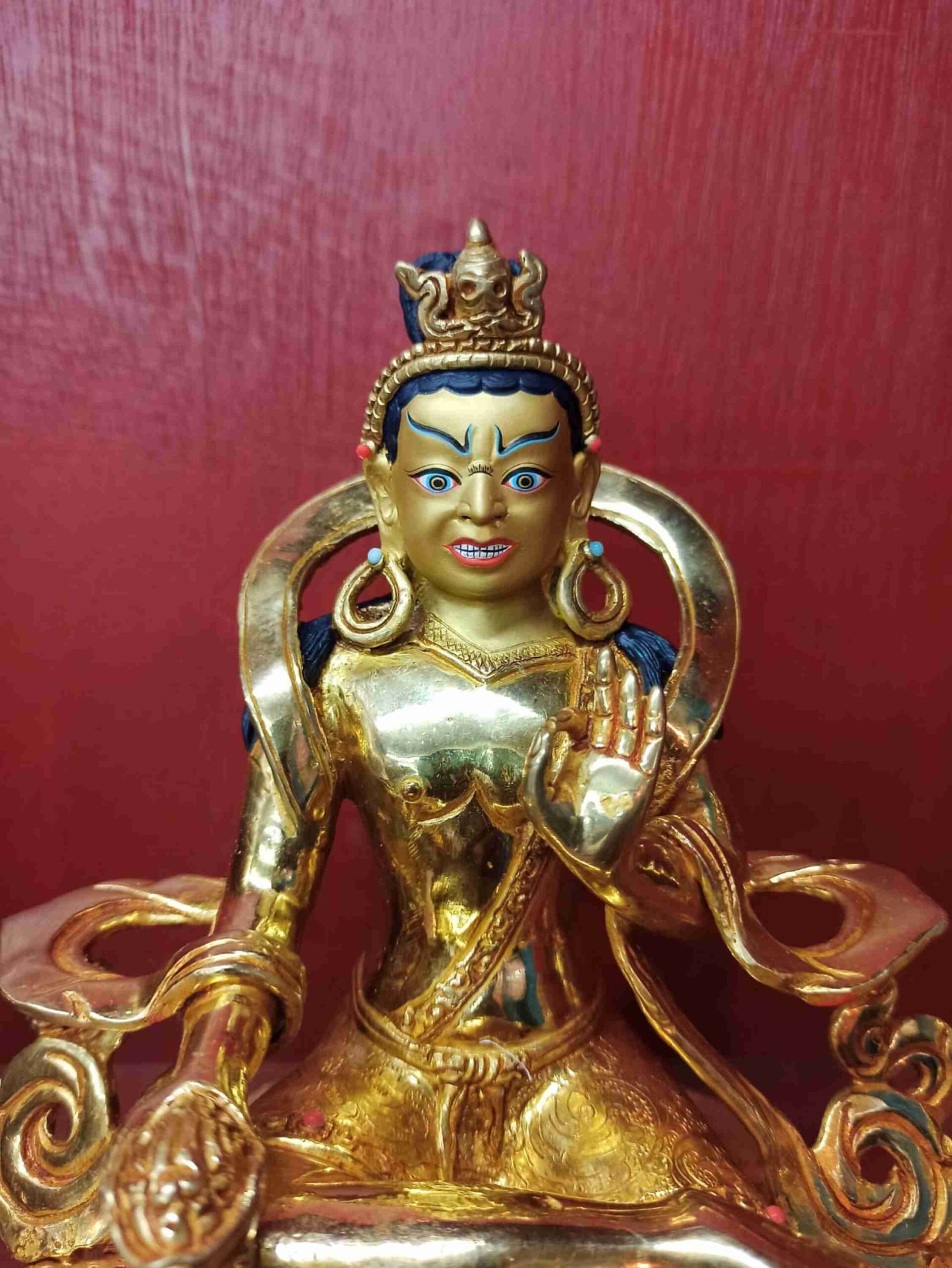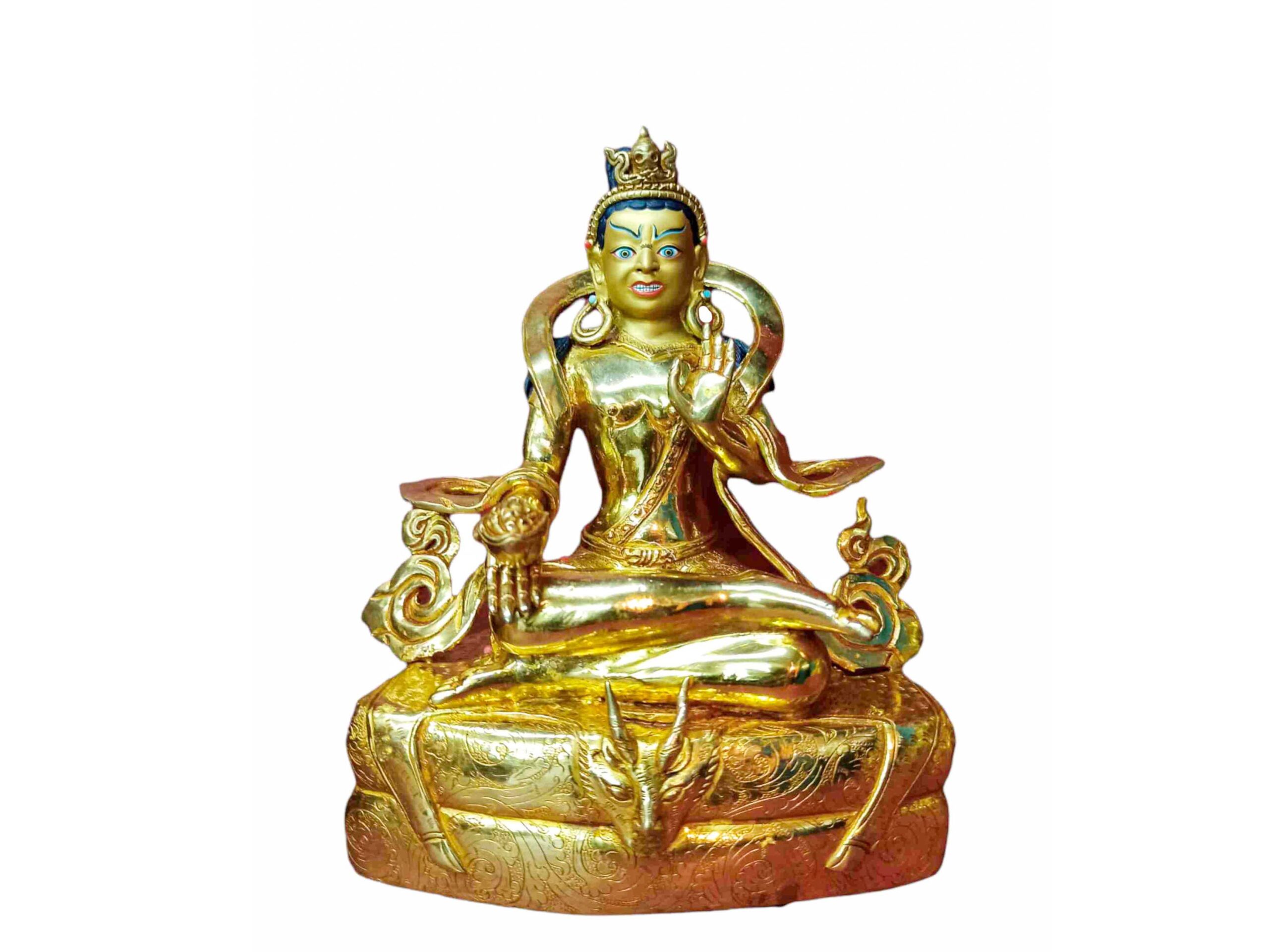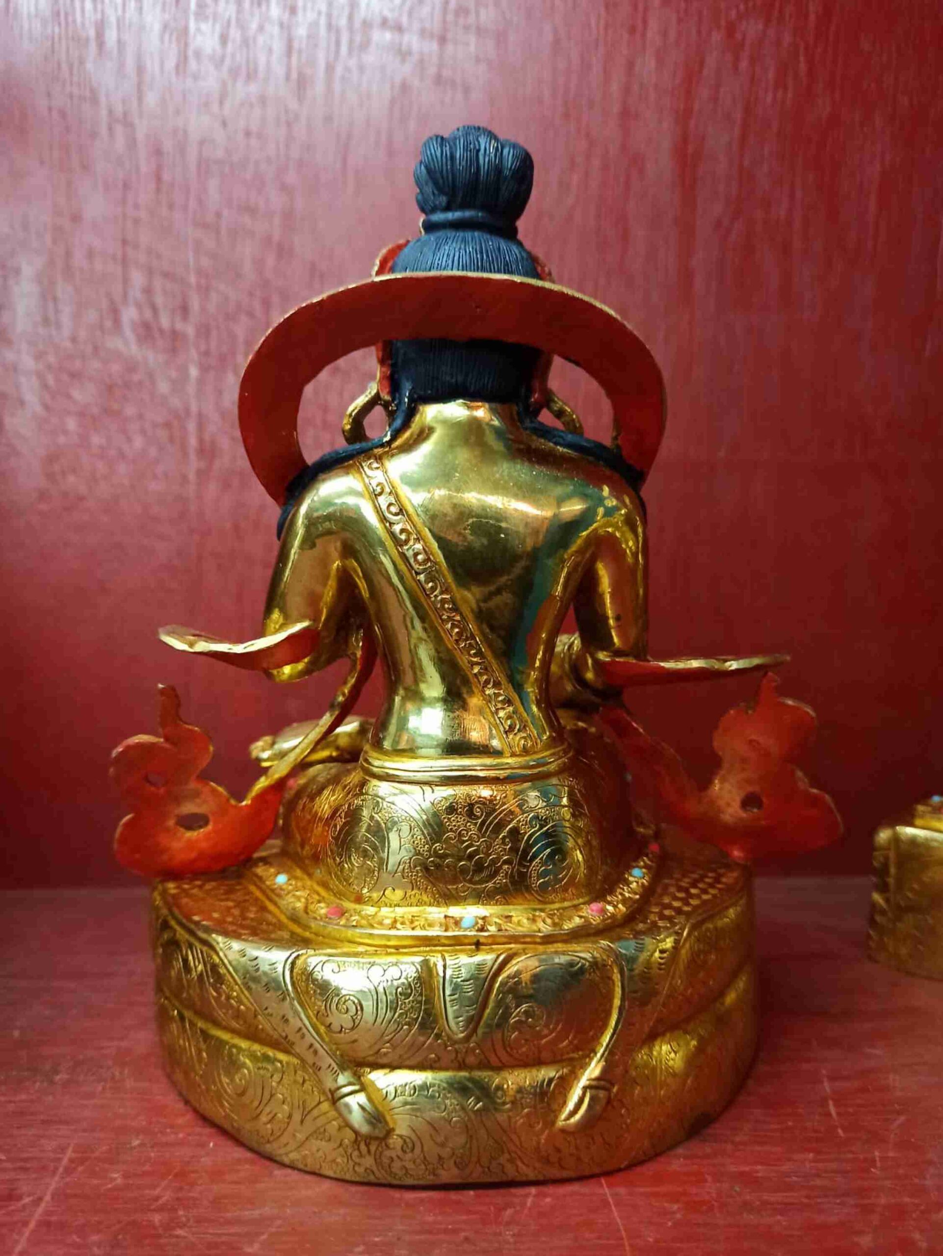 This statue is finished with fire gilding, also known as mercury gold plating—a revered Nepalese technique used in traditional Buddhist art. Unlike modern electroplating, fire gilding ensures a richer, more durable, and authentic gold finish.