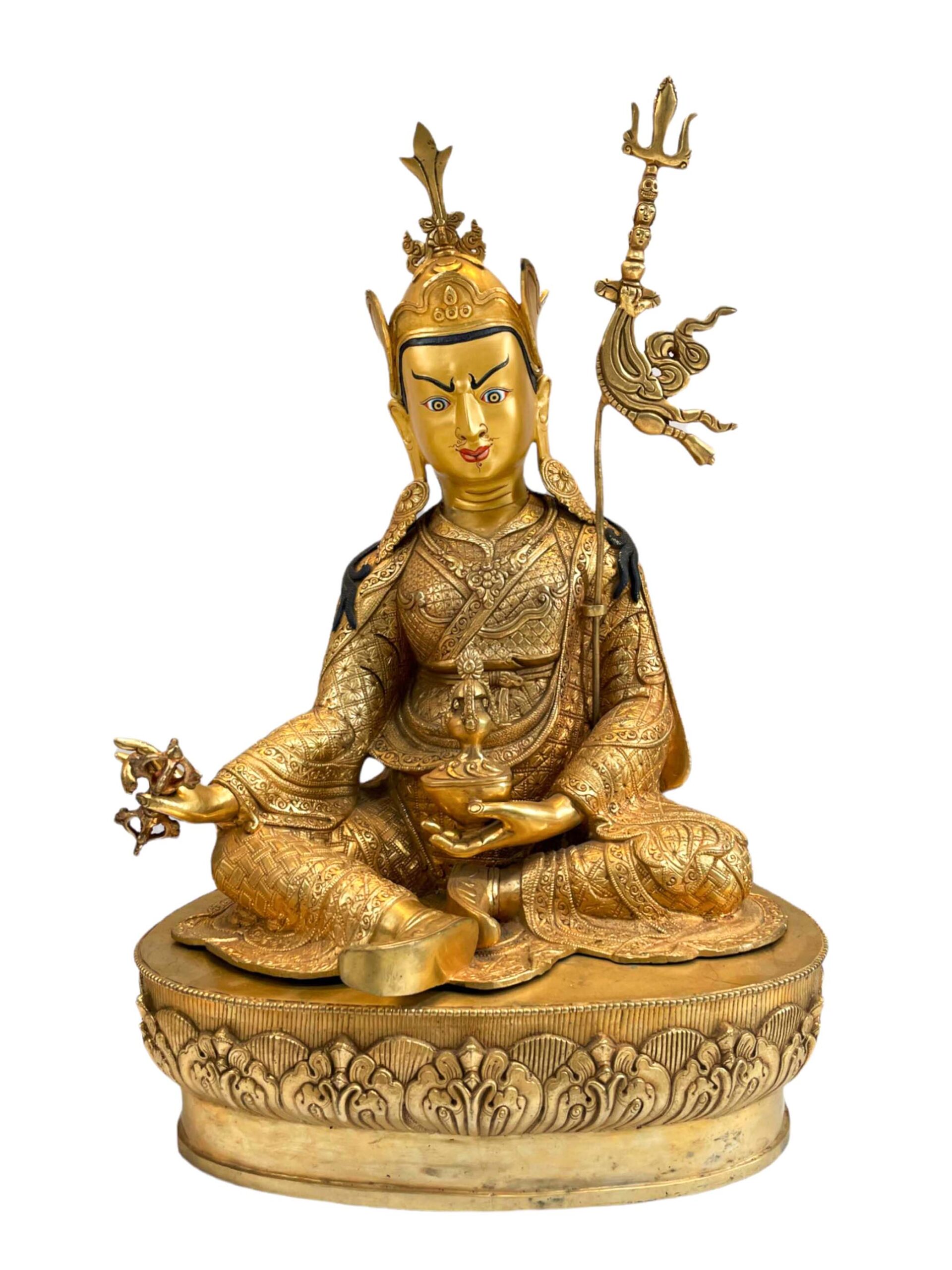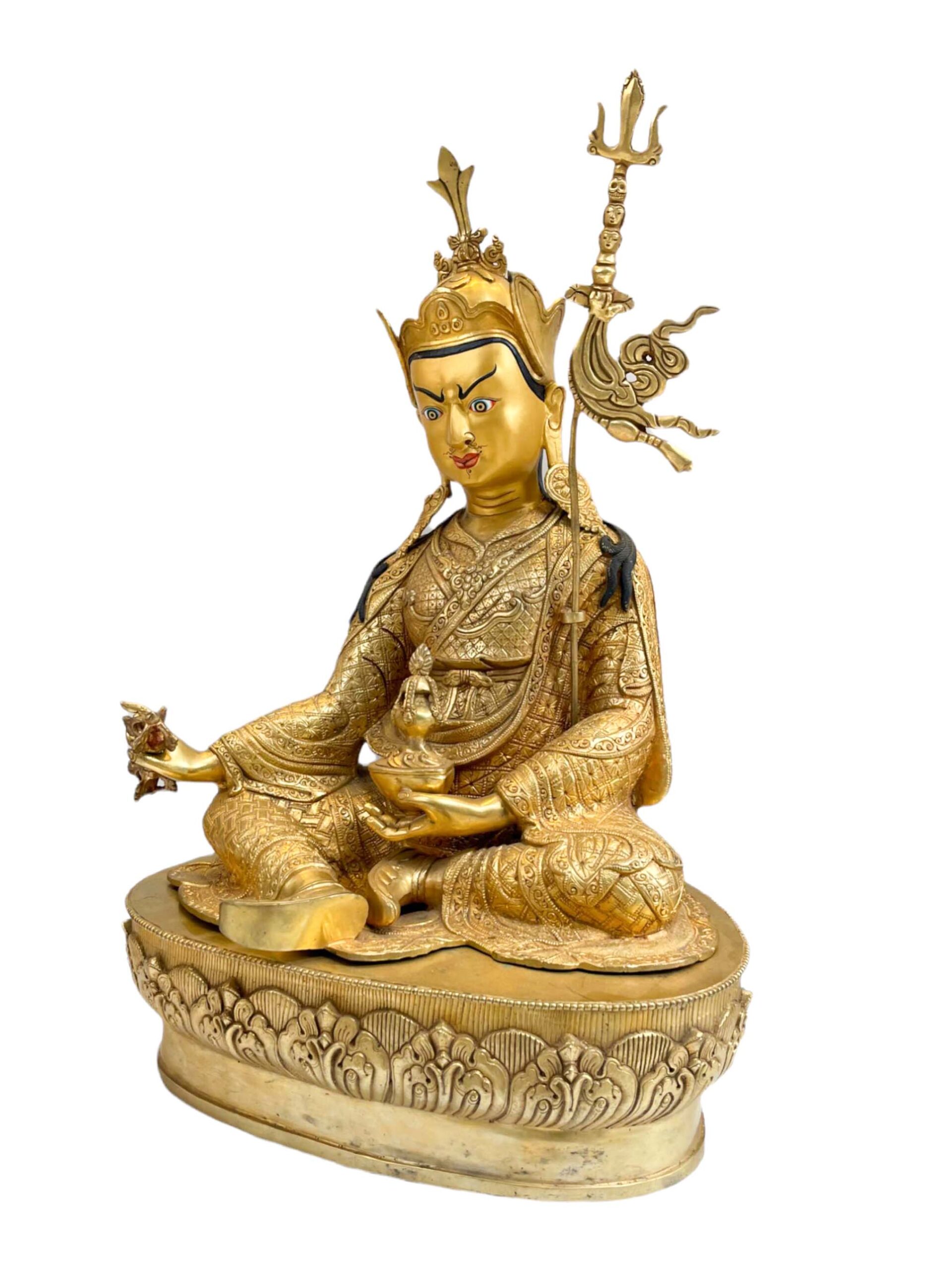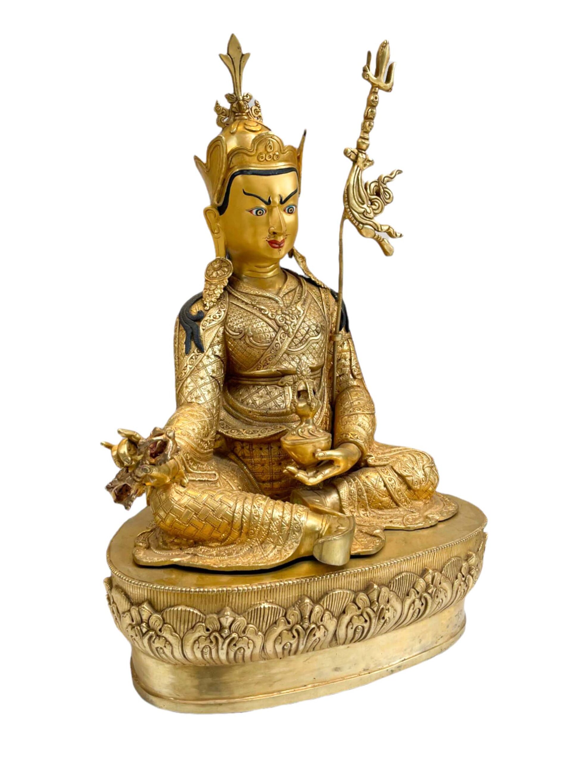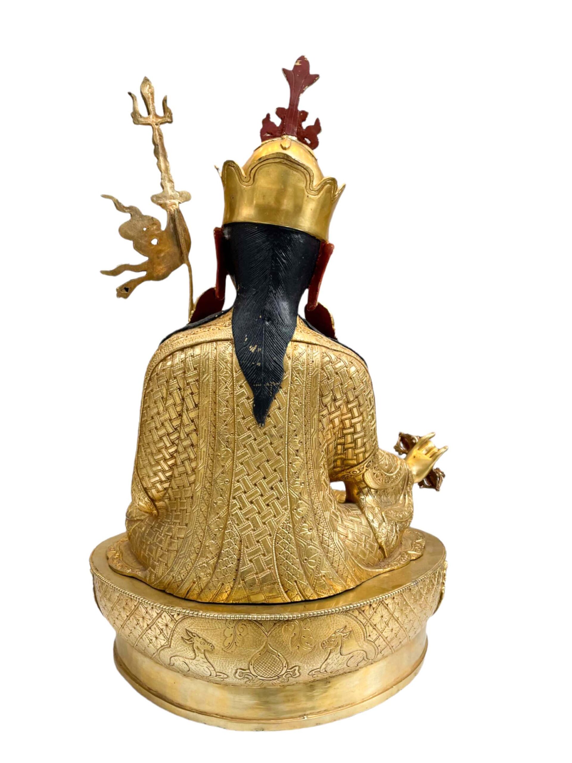 This Padmasambhava statue is finished with full fire gold plating, also known as mercury gold plating—a traditional Nepalese technique that applies a genuine gold layer onto the sculpture.
