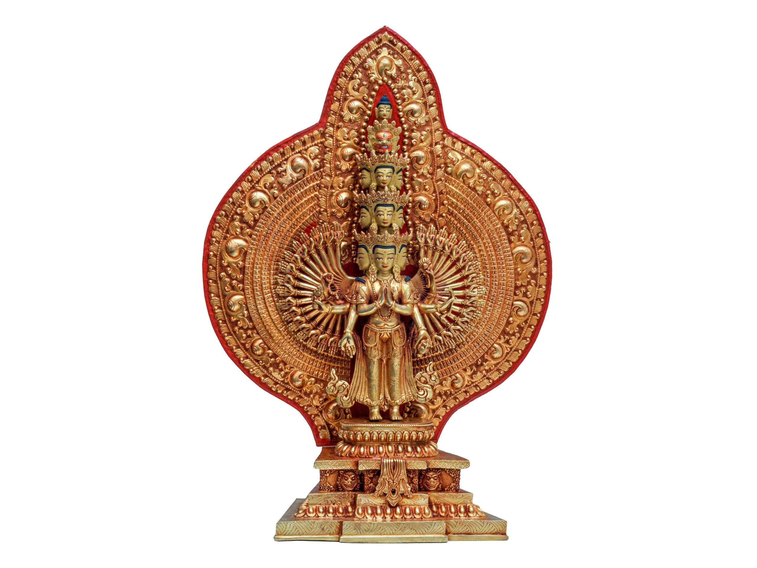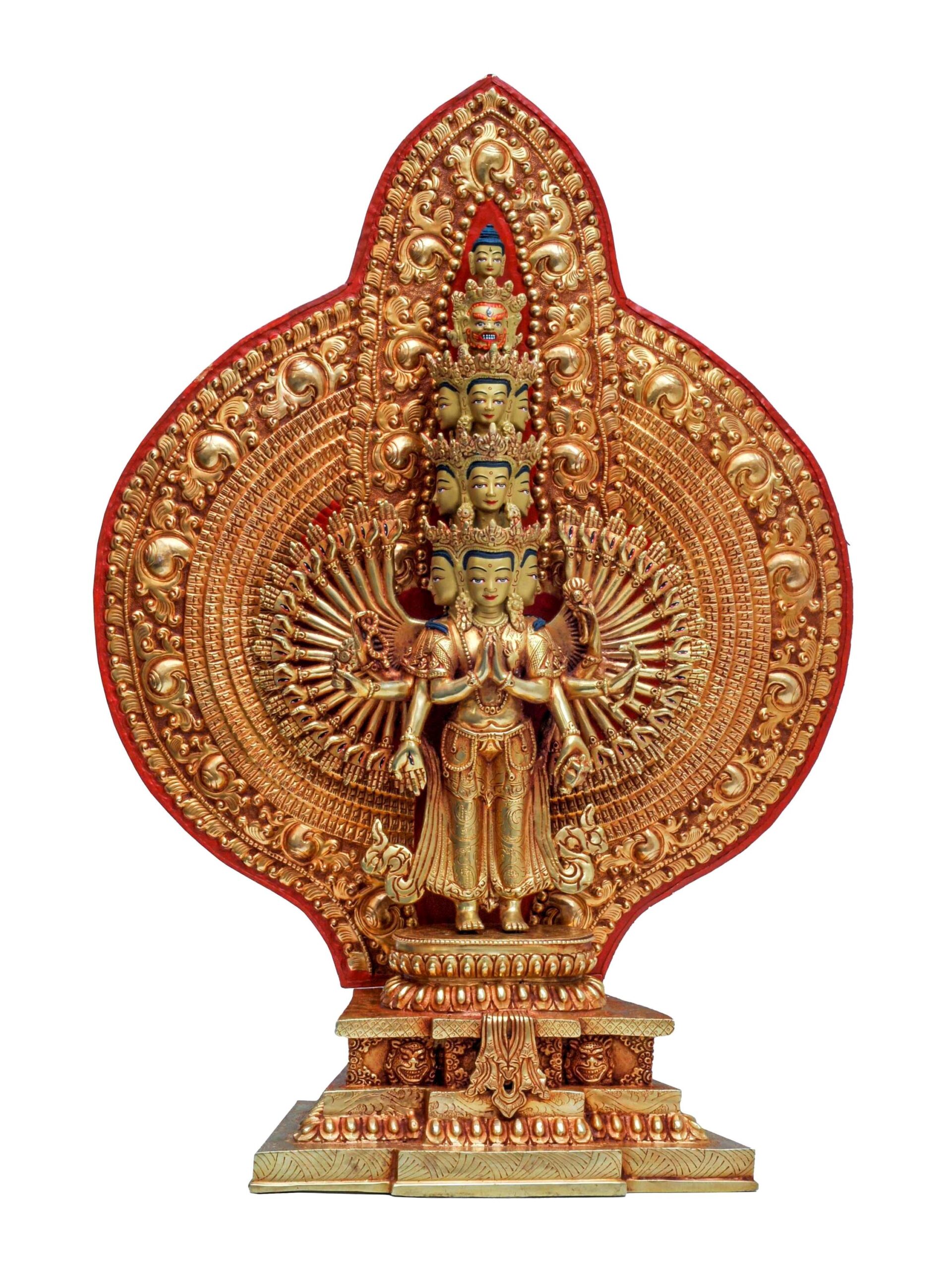 Buddhist Handmade Statue of Sahasrabhuja Avalokitesvara – 1000 Arms, Full Fire Gold Plated with Gold Painted Face