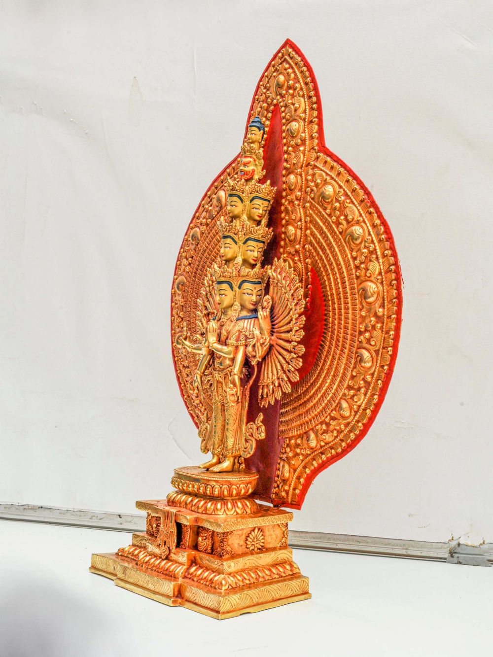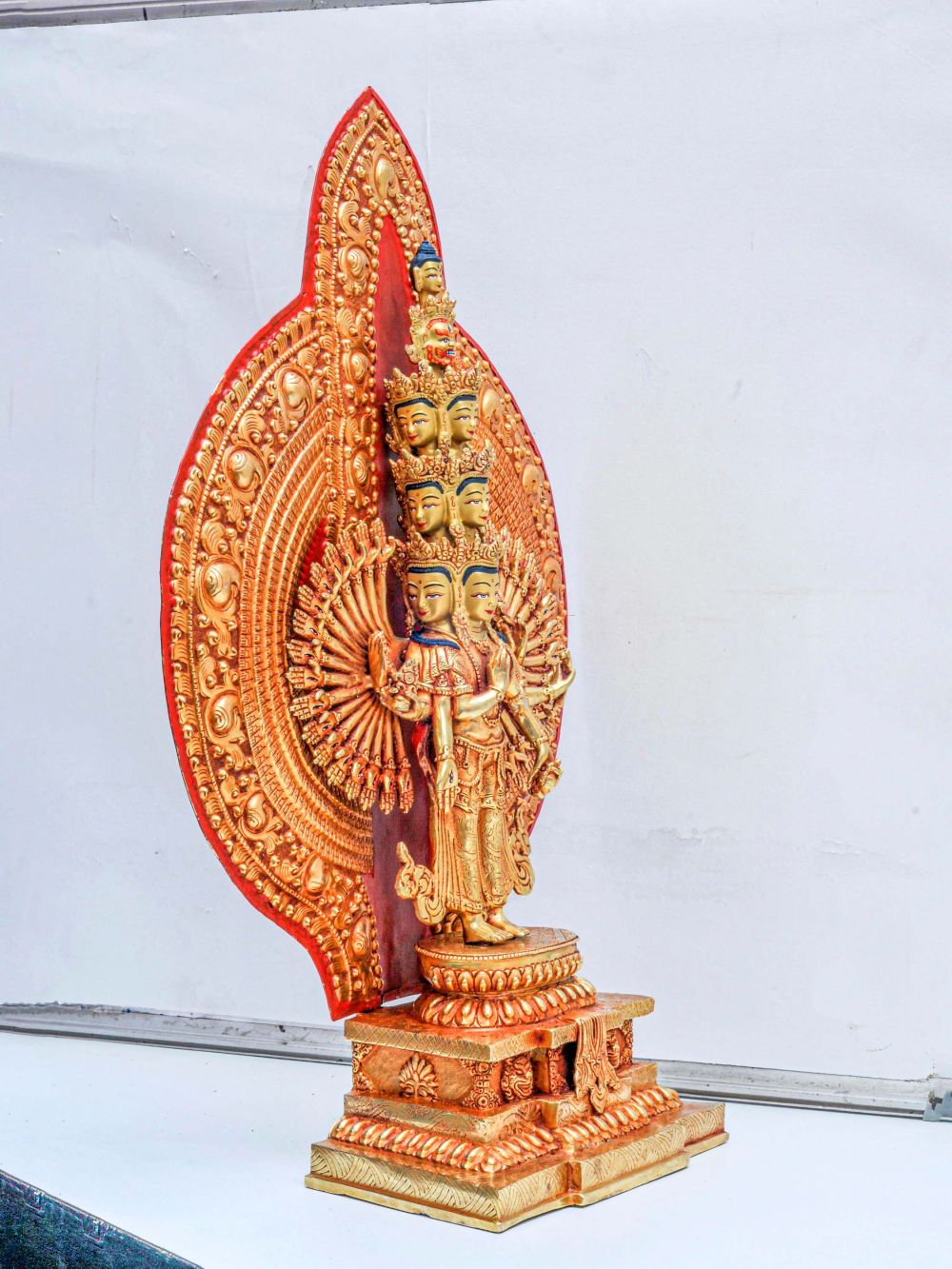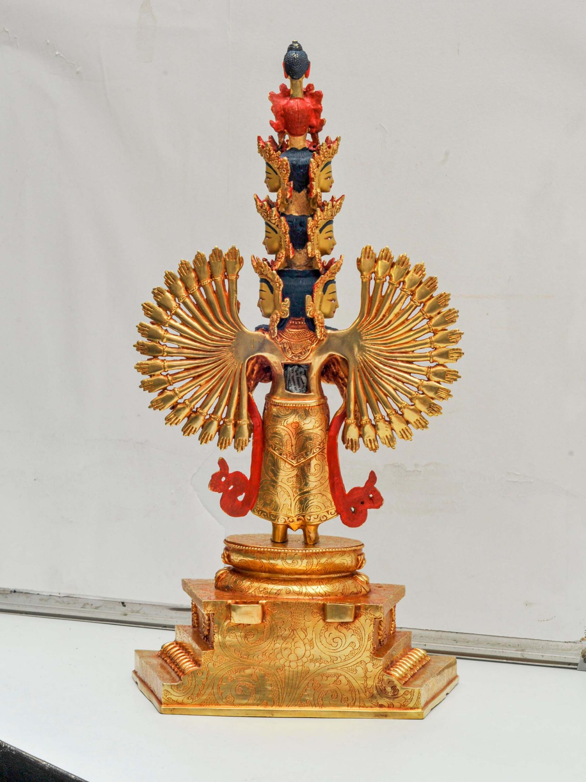 This exquisite statue represents Sahasrabhuja Avalokitesvara, the thousand-armed form of Avalokitesvara (Chenrezig), a powerful embodiment of infinite compassion in Mahayana Buddhism. Each of the thousand arms symbolizes the bodhisattva’s limitless capacity to help all sentient beings, while the central hands often hold symbolic objects or are posed in sacred mudras.