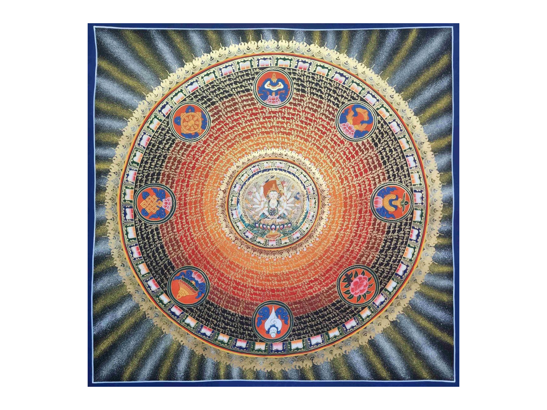 These symbols are often arranged in a mandala format, creating a balanced, harmonious composition that serves as a spiritual focal point for meditation and devotion.