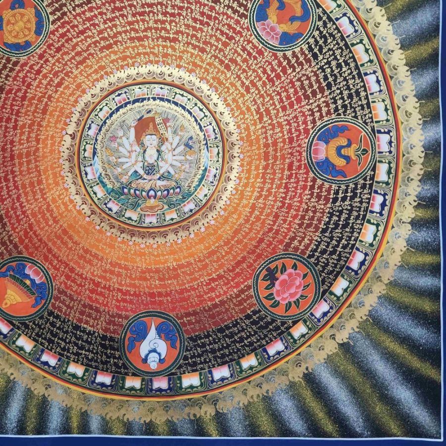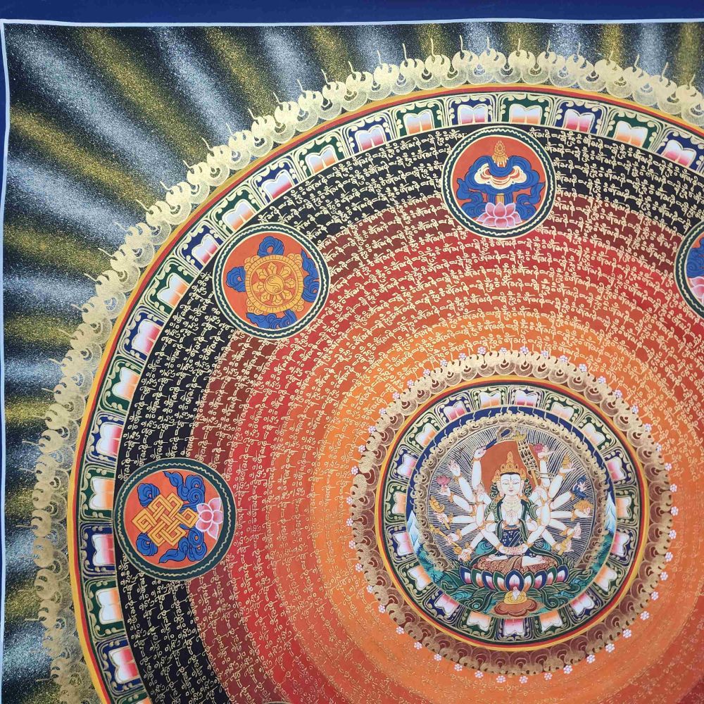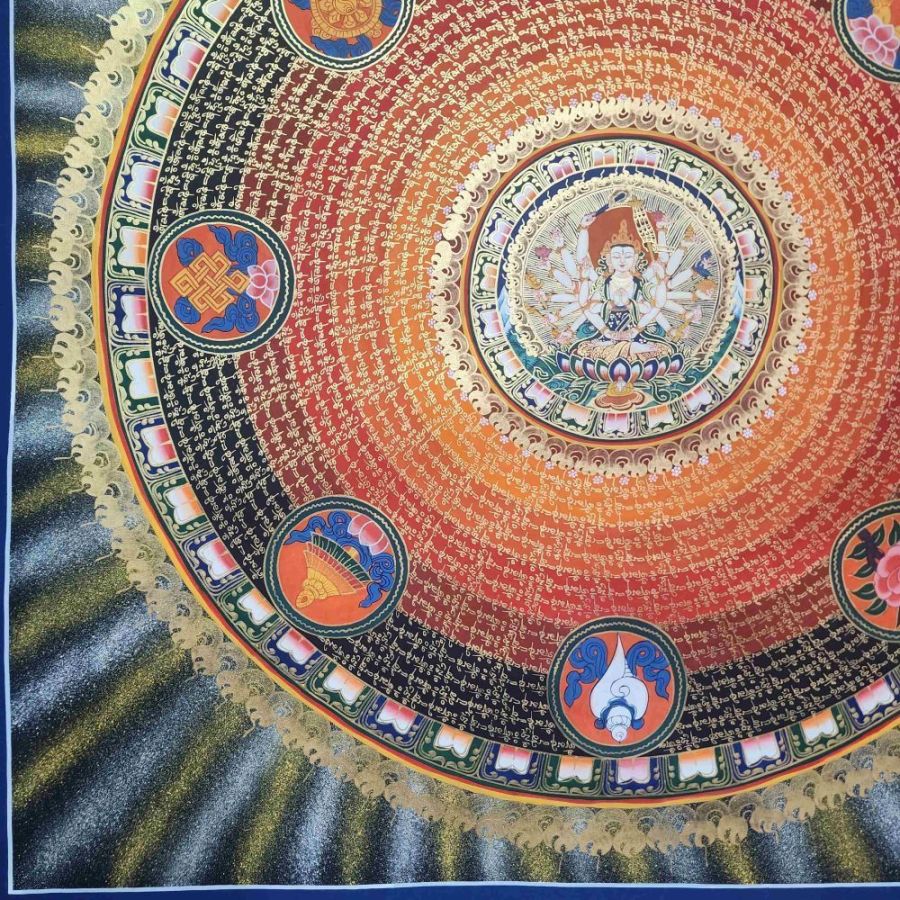 At the heart of this mandala is Chundi (also known as Cundi or Chandi), a revered deity in both Tibetan and Chinese Mahayana Buddhism. She is an embodiment of divine motherly compassion and supreme wisdom, associated with protection, purification, and wish-fulfillment. Often referred to as the Mother of the Seventy Million Buddhas, Chundi is venerated through her mantra and is believed to swiftly grant blessings to sincere devotees.