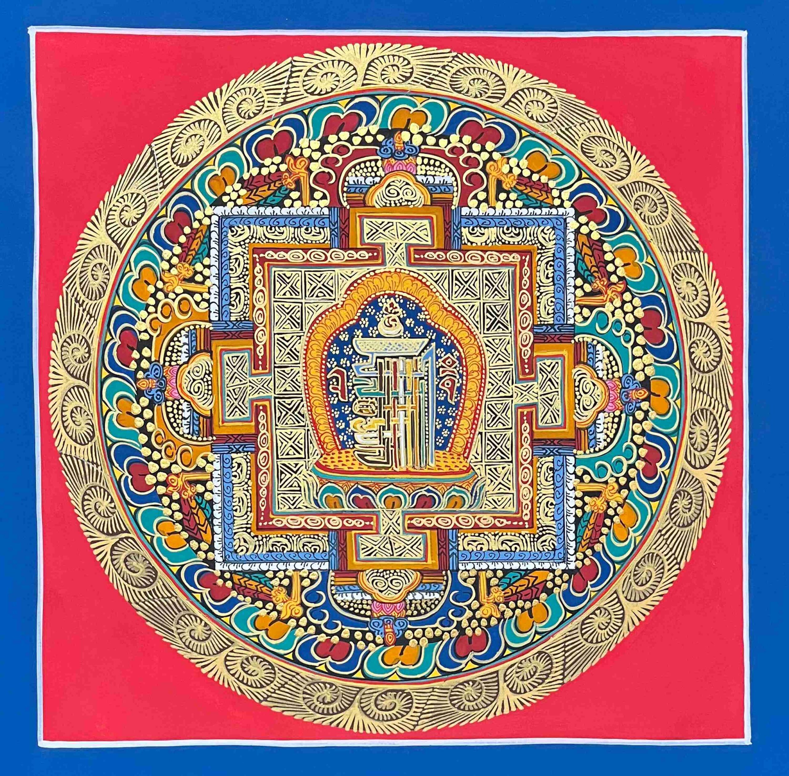 This hand-painted Old Kalachakra Mandala Thangka is crafted by a student artist dedicated to mastering the sacred art of Buddhist Thangka painting.
