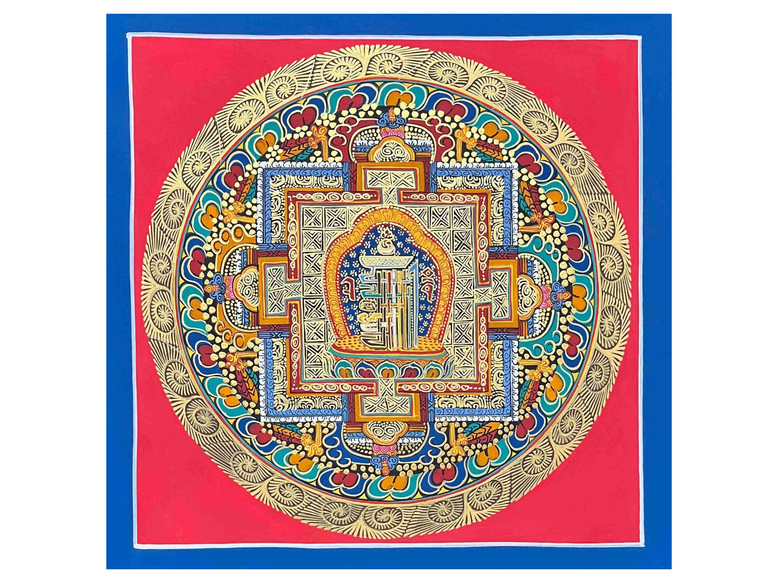 Intricate Geometric Design: The mandala’s concentric circles and sacred symbols represent the universe’s harmony and balance.