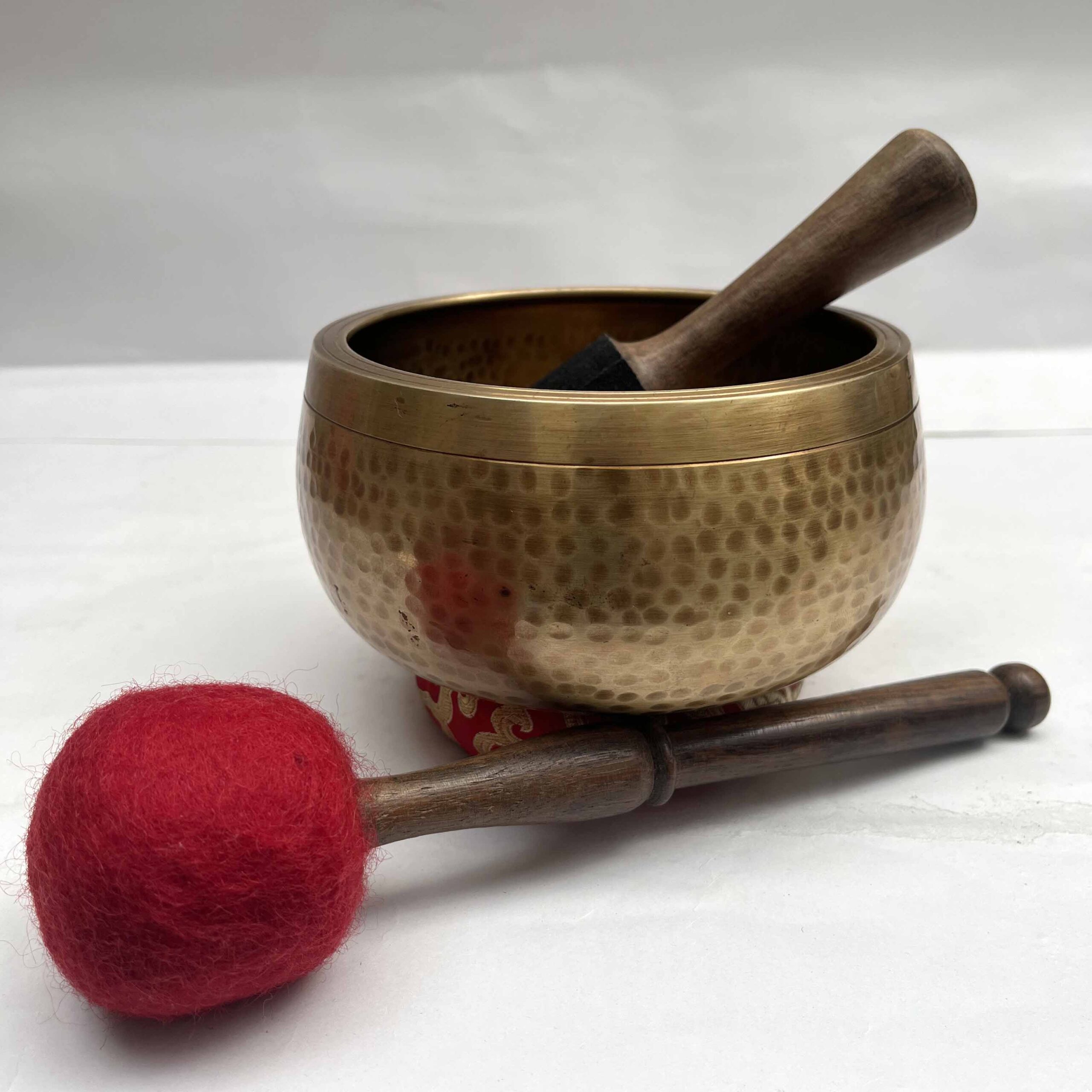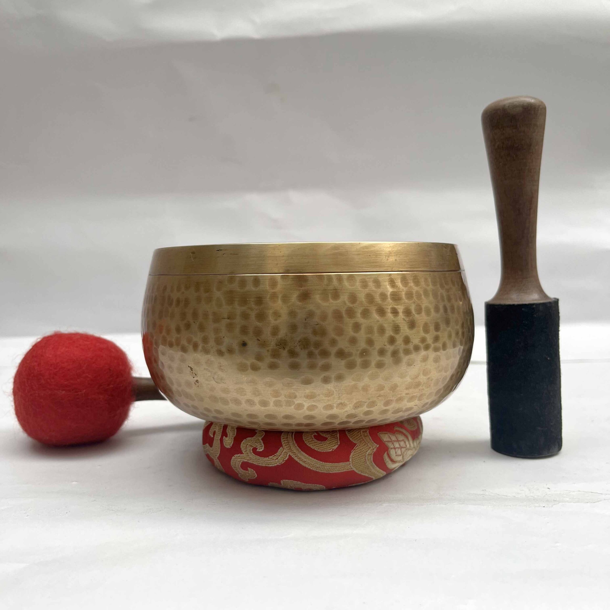 This handmade singing bowl is crafted using the casting process, often referred to as machine-made bowls (though this term is debated).