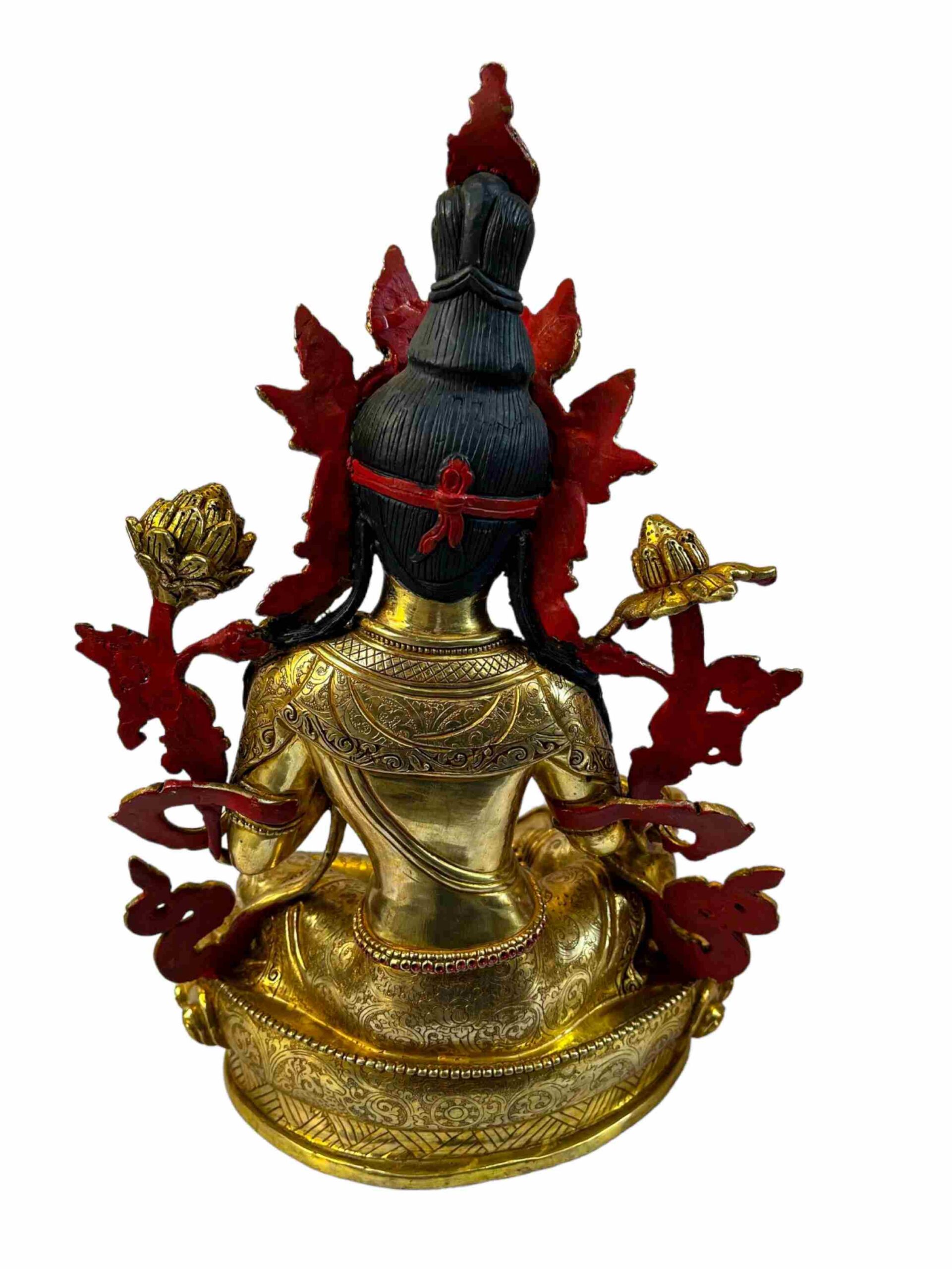 The face of this Green Tara is carefully hand-painted with pure gold to highlight her expressive eyes, lips, and facial serenity. This sacred ritual: