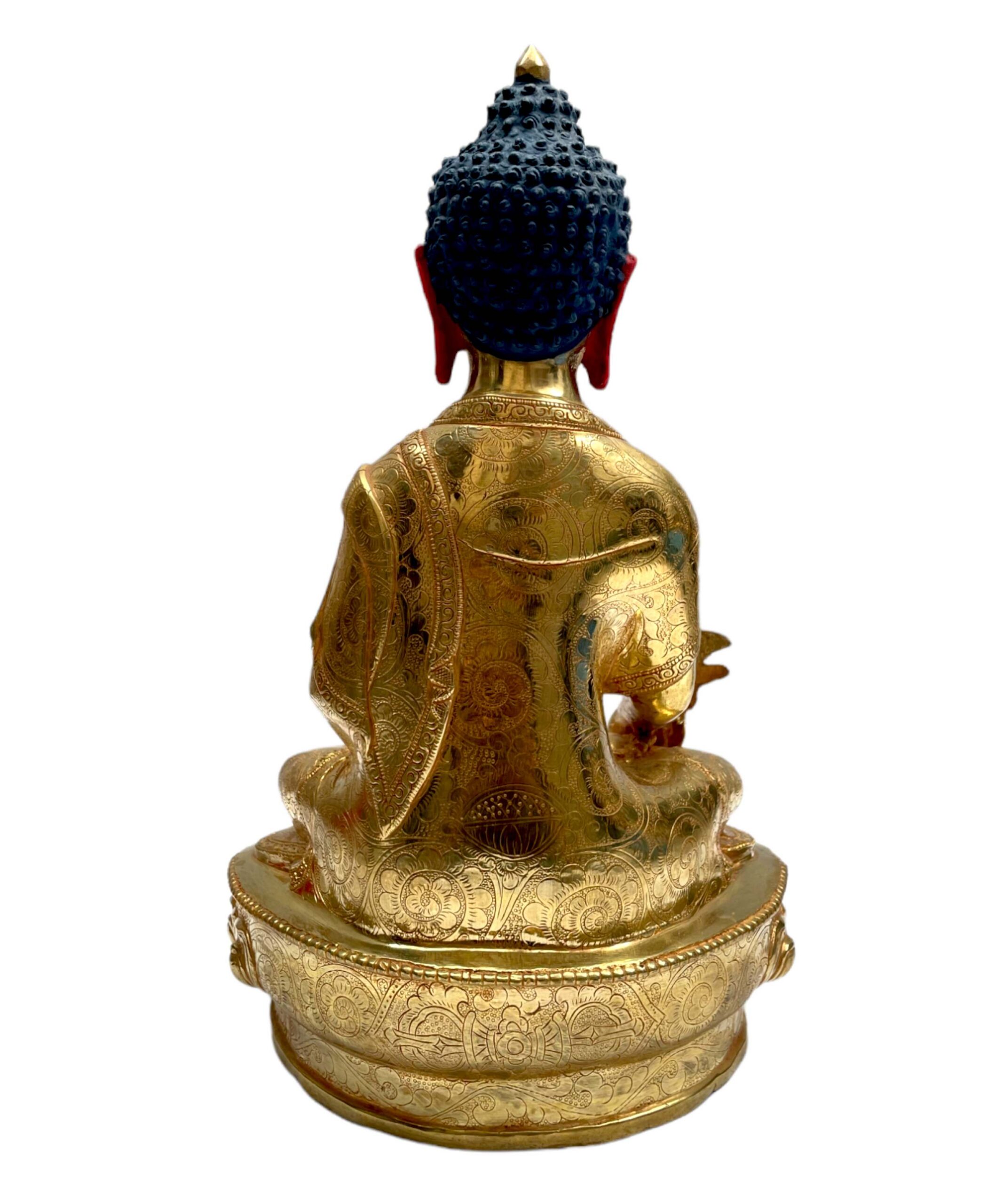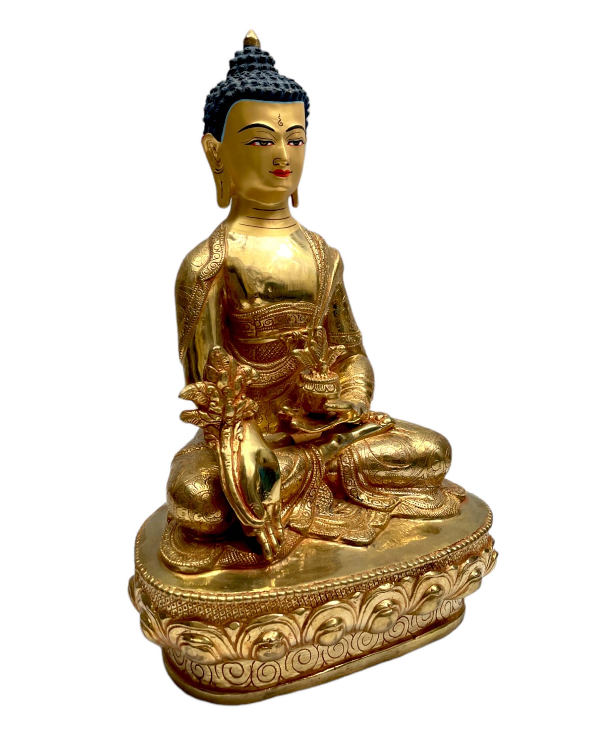 This Medicine Buddha is finished with full fire gold plating, also known as mercury gold plating or fire gold plating, a revered and traditional gold plating method in Nepal. The process involves applying a genuine gold layer to the statue, giving it a rich, radiant finish that enhances its beauty and spiritual energy.