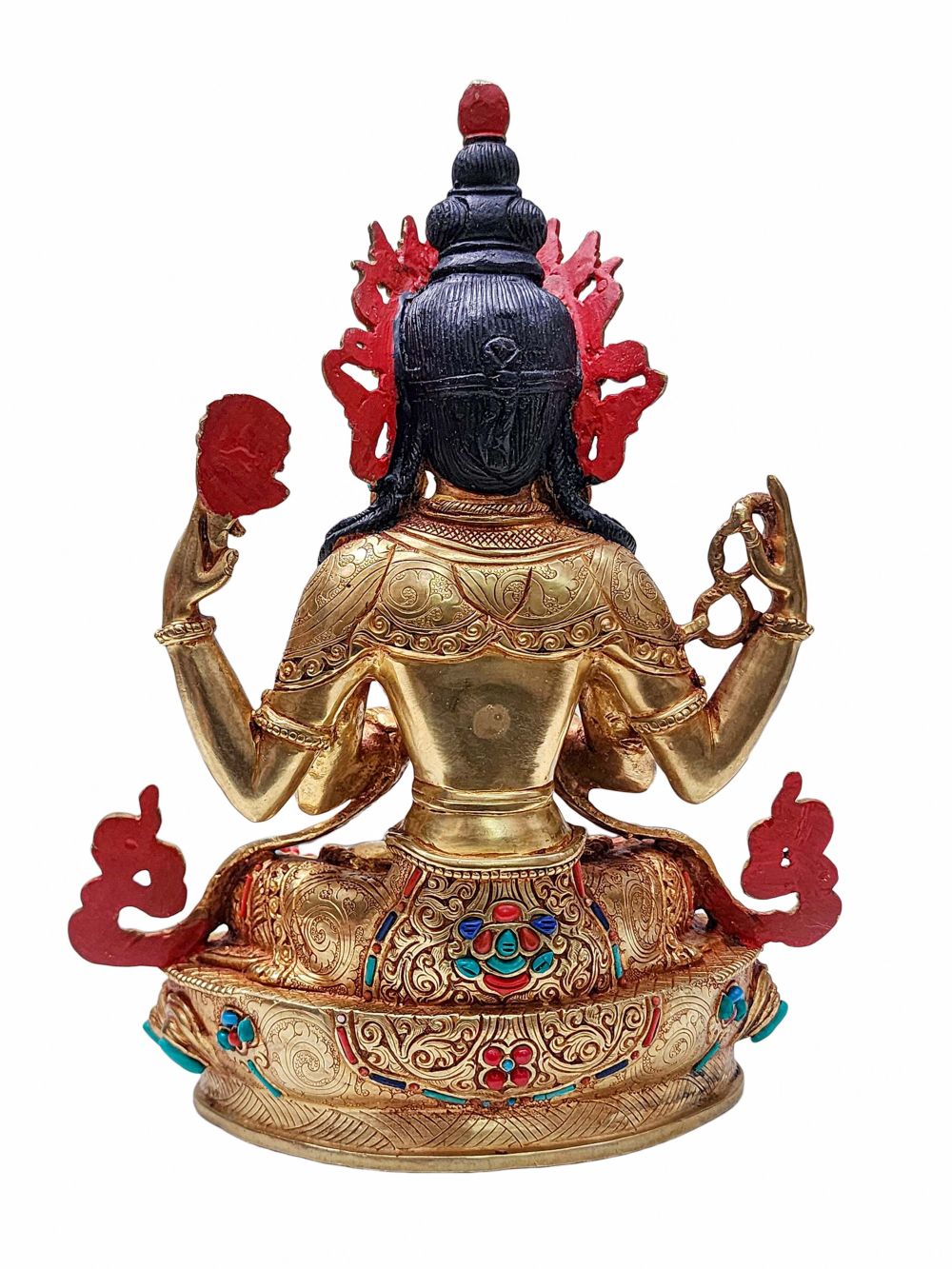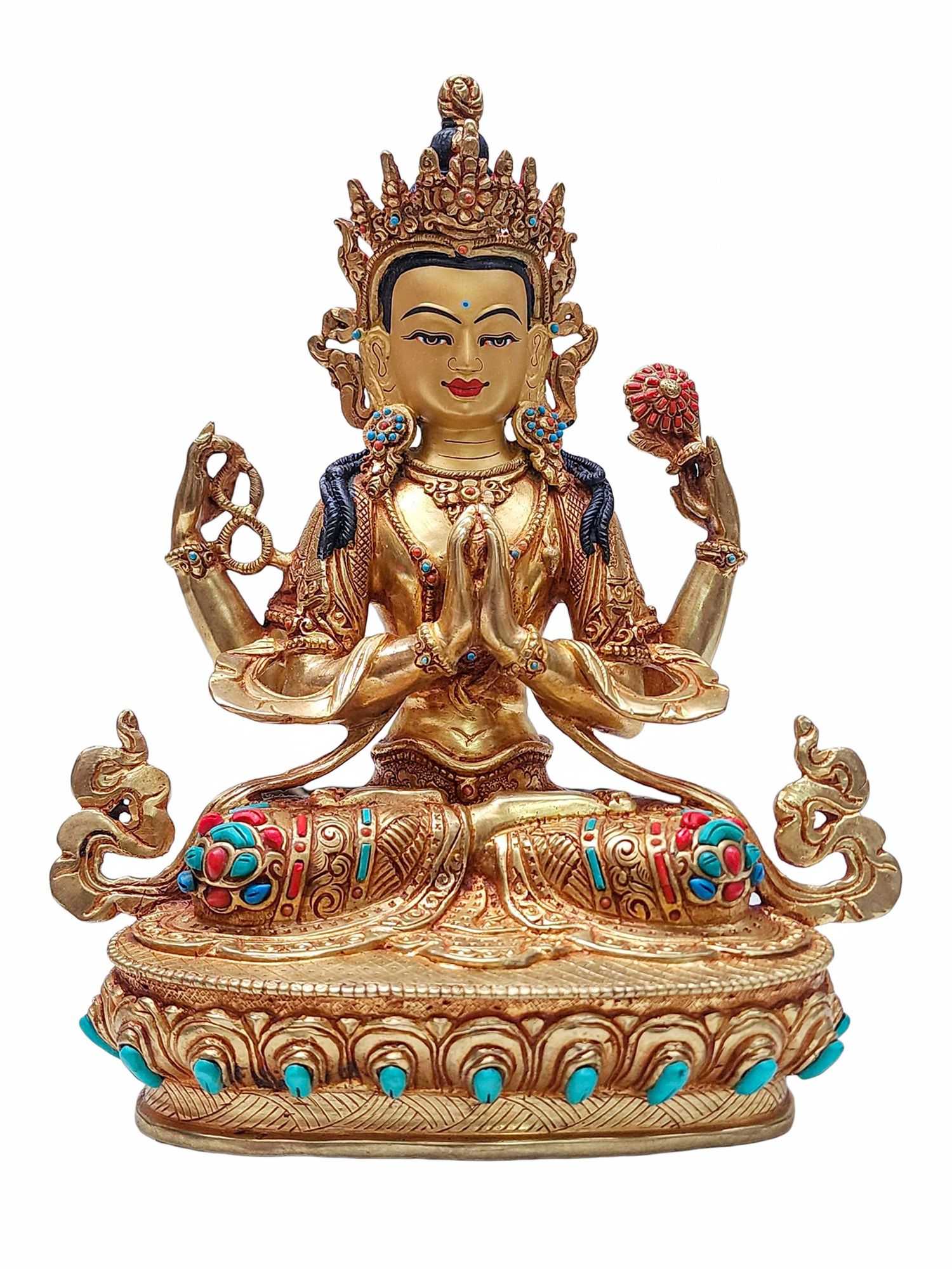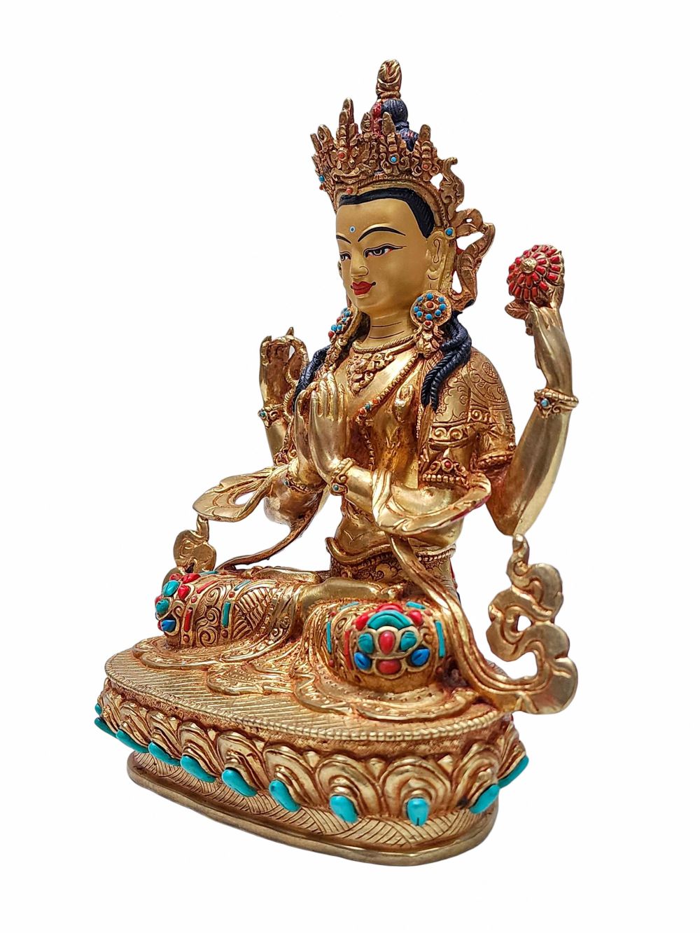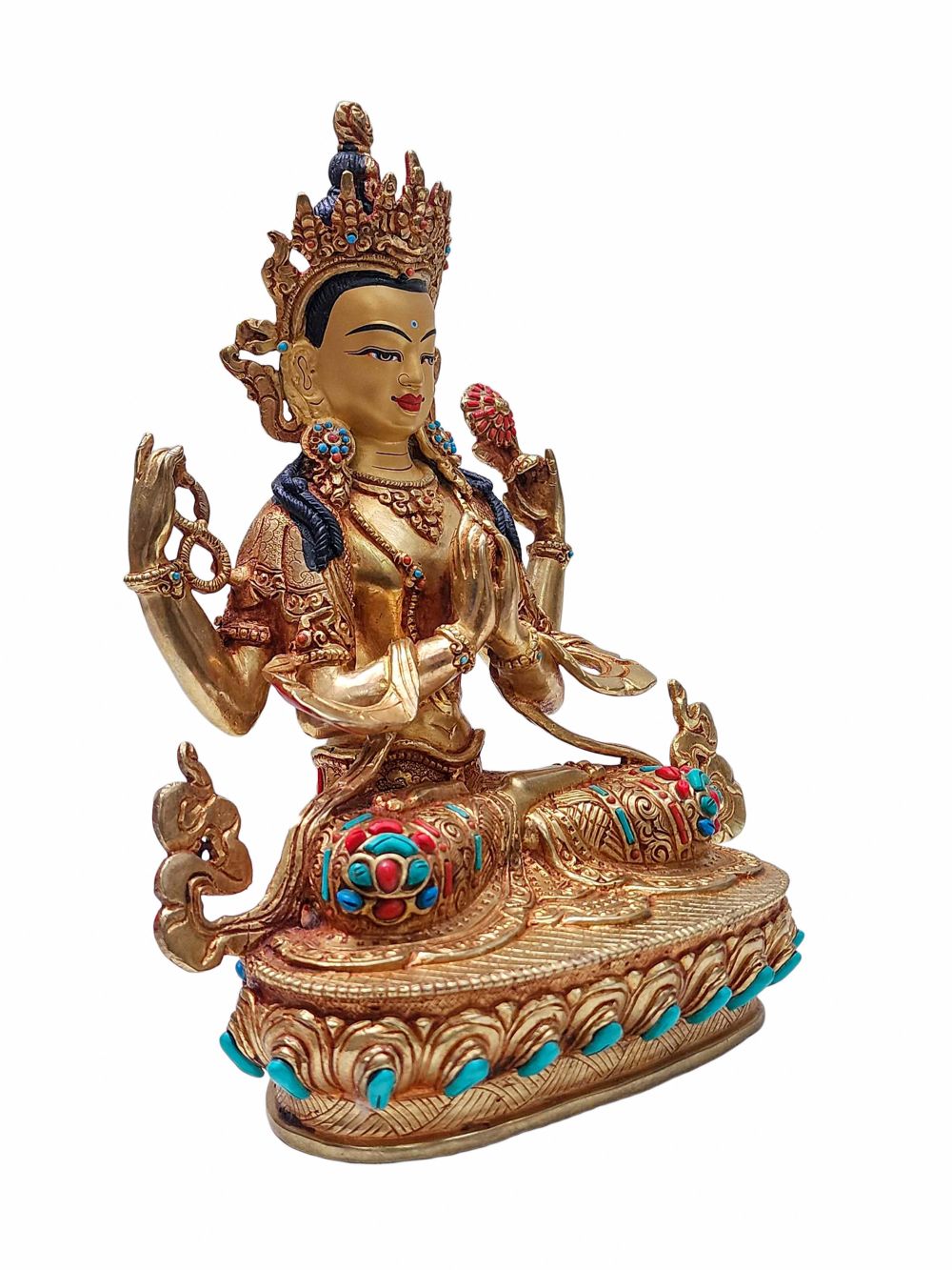This statue is intricately adorned with semi-precious stones including turquoise, coral, and lapis lazuli. These stones are carefully selected and hand-set with precision, adding elegance and depth to the sculpture. The vibrant hues of the stones stand out beautifully against the golden surface, enhancing both its aesthetic and spiritual appeal.