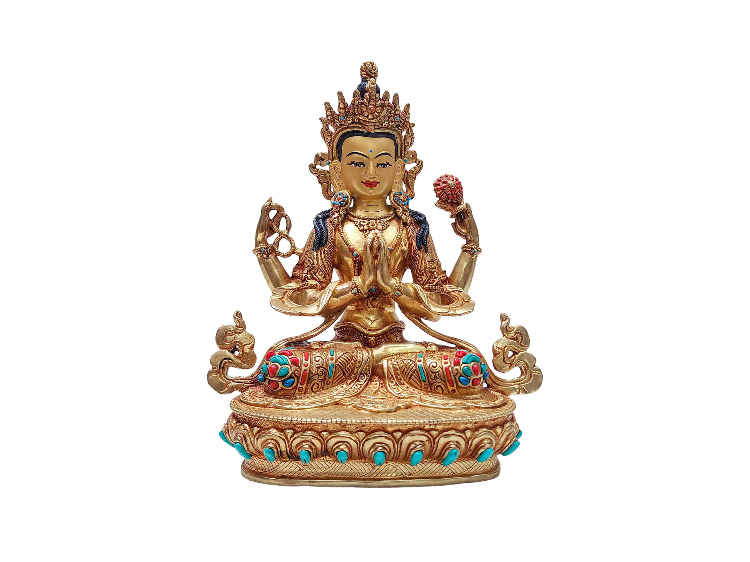 Chenrezig Buddhist Statue | Handmade Copper Sculpture | Full Fire Gold Plated | Face Painted | Stone Setting