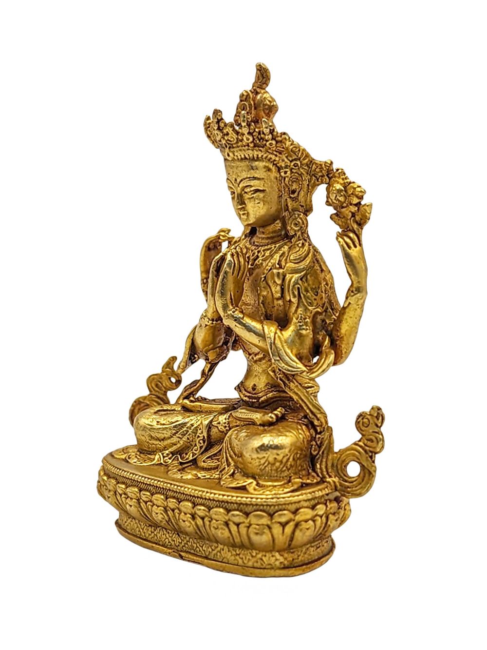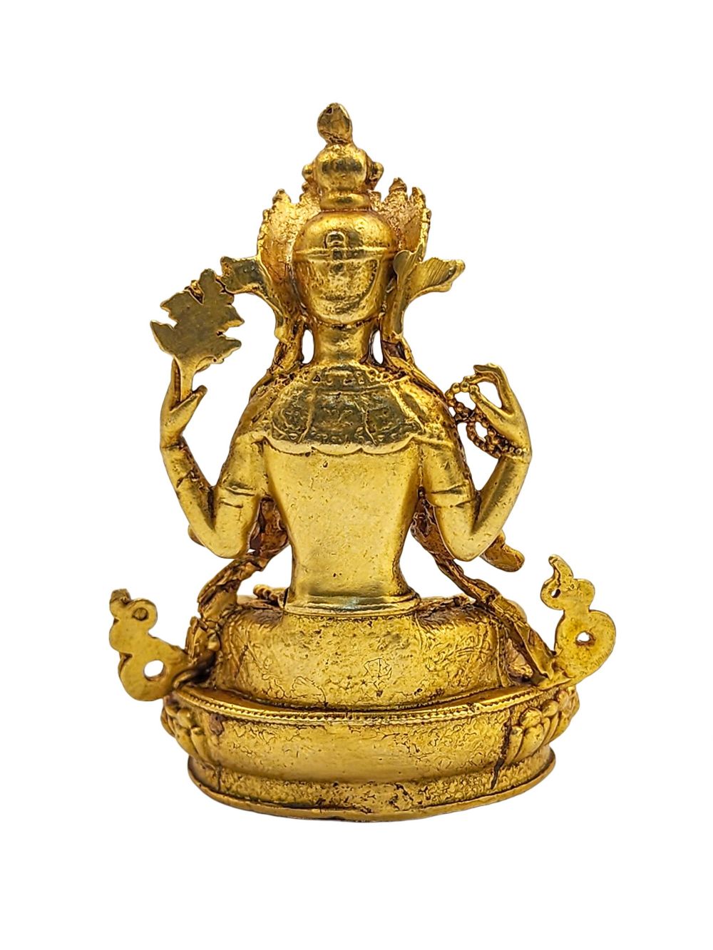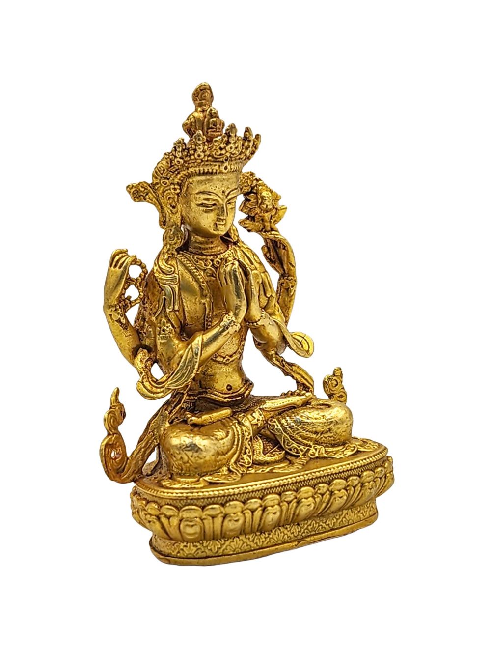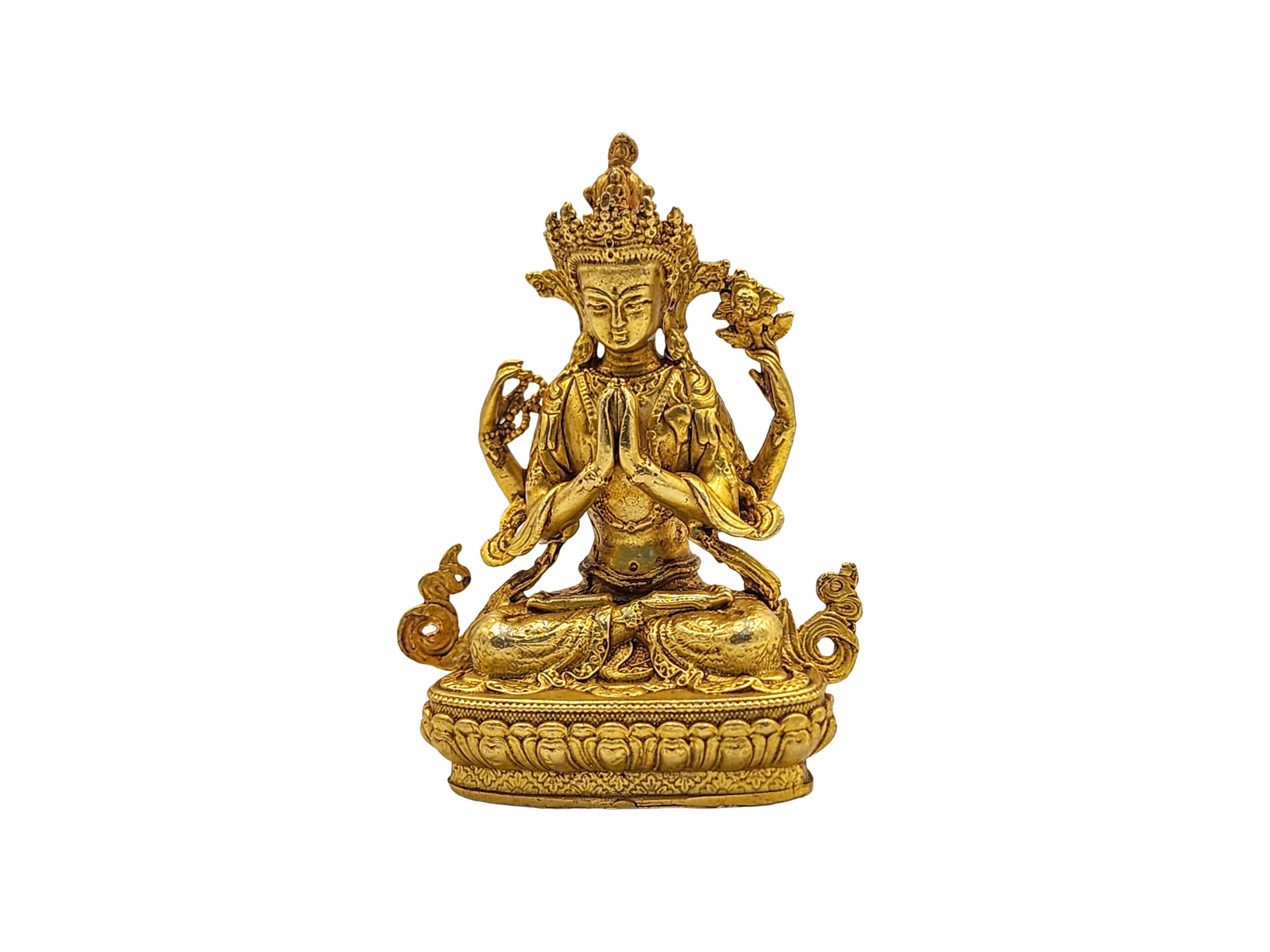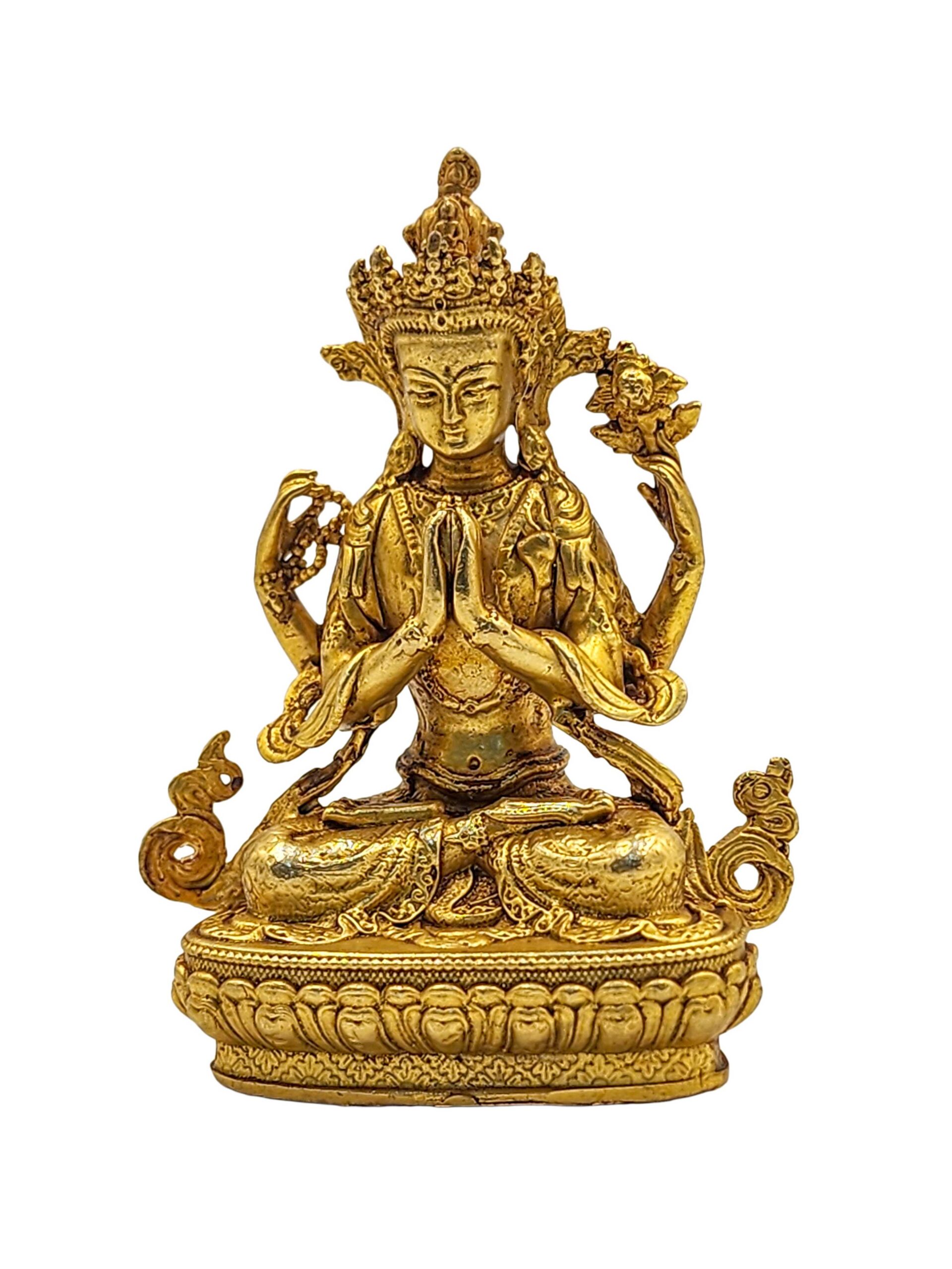 This Chenrezig statue is adorned with traditional full fire gold plating—also known as mercury gold plating. This method involves applying a genuine layer of gold through a meticulous and time-honored process practiced by skilled Nepalese artisans.