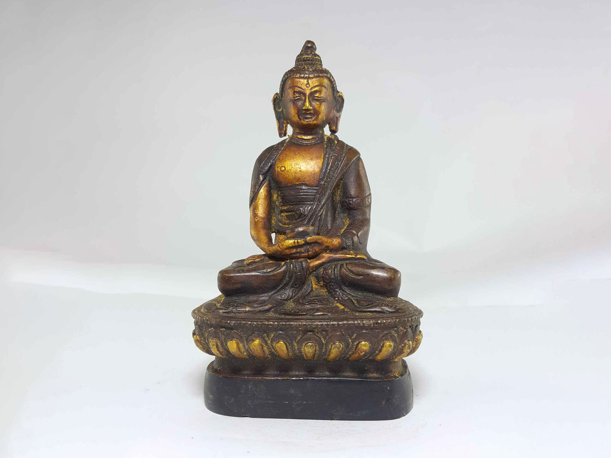 Copper Amitabha Buddha with Wooden Base and Antique Finishing