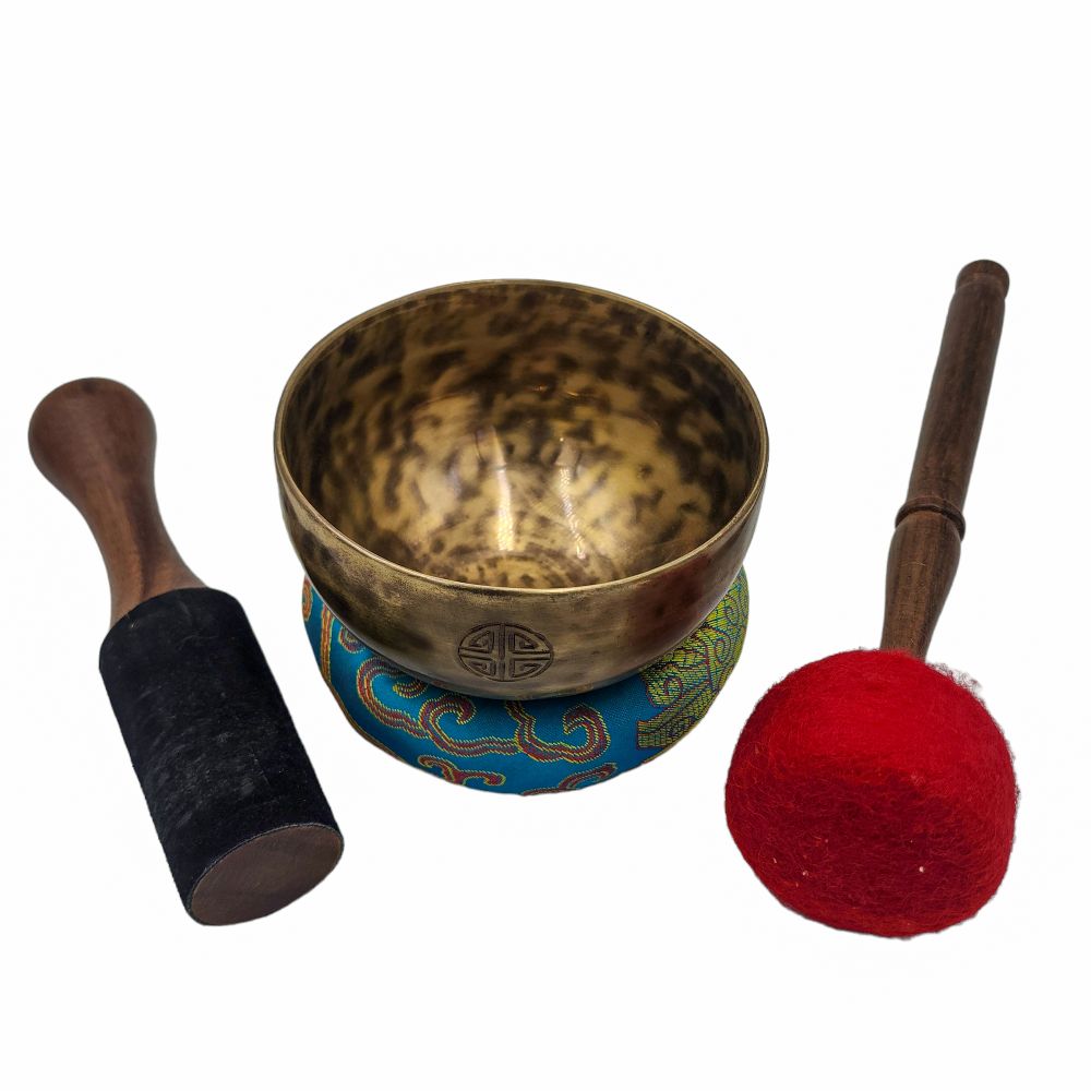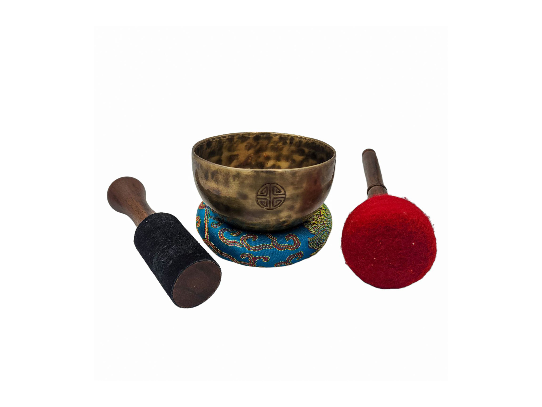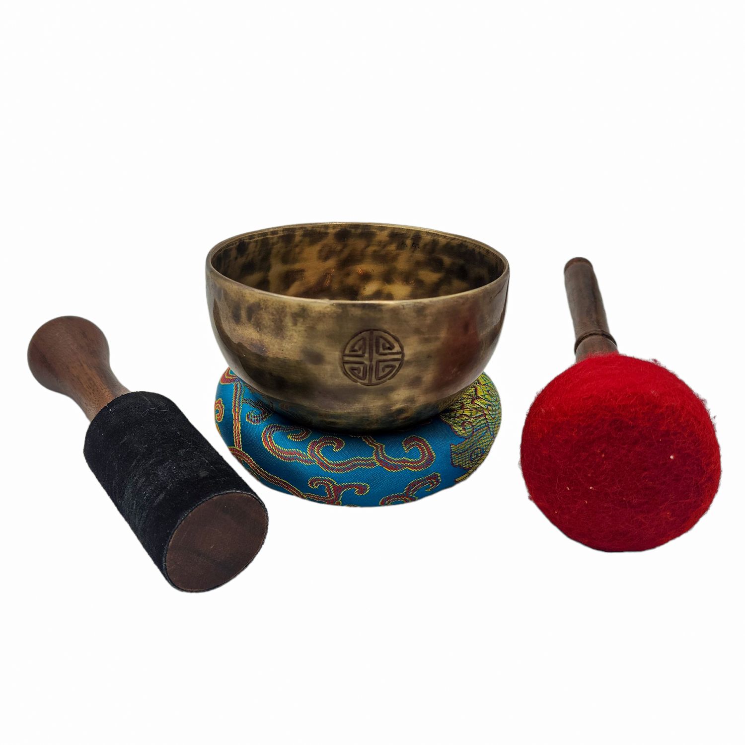Though newly crafted, this singing bowl features an antique-style finish, inspired by the character of traditional Tibetan singing bowls. Carefully selected from Kathmandu, each bowl carries unique markings and a rich tone that reflects its handcrafted quality.