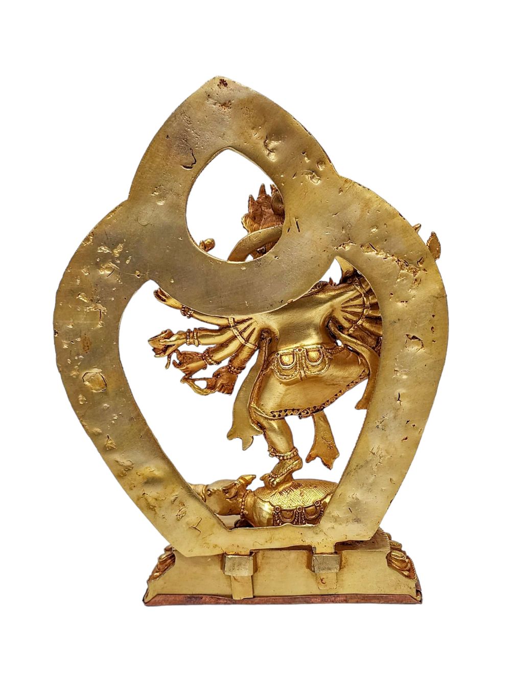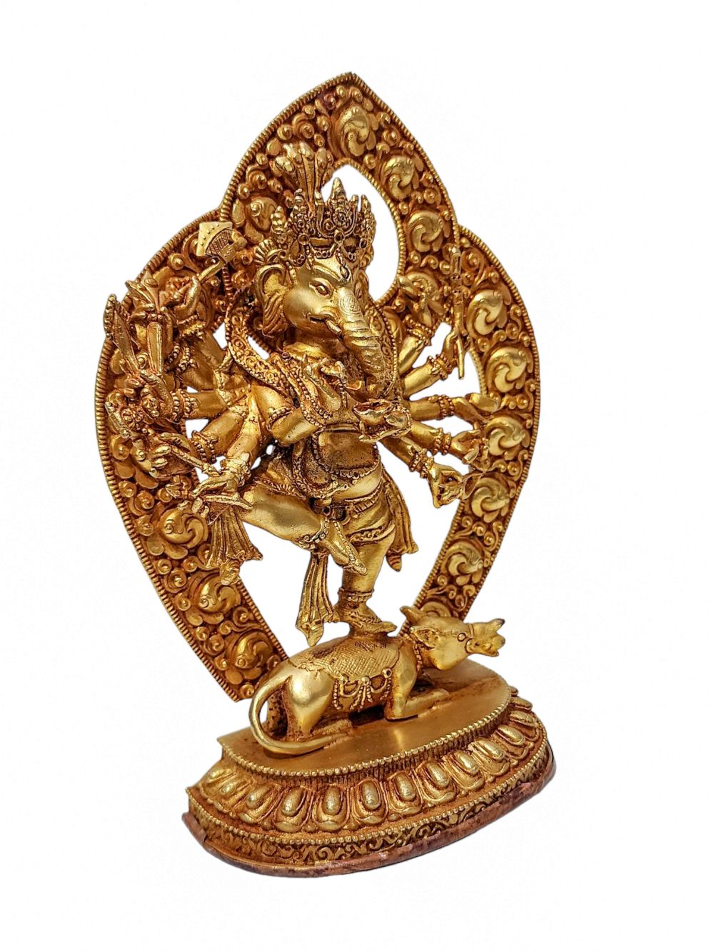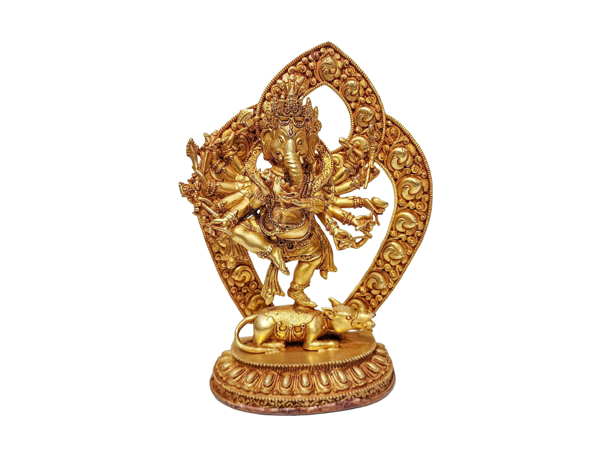 This Ganesh statue is finished with full fire gold plating, also known as mercury gold plating. This authentic and traditional Nepali technique involves applying a genuine layer of gold onto the sculpture. Though more costly than modern electroplating, mercury gold plating is prized for its durability, authenticity, and timeless beauty. The revival of this traditional method reflects growing appreciation for Nepal’s artisanal heritage and fine craftsmanship.