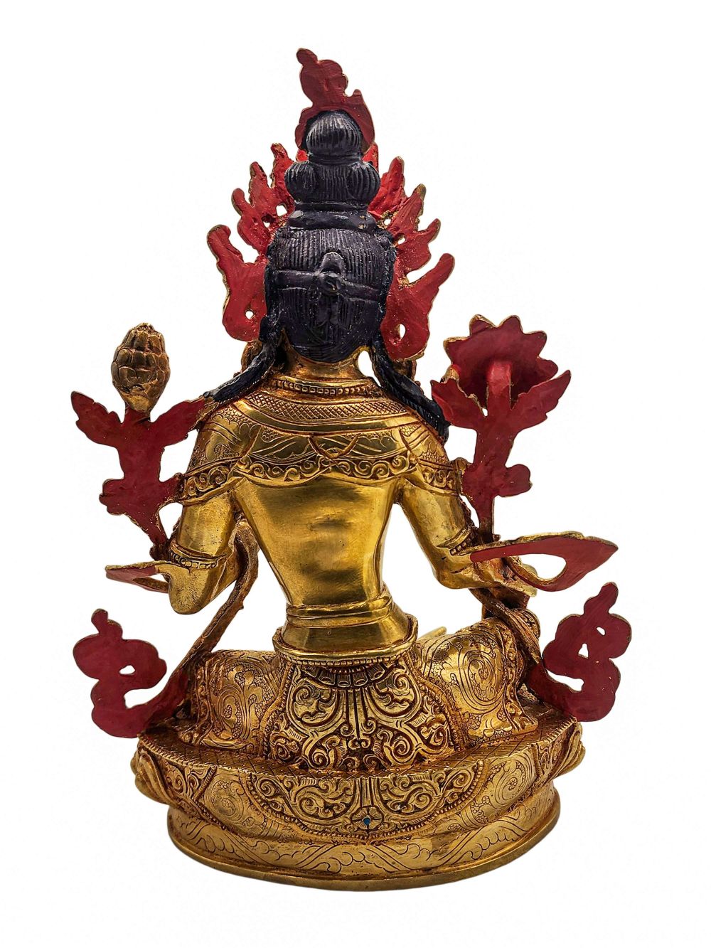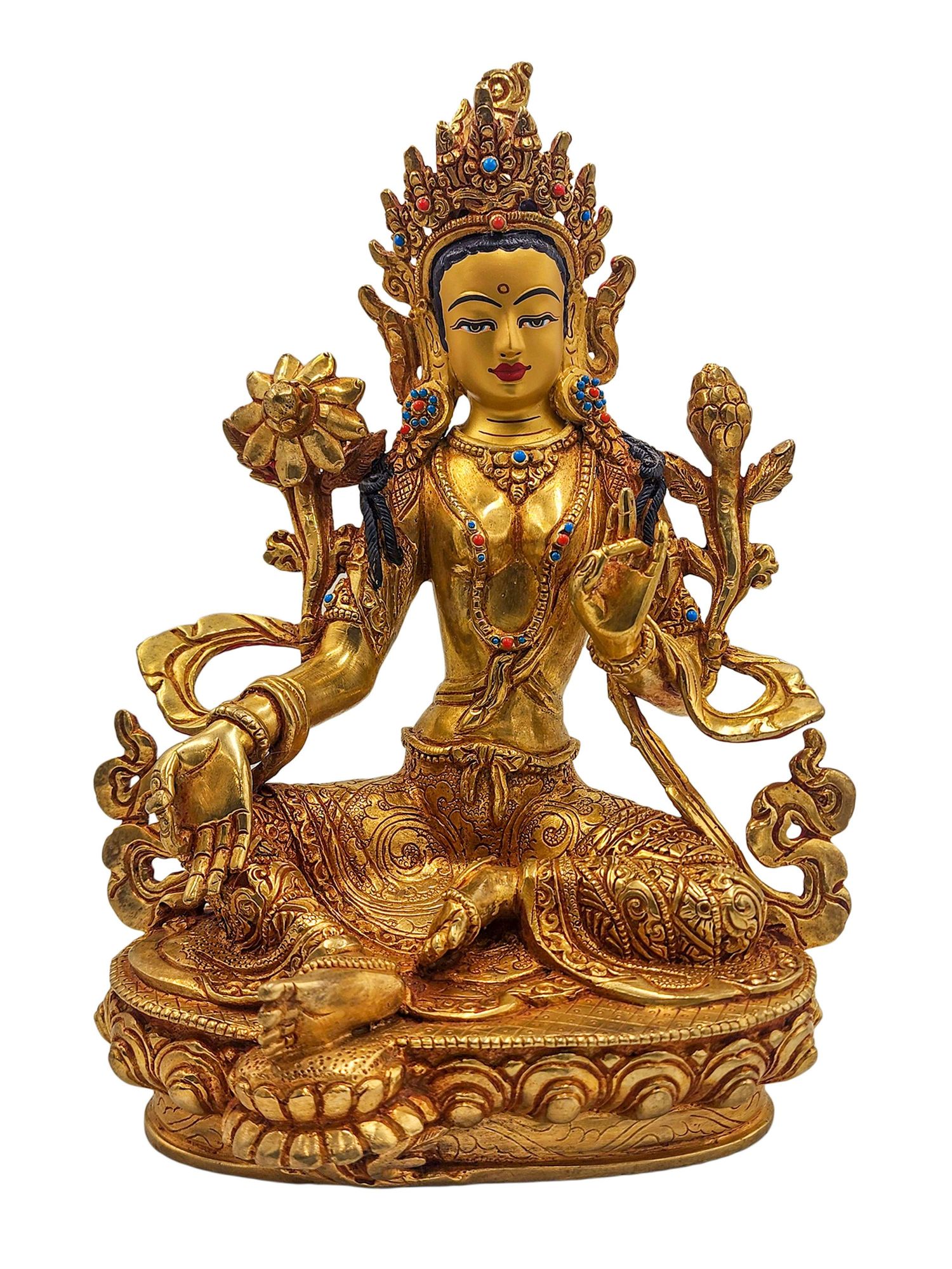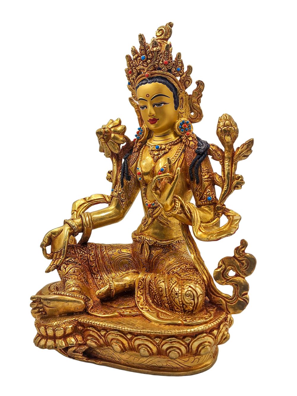 Green Tara is finished with traditional fire gold plating — also called mercury gold plating — a revered method in Nepalese metalwork. This process involves applying a genuine layer of gold to the copper surface, resulting in a warm, radiant glow that outshines electroplating in both beauty and durability. Though more costly and labor-intensive, fire gold plating is highly valued for its authenticity and longevity, offering a finish that will last for generations.