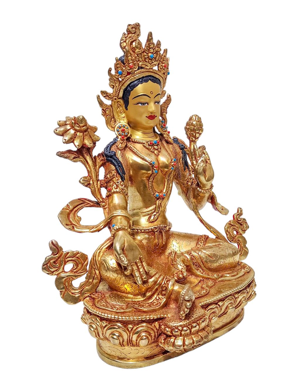 Green Tara – Buddhist Handmade Statue, Gold Plated and Face Painted