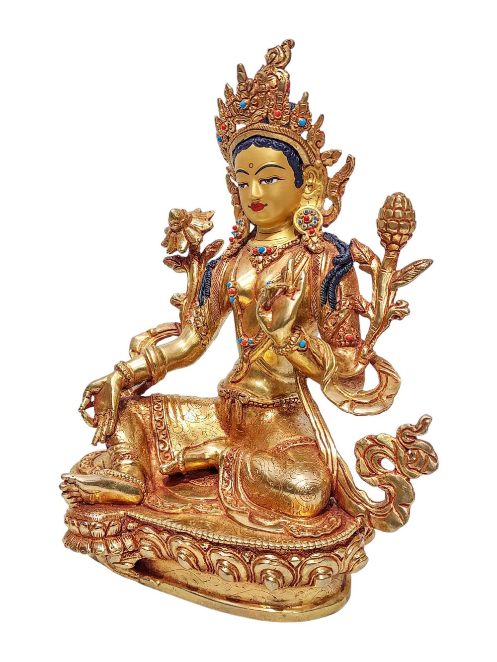 This Green Tara is embellished with semi-precious stones such as turquoise, coral, and lapis lazuli. Each stone is carefully chosen and precisely set to enhance the statue’s elegance. The vibrant colors and natural patterns of the stones create a striking contrast with the statue’s gold surface, elevating its beauty and making it visually captivating.