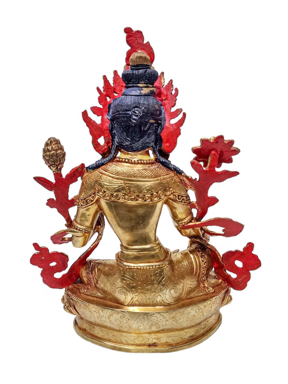 The statue is finished with traditional mercury gold plating, also known as fire gold plating. This authentic Nepali technique involves applying a genuine layer of gold to the surface, producing unmatched brilliance and durability. Although more costly than electroplating, this method is revered for its cultural authenticity and long-lasting beauty—making it a highly valued form of finishing.