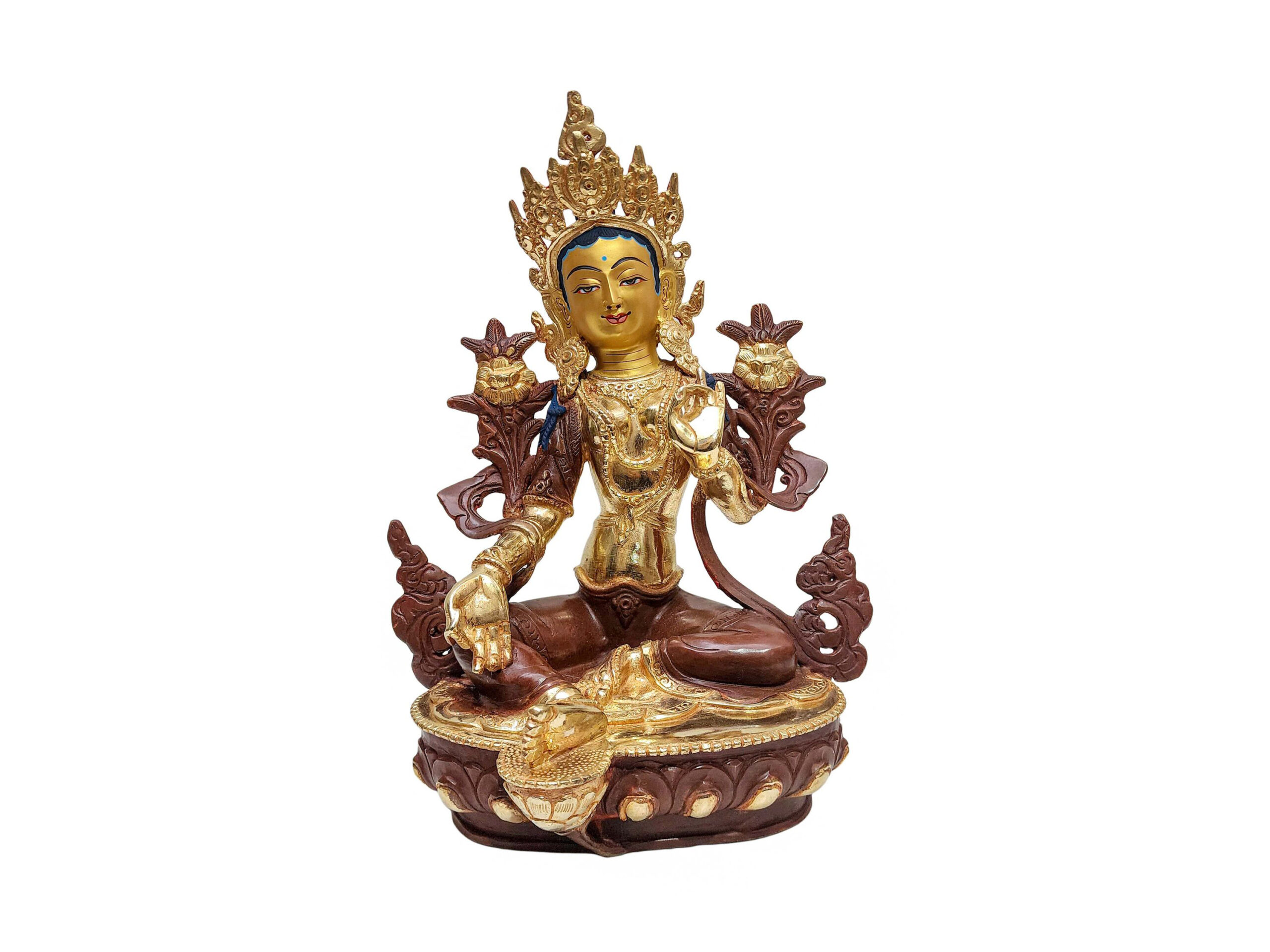 Green Tara, Buddhist Handmade Statue, Partly Gold Plated and Face Painted