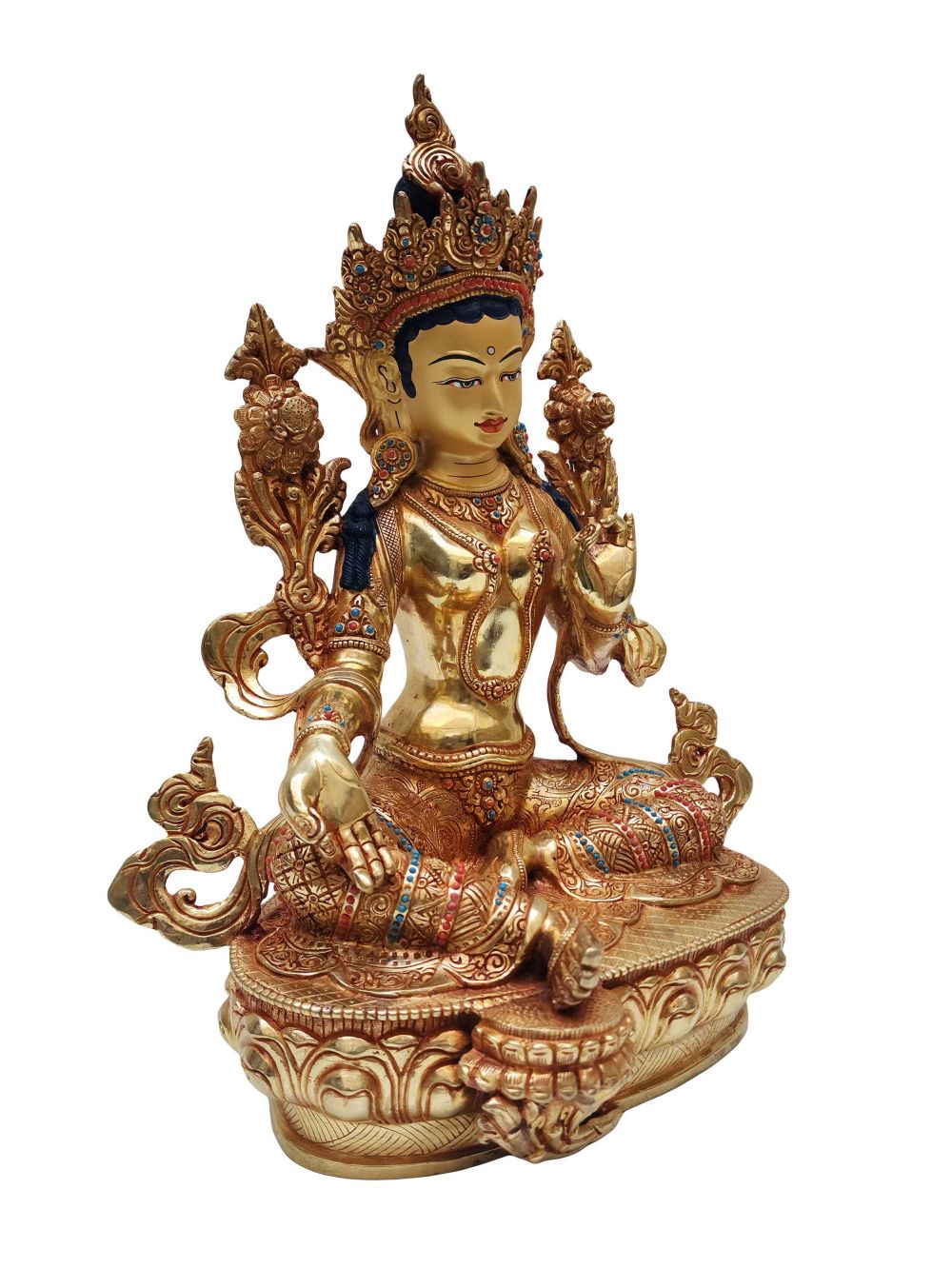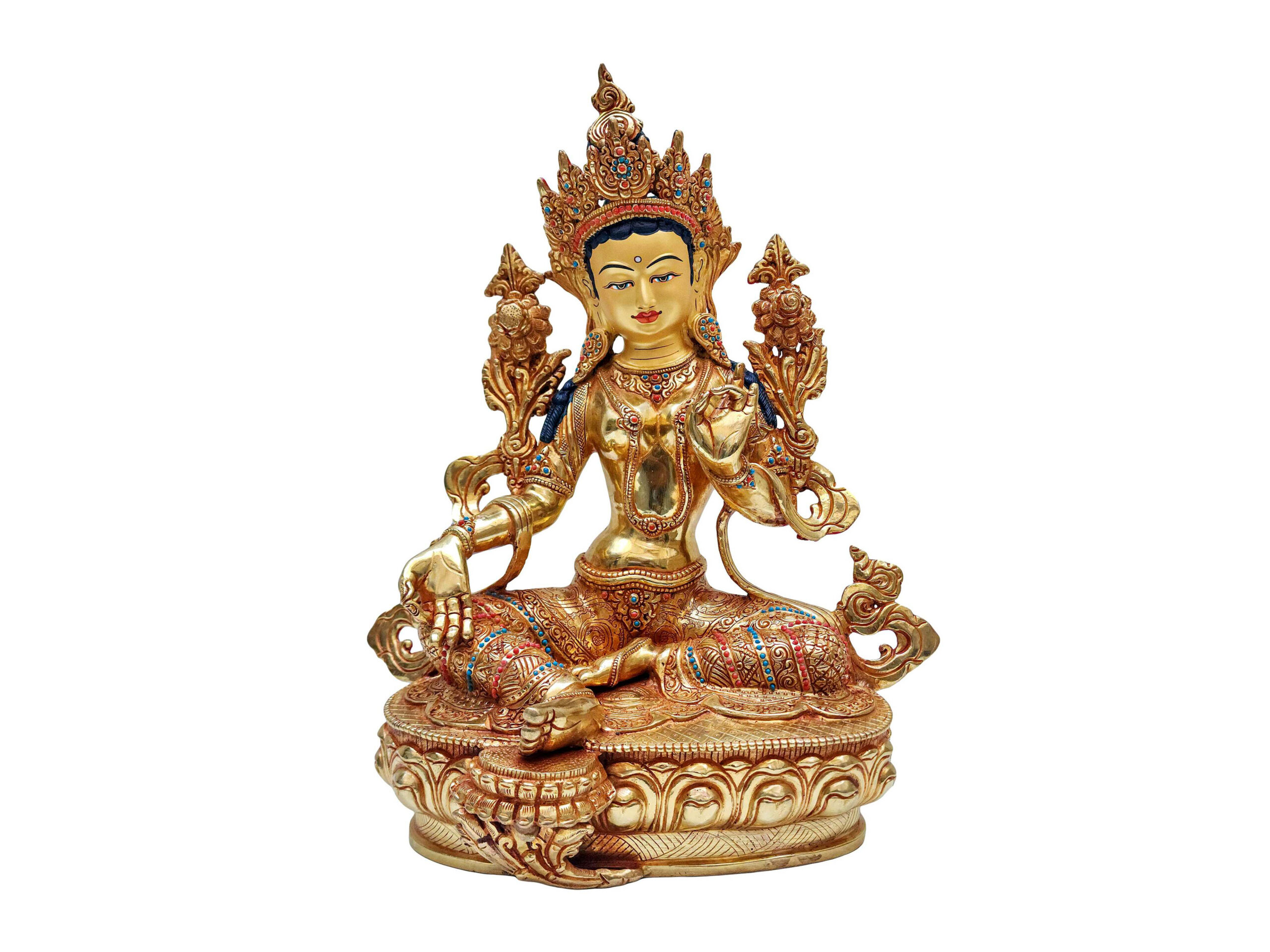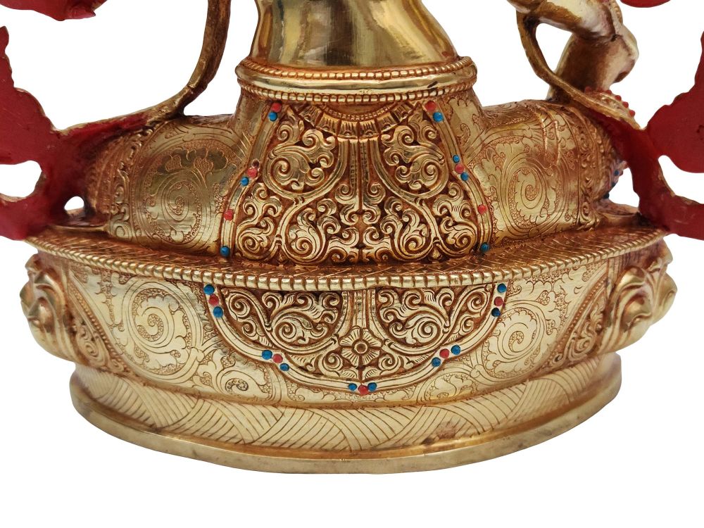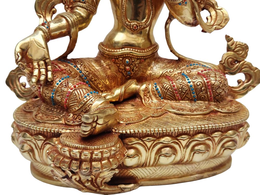 To enhance its visual and spiritual appeal, this statue is adorned with semi-precious stones such as turquoise, coral, and lapis lazuli. Each stone is hand-set with precision, adding vibrant color and texture that contrasts beautifully with the gold plating. The intricate stonework not only enriches the statue aesthetically but also contributes to its sacred symbolism.