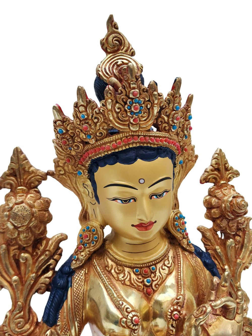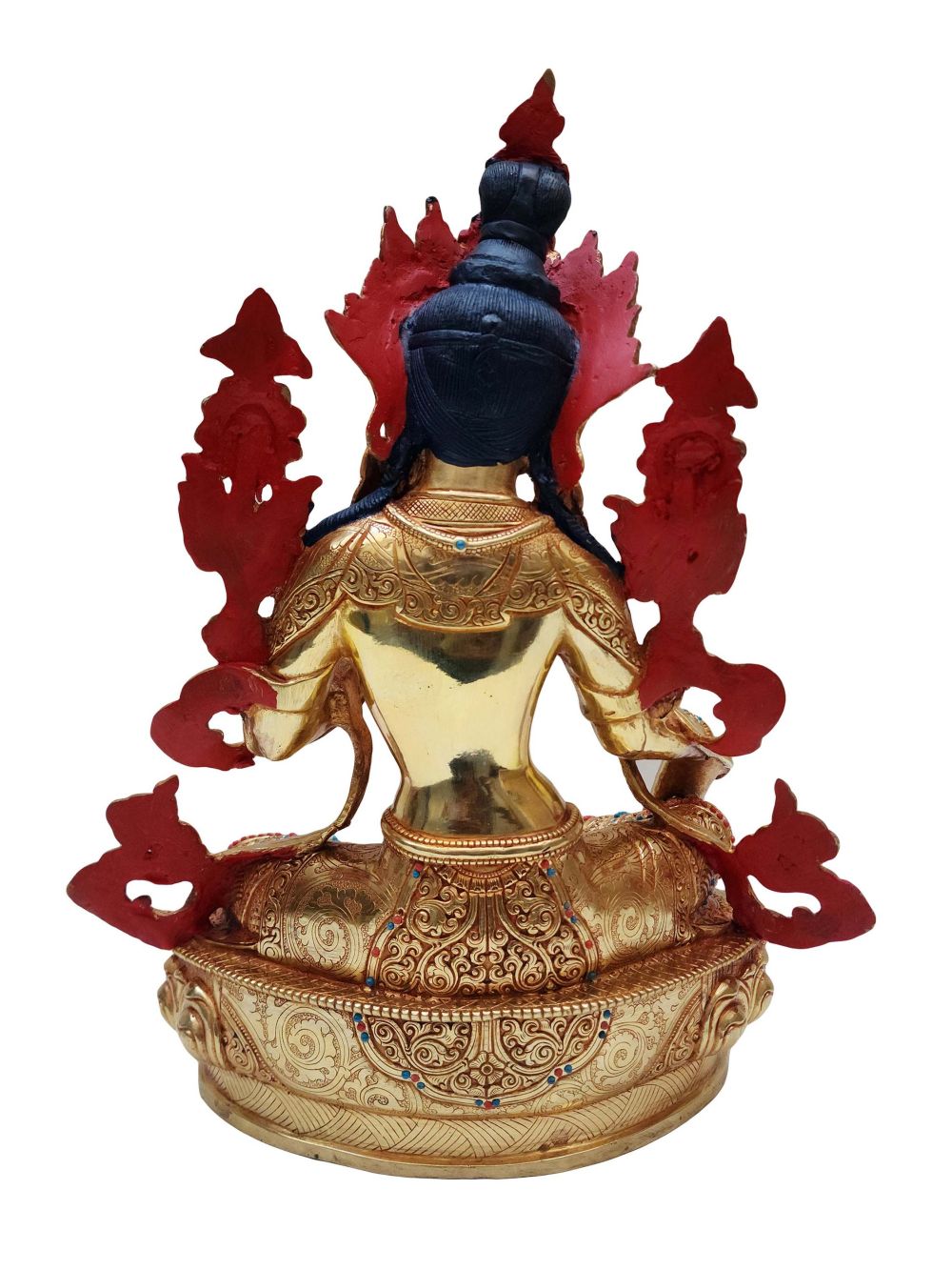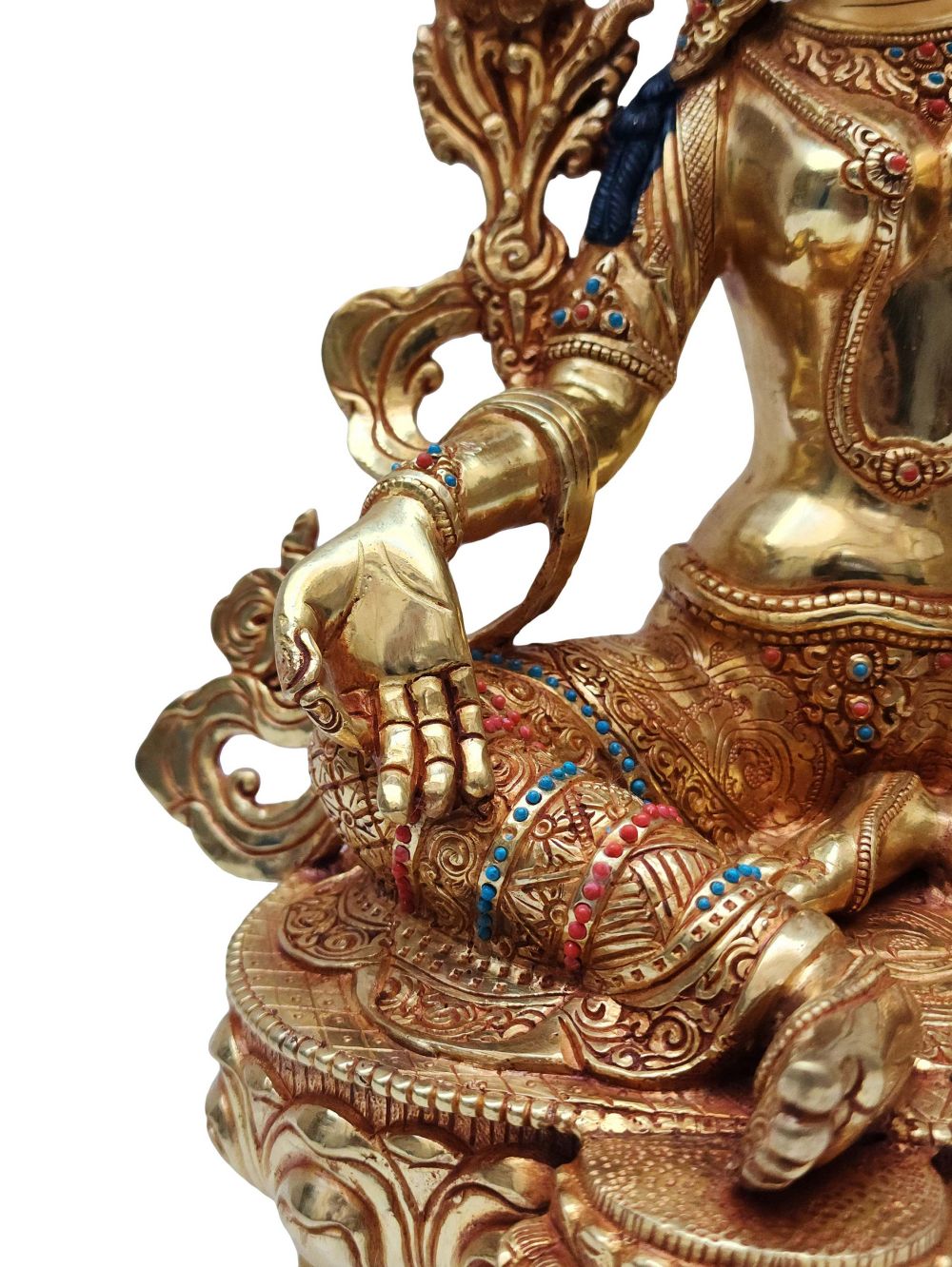 To enhance its visual and spiritual appeal, this statue is adorned with semi-precious stones such as turquoise, coral, and lapis lazuli. Each stone is hand-set with precision, adding vibrant color and texture that contrasts beautifully with the gold plating. The intricate stonework not only enriches the statue aesthetically but also contributes to its sacred symbolism.