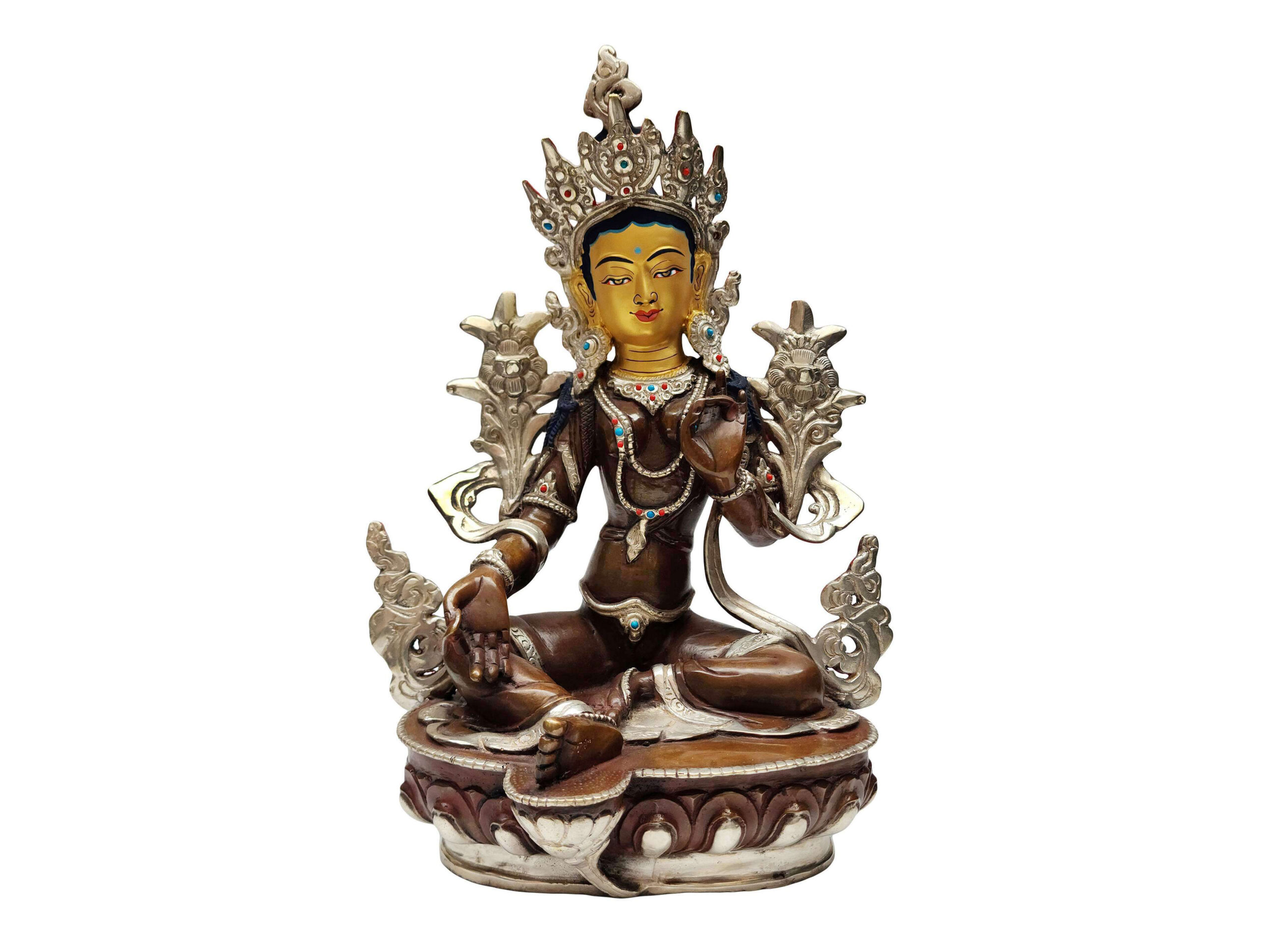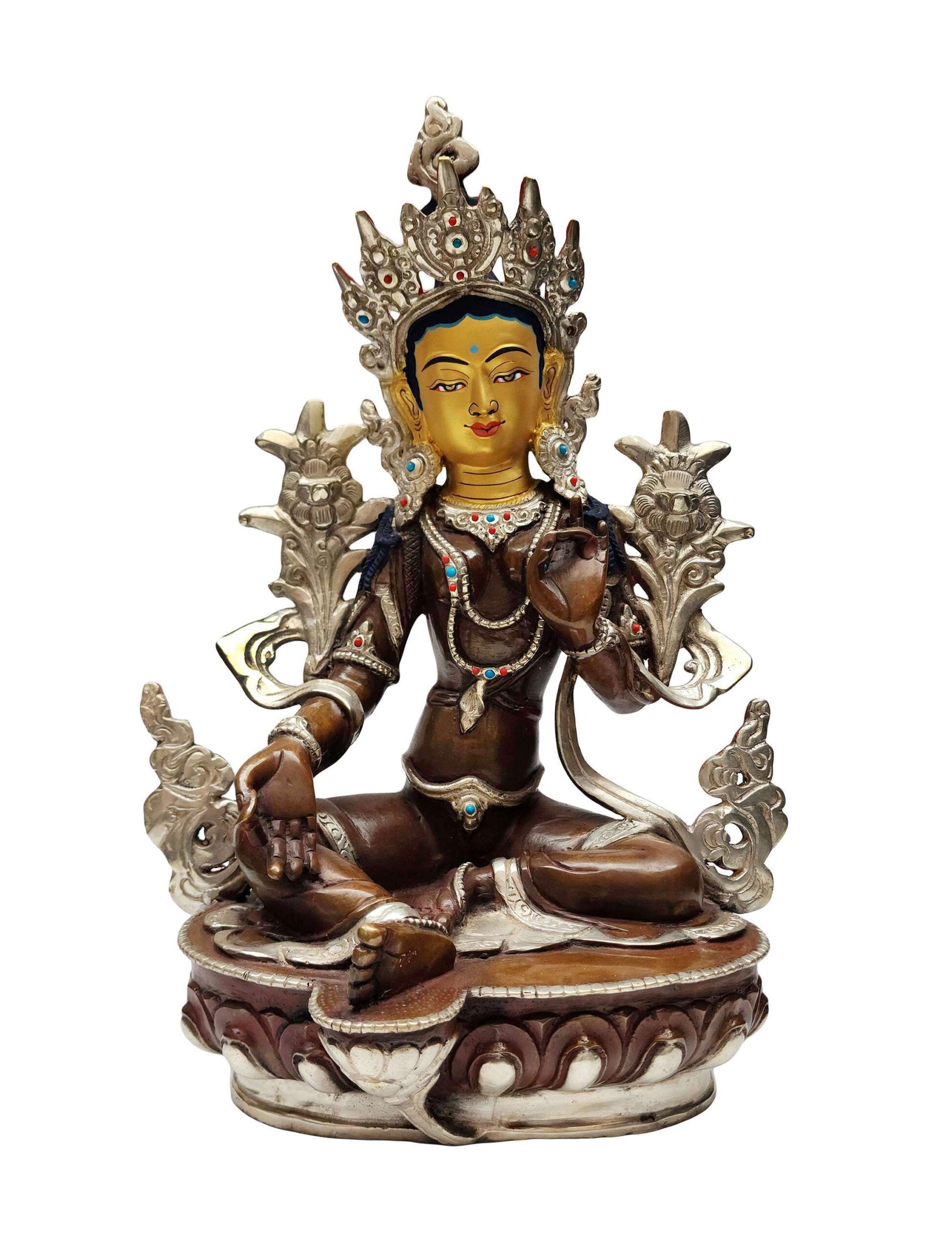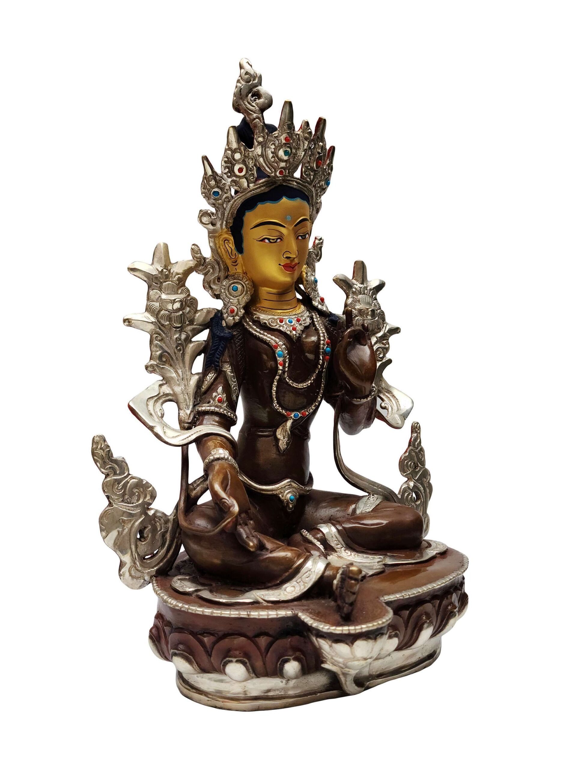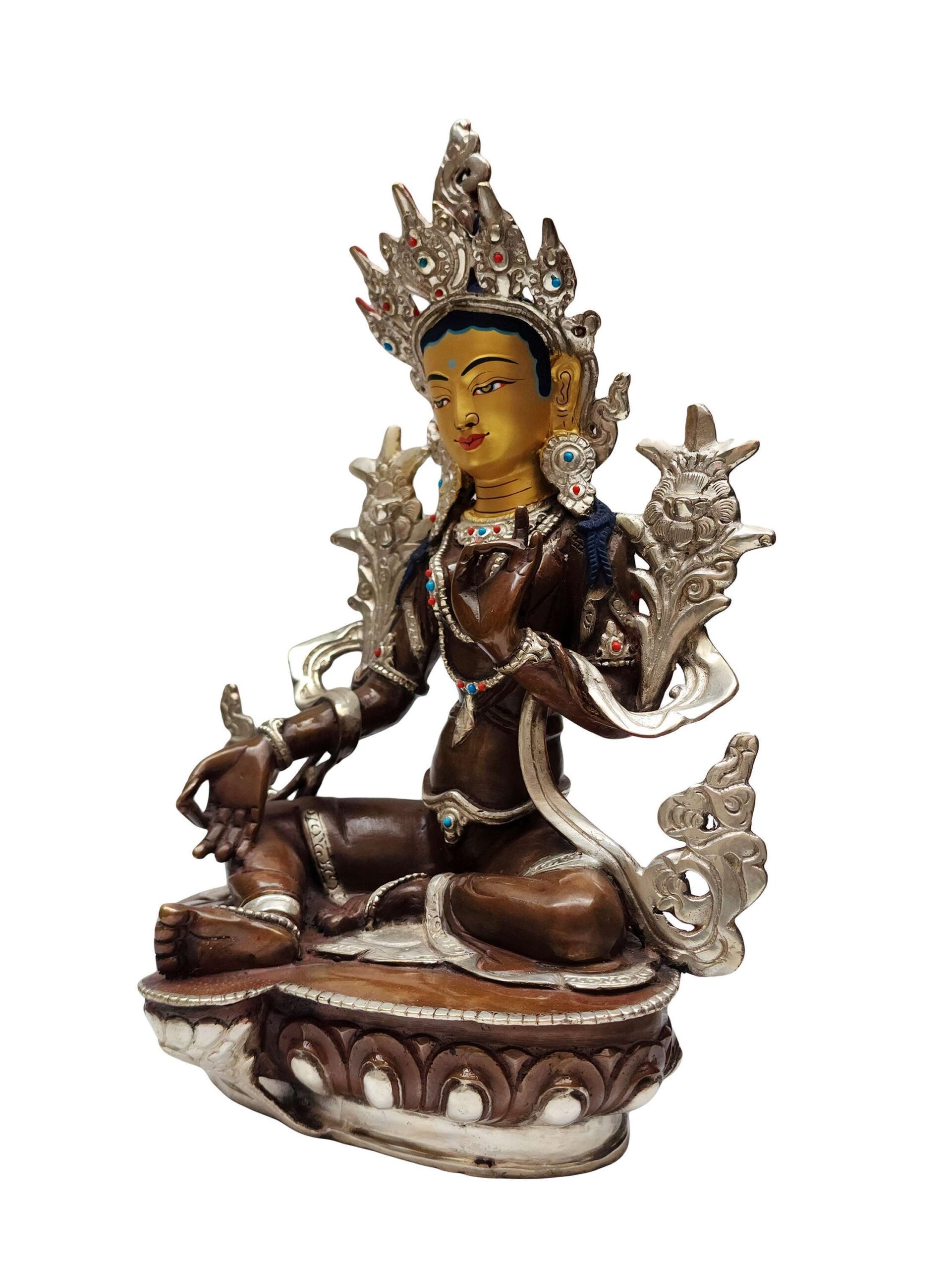 Green Tara Handmade Copper Statue – Silver Plated & Chocolate Oxidized Finish – Gold-Painted Face