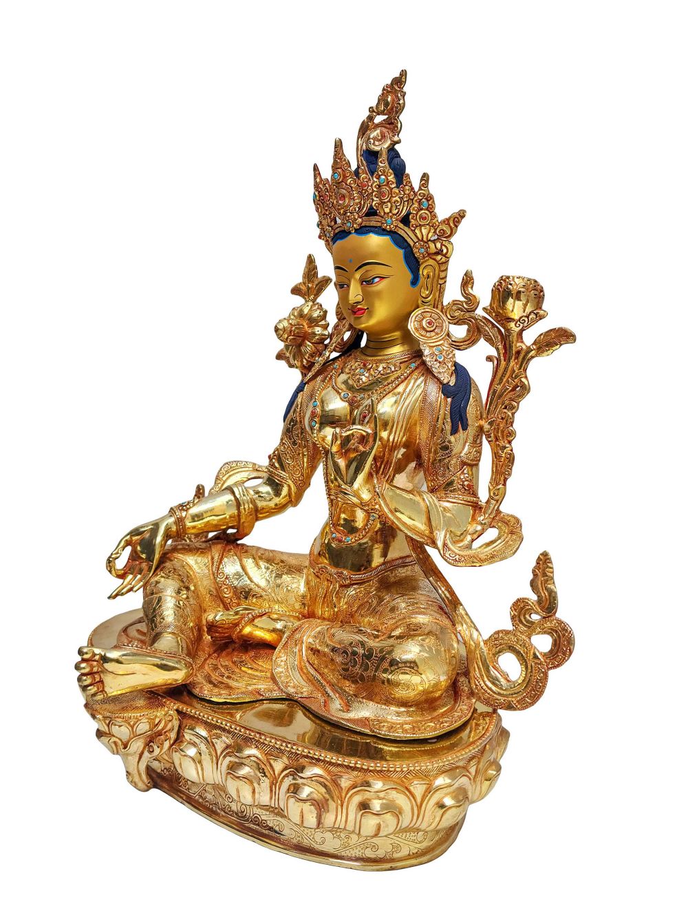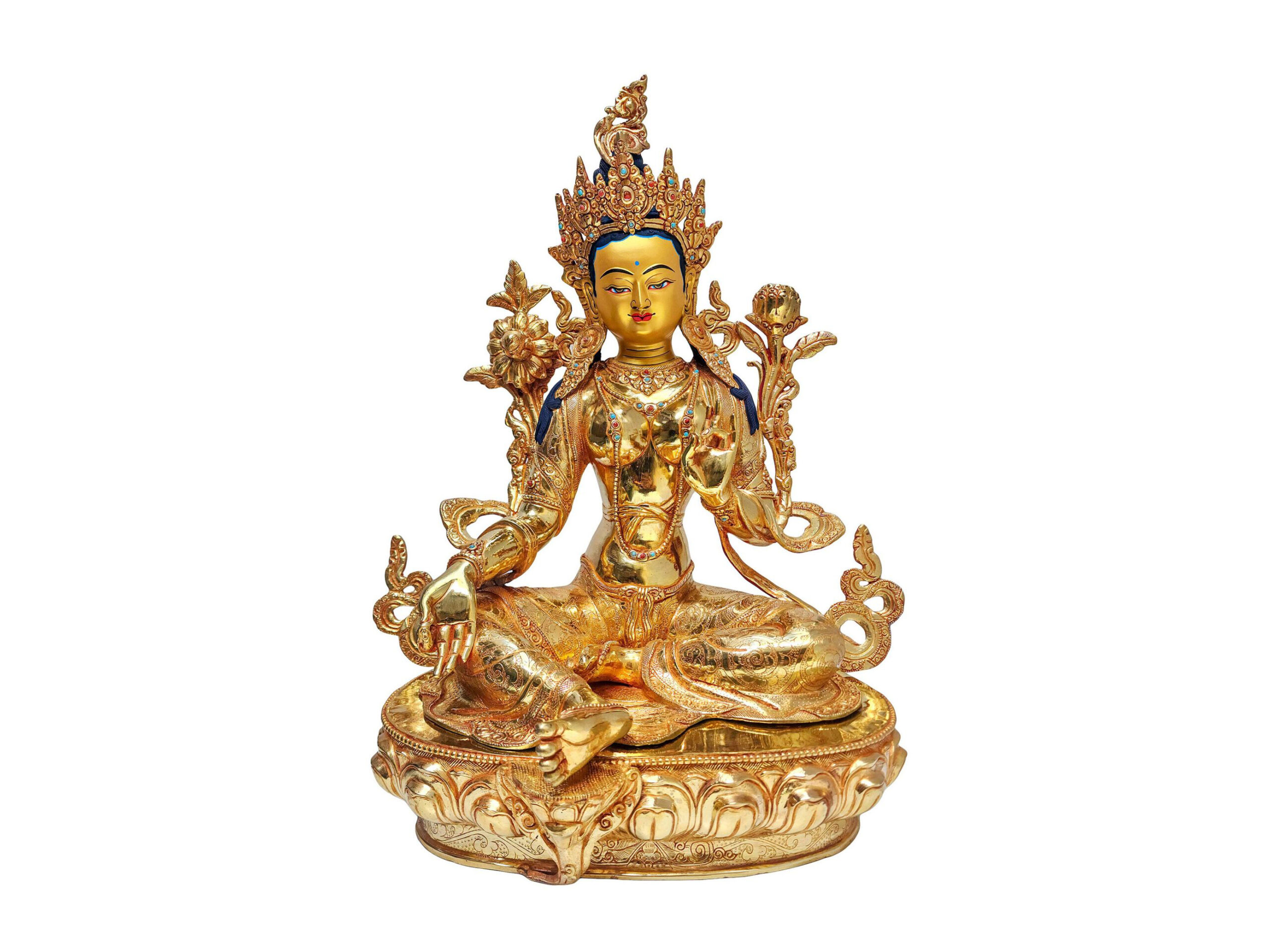 Green Tara Statue – Full Fire Gold Plated, Face Painted, Stone-Set Masterpiece