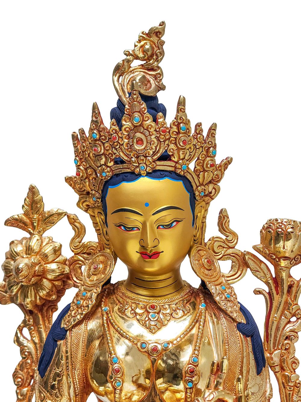 This statue features carefully embedded semi-precious stones such as turquoise, coral, and lapis lazuli, each symbolizing spiritual qualities and chakra energies.