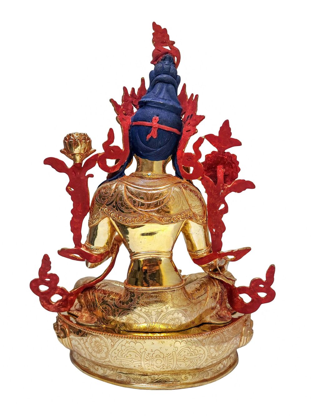 This Green Tara is fully plated using fire gold plating, also known as mercury gold plating, an ancient and authentic Nepali technique. Unlike modern electroplating, fire gold plating uses genuine gold and traditional methods, resulting in:
