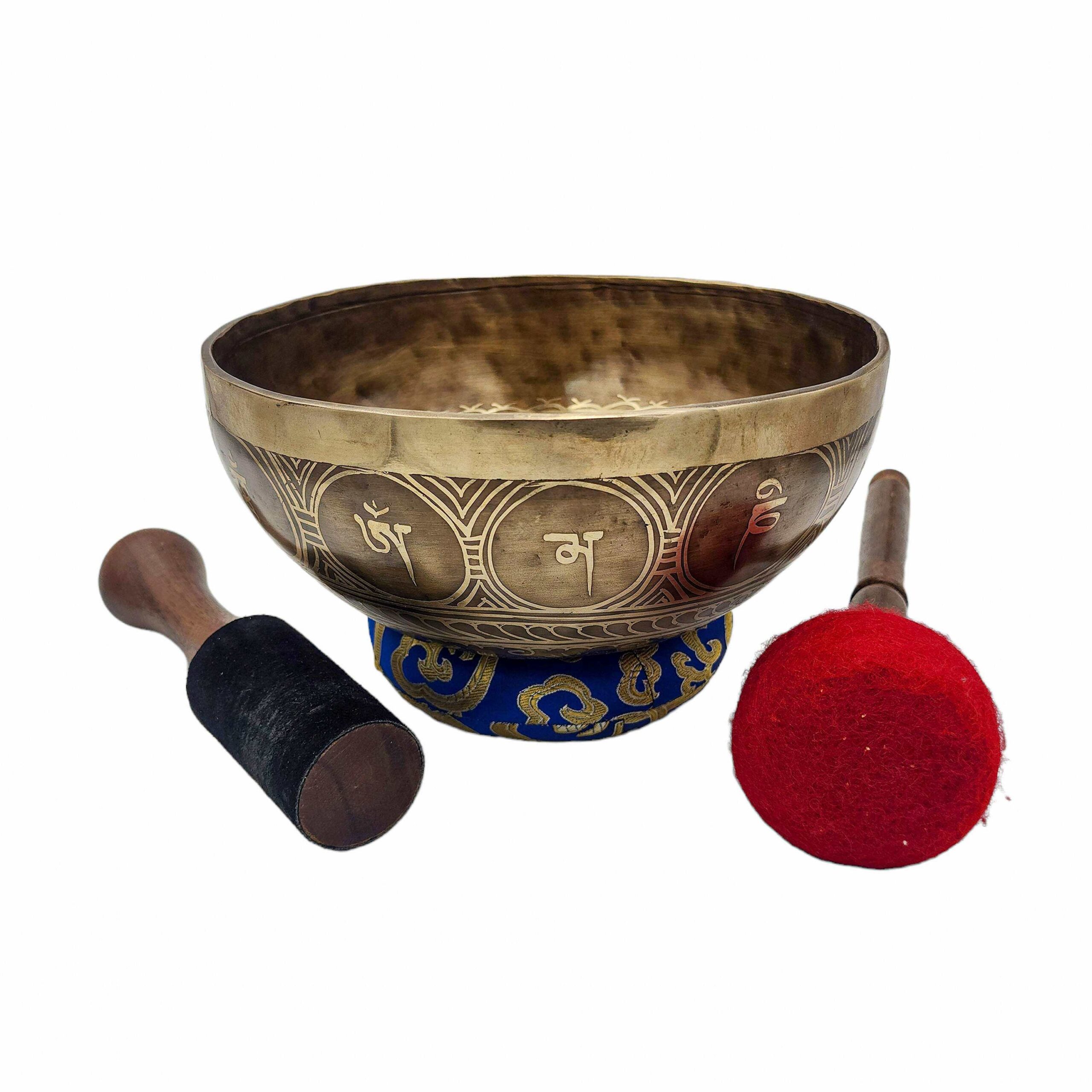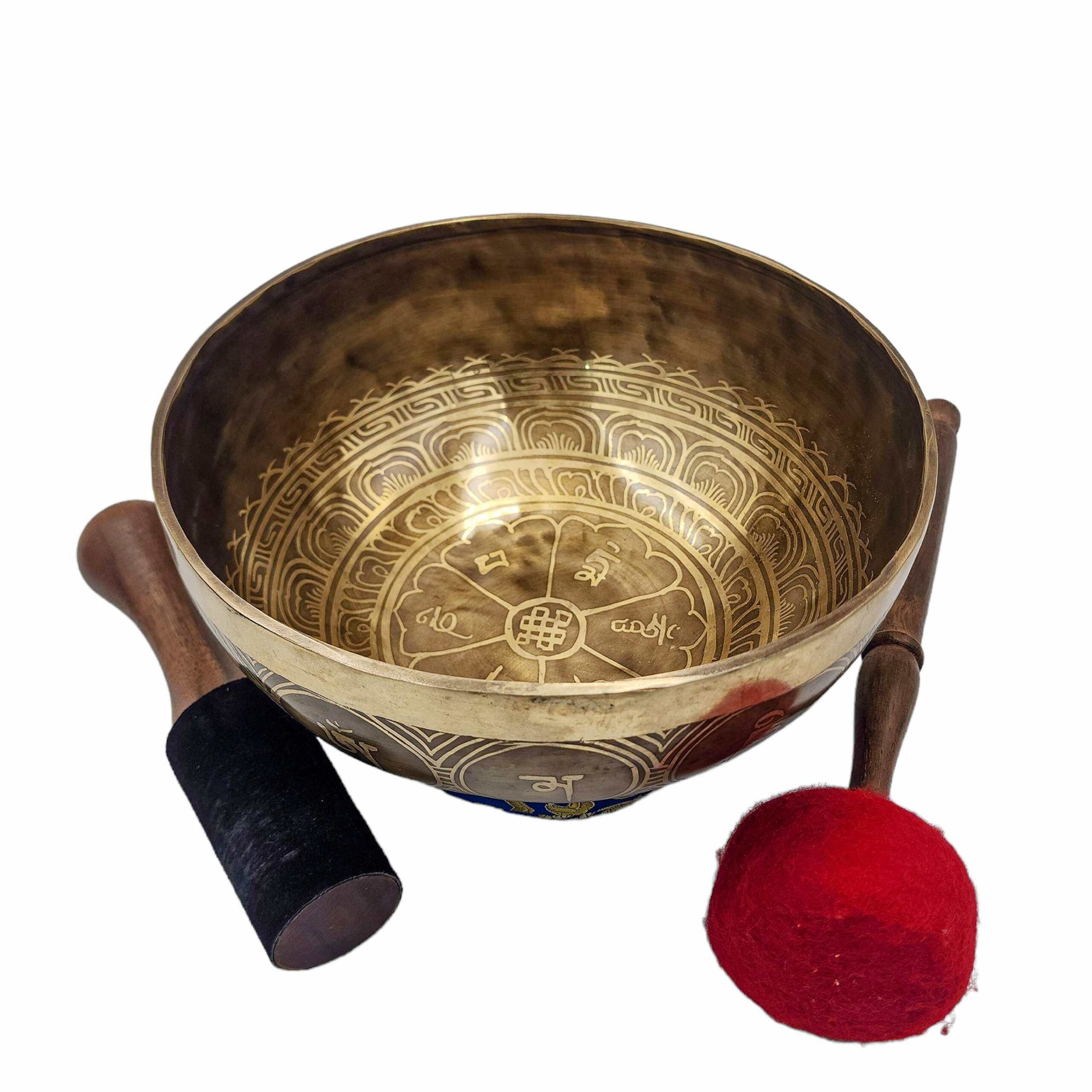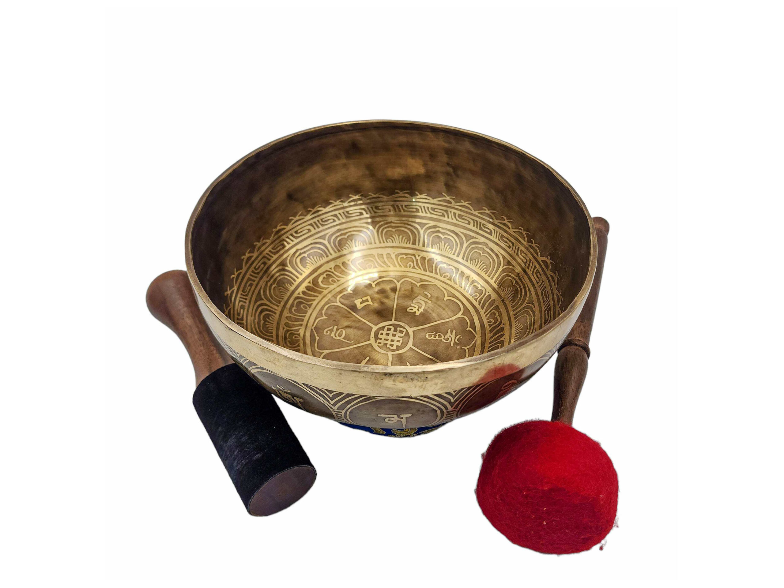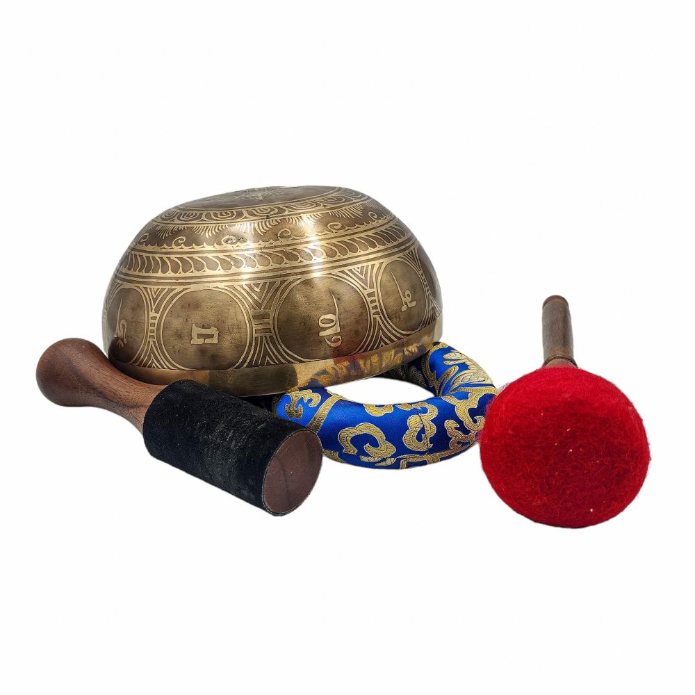 Crafted from a sacred seven-metal bronze alloy, this hand-beaten singing bowl features fine etching details that enhance its visual and spiritual presence. Ideal for meditation, sound therapy, or sacred decor, it offers a deep, harmonious tone and exquisite craftsmanship.