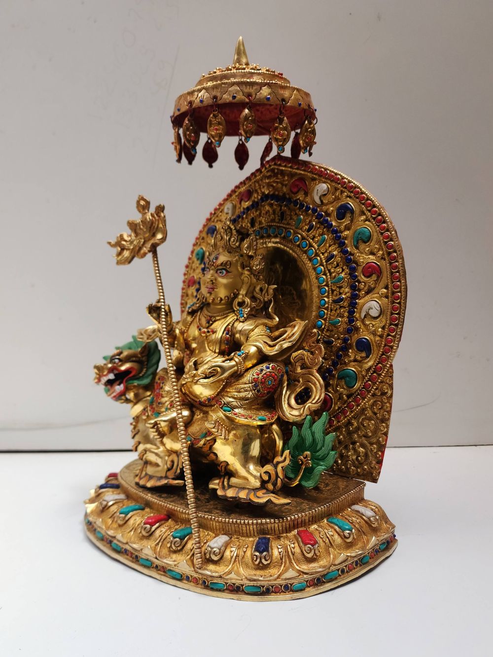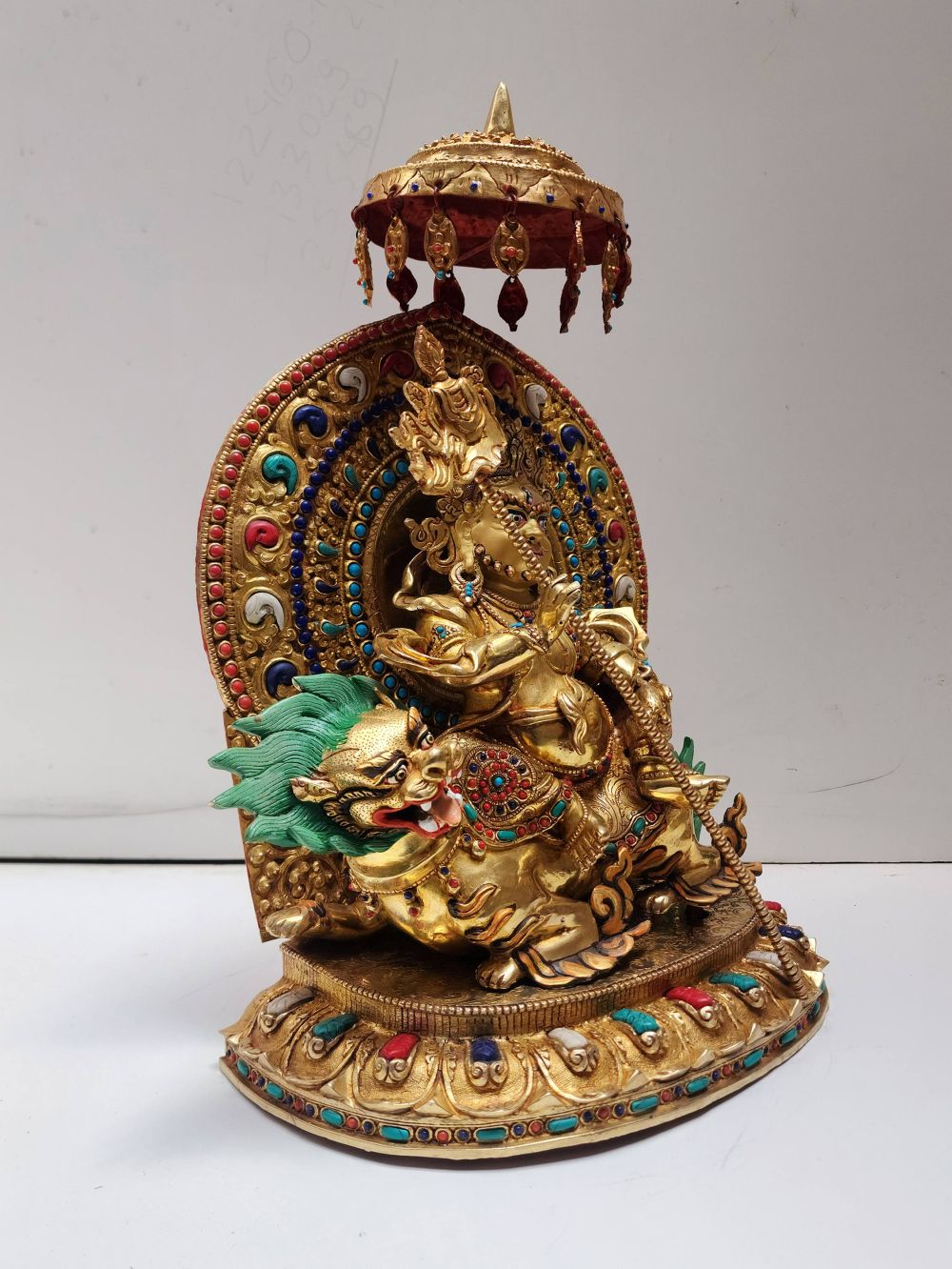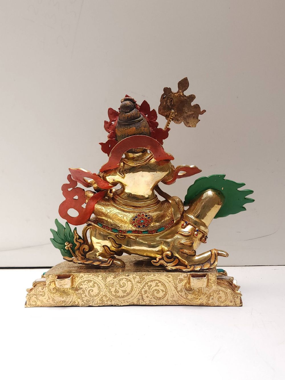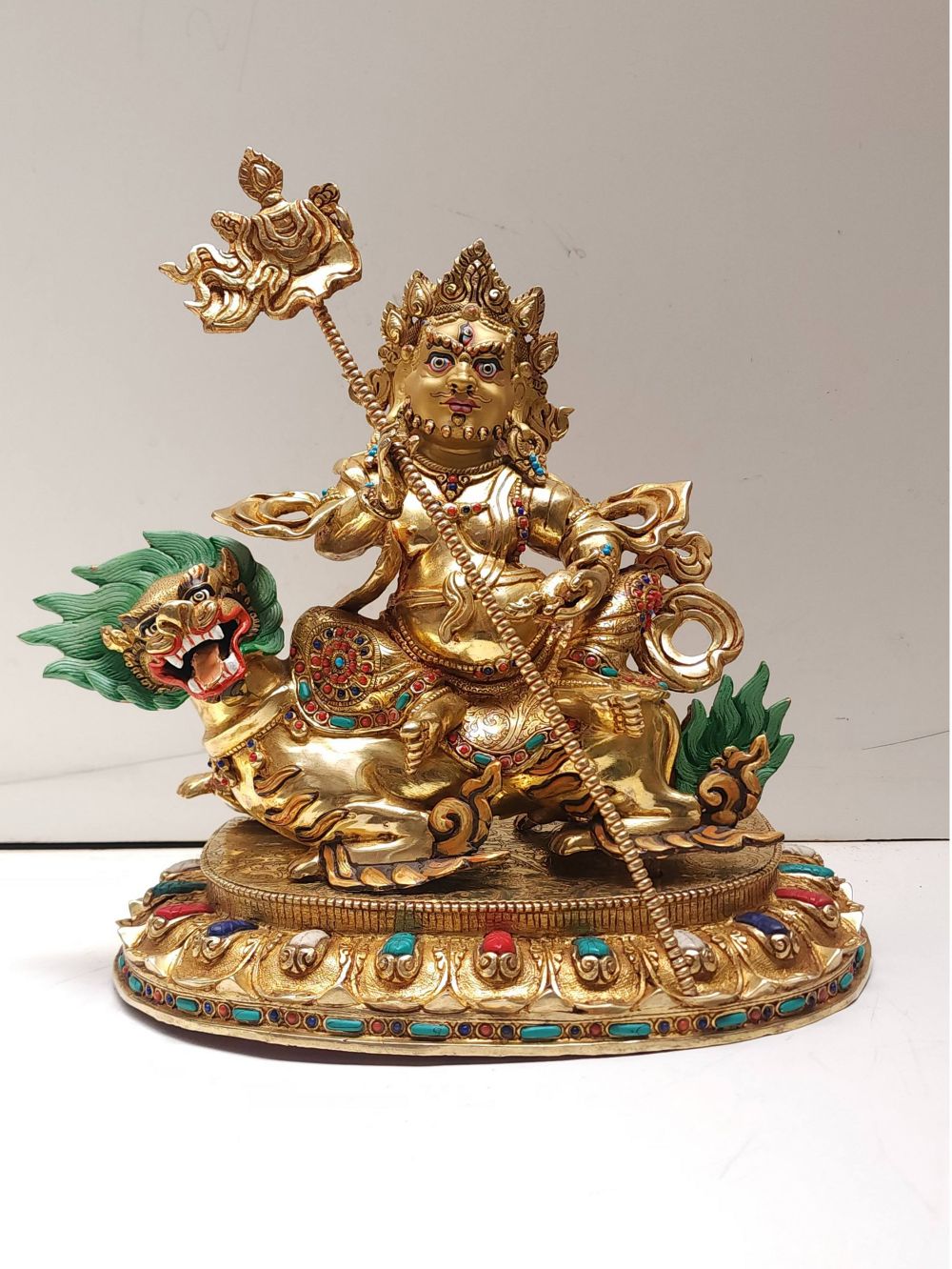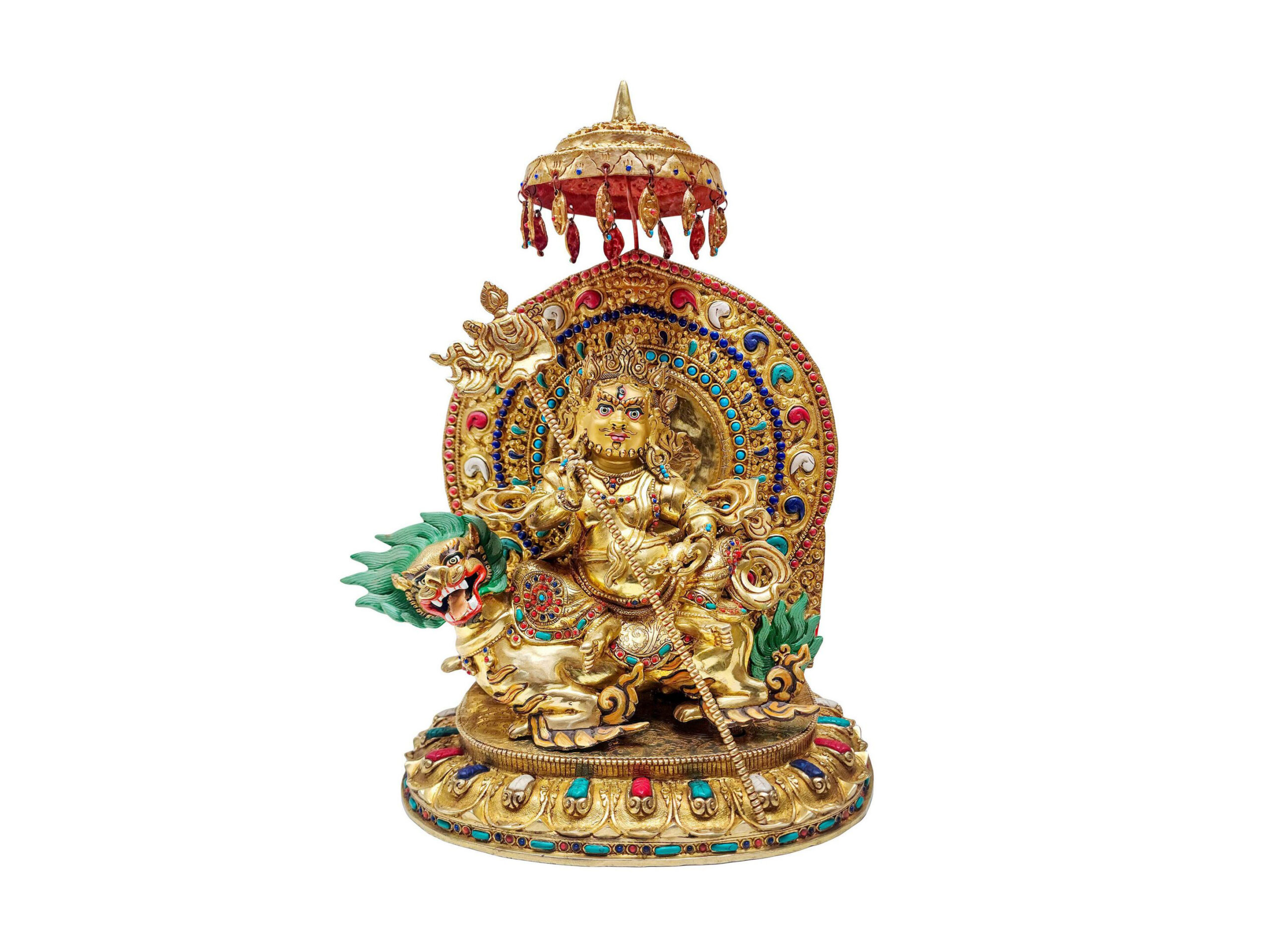 Handmade Buddhist Statue of Singha Kuber (Jambhala Namtose) on Throne – Fire Gold Plated | Stone Inlaid | Face Painted