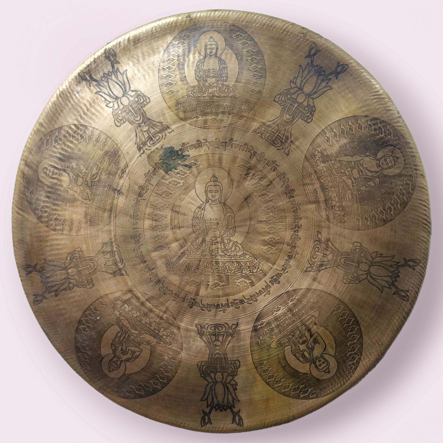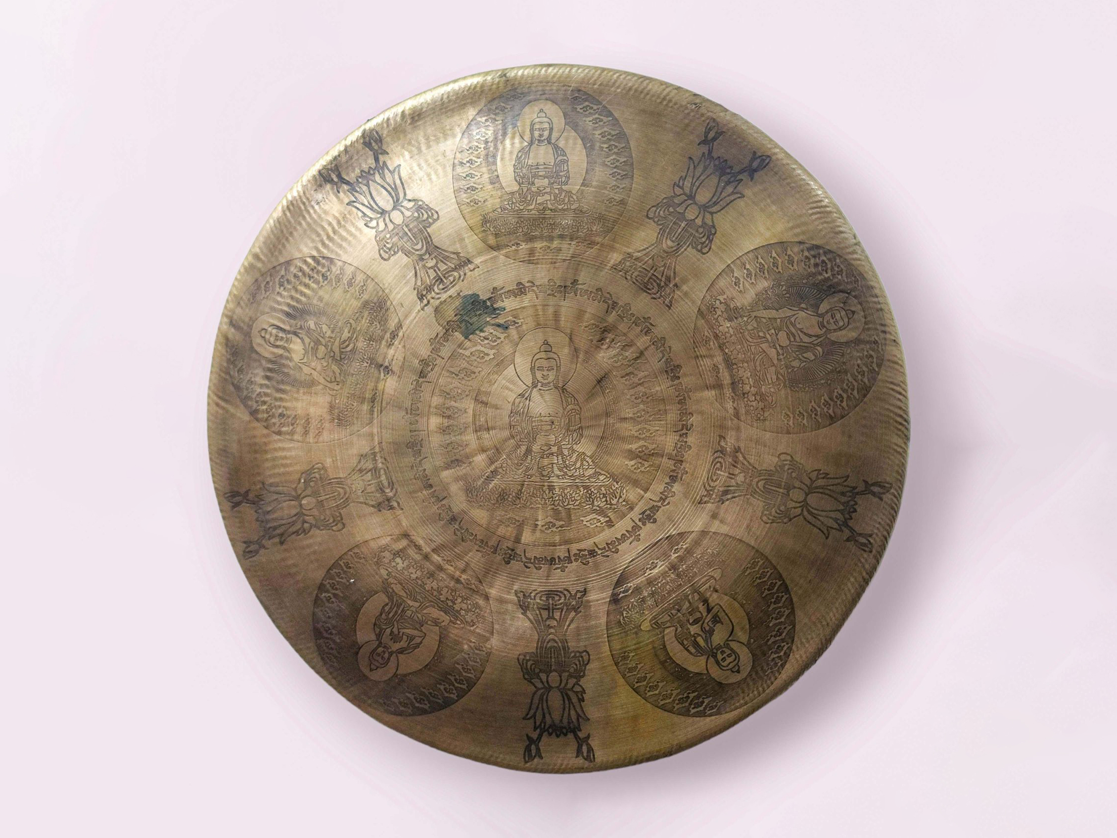 This particular gong is distinguished by its hand-etched design of the Pancha Buddha (Five Dhyani Buddhas), representing wisdom and the purification of negative energies. This etching enhances both the spiritual value and aesthetic appeal of the gong, making it ideal for meditation rooms, healing spaces, or cultural display.