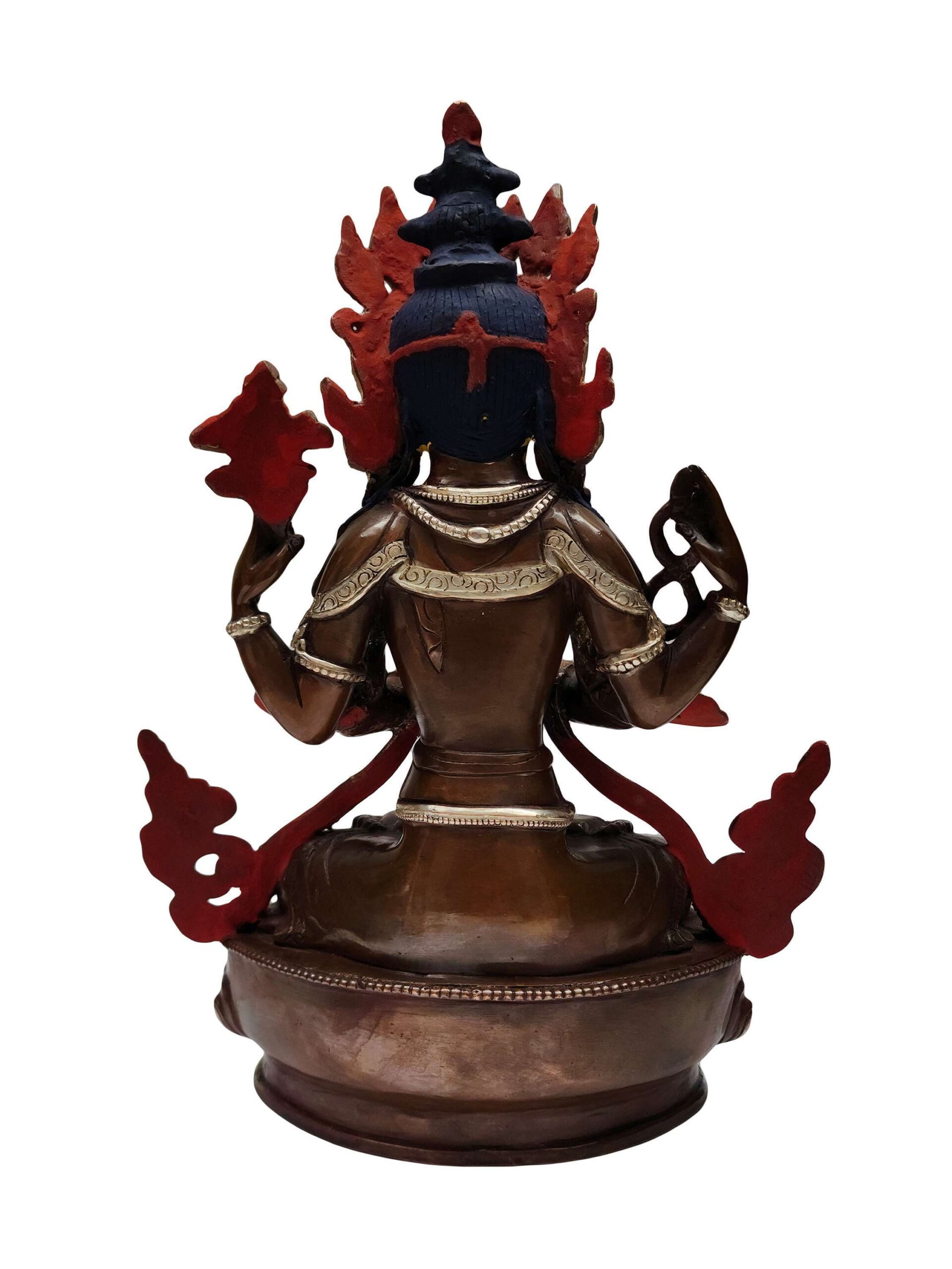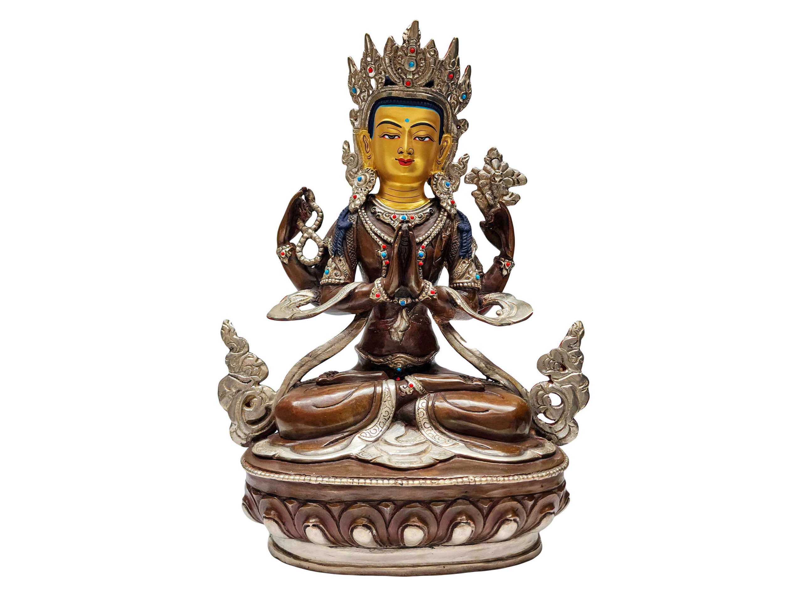 This Chenrezig statue showcases a striking dual-tone finish—partly silver plated and chocolate oxidized. The silver plating highlights key details with a reflective brilliance, while the deep chocolate oxidation provides rich contrast and depth, enhancing the sculptural contours. This artisanal technique results in a dynamic and timeless appearance that beautifully balances light and shadow.